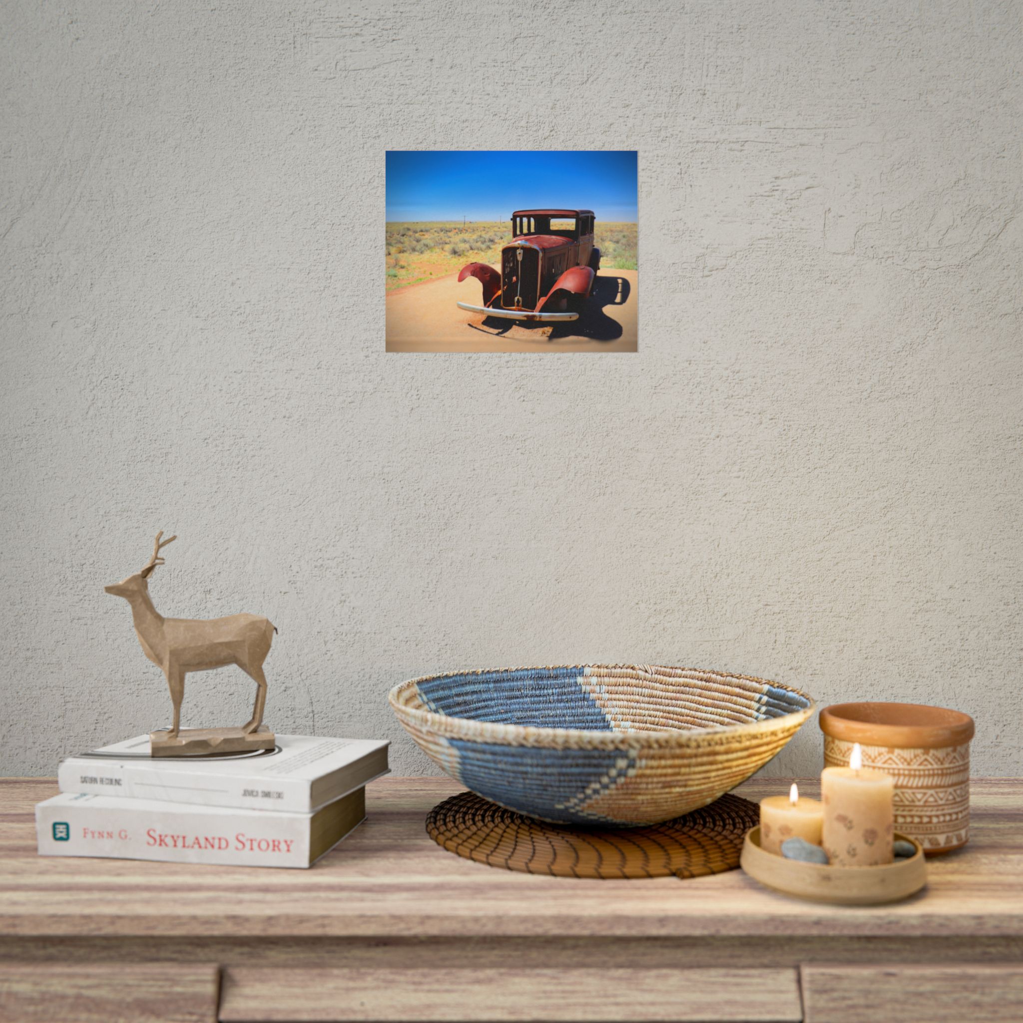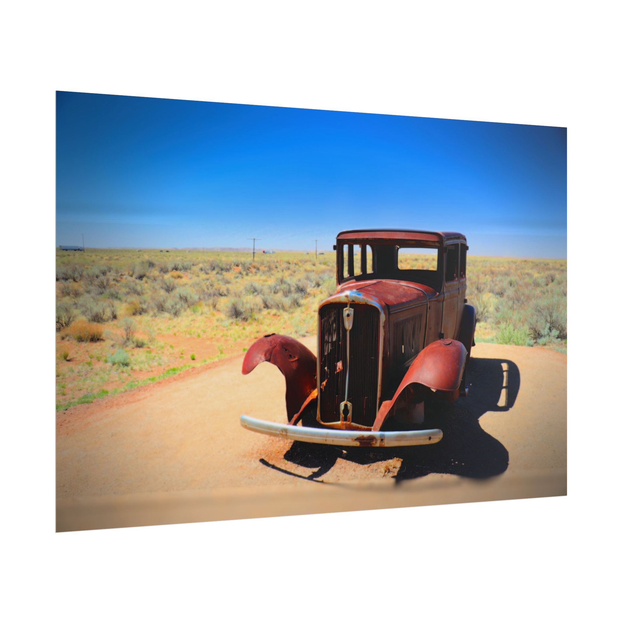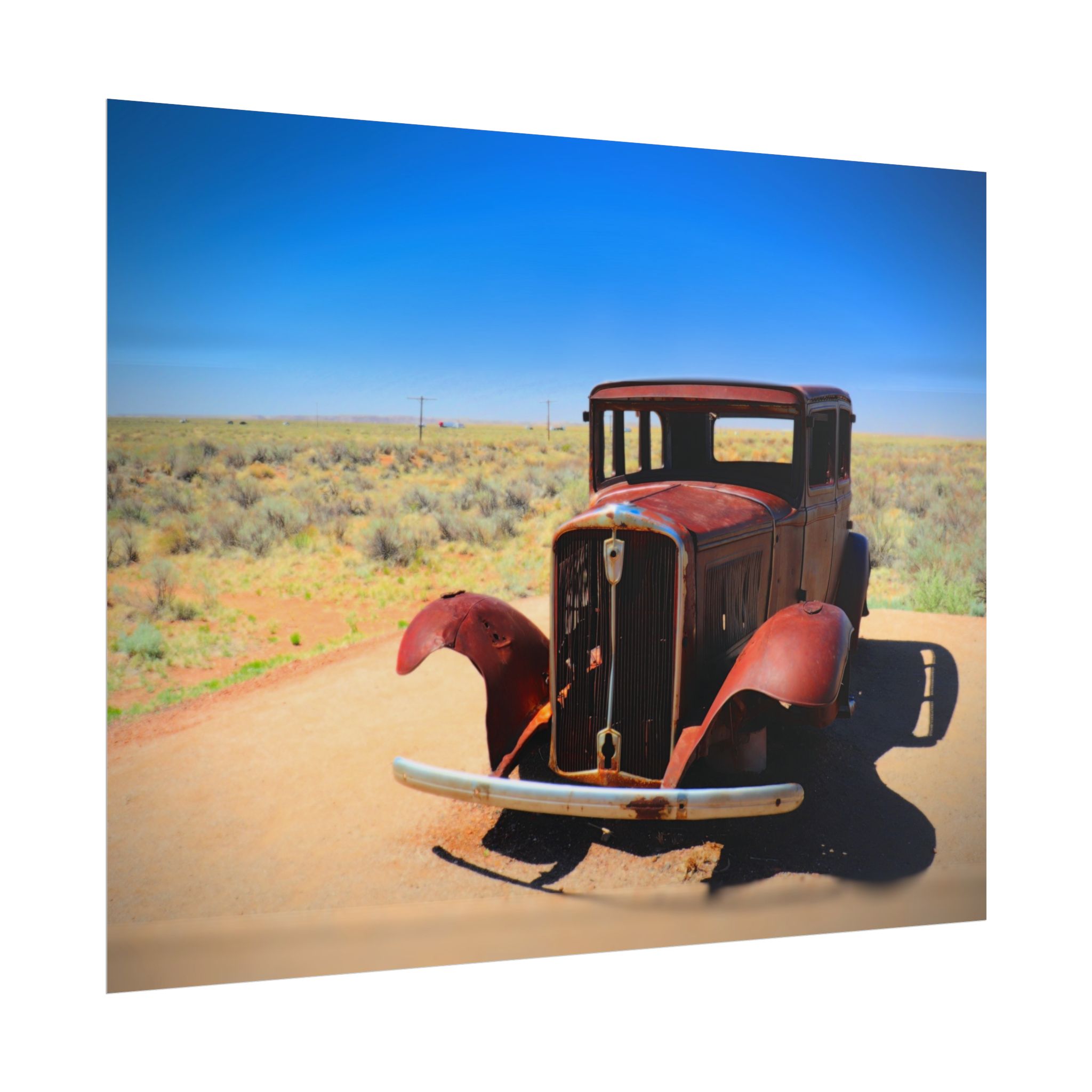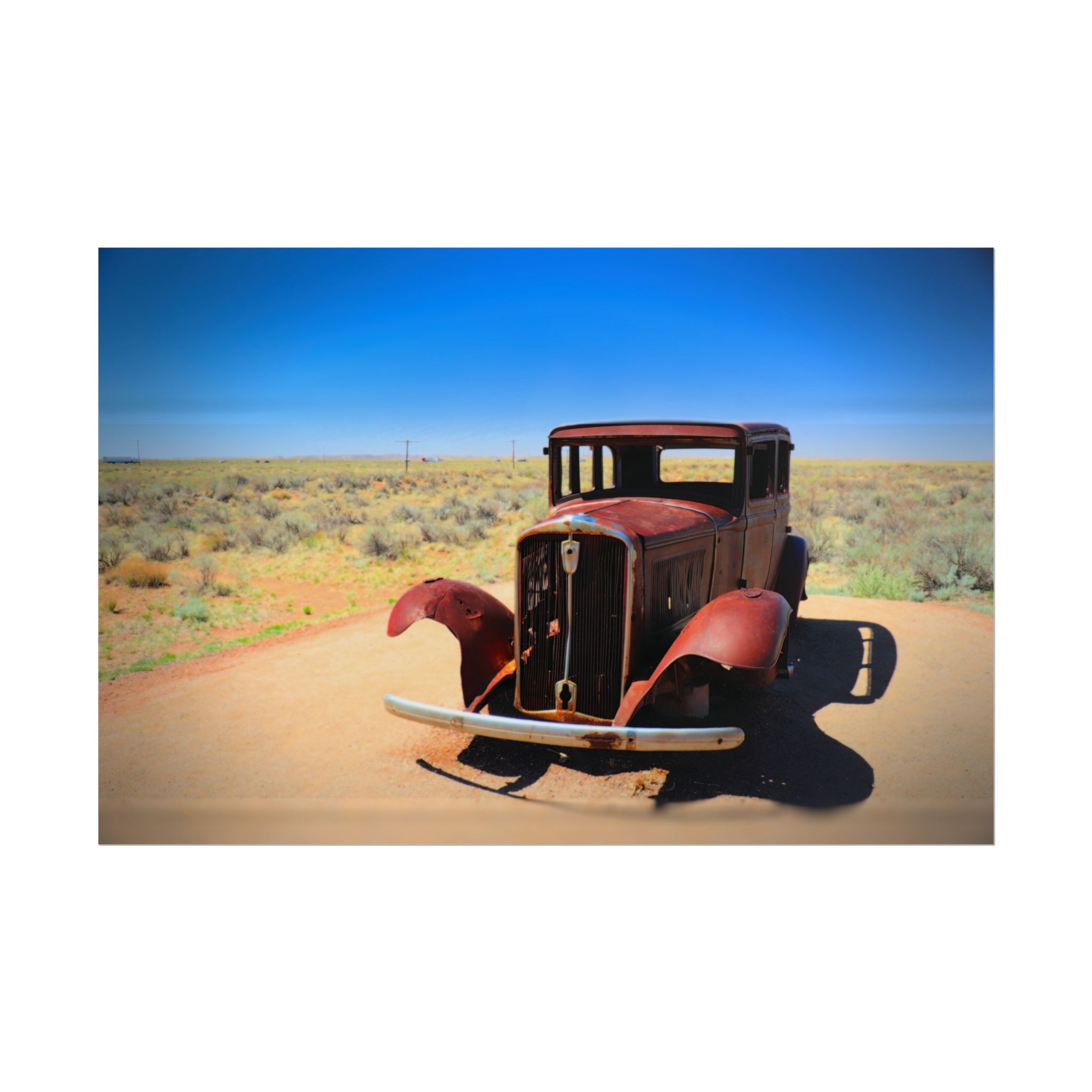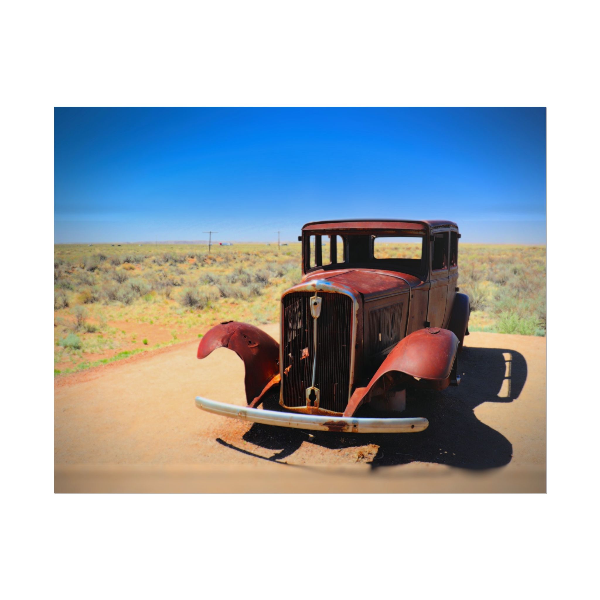 Step back in time with this matte print of an antique car resting along the legendary Route 66 near Holbrook, Arizona. Bathed in bright desert sunlight, the weathered metal and open fenders tell stories of road trips past, while the endless blue sky and open landscape evoke the freedom of the open road.
