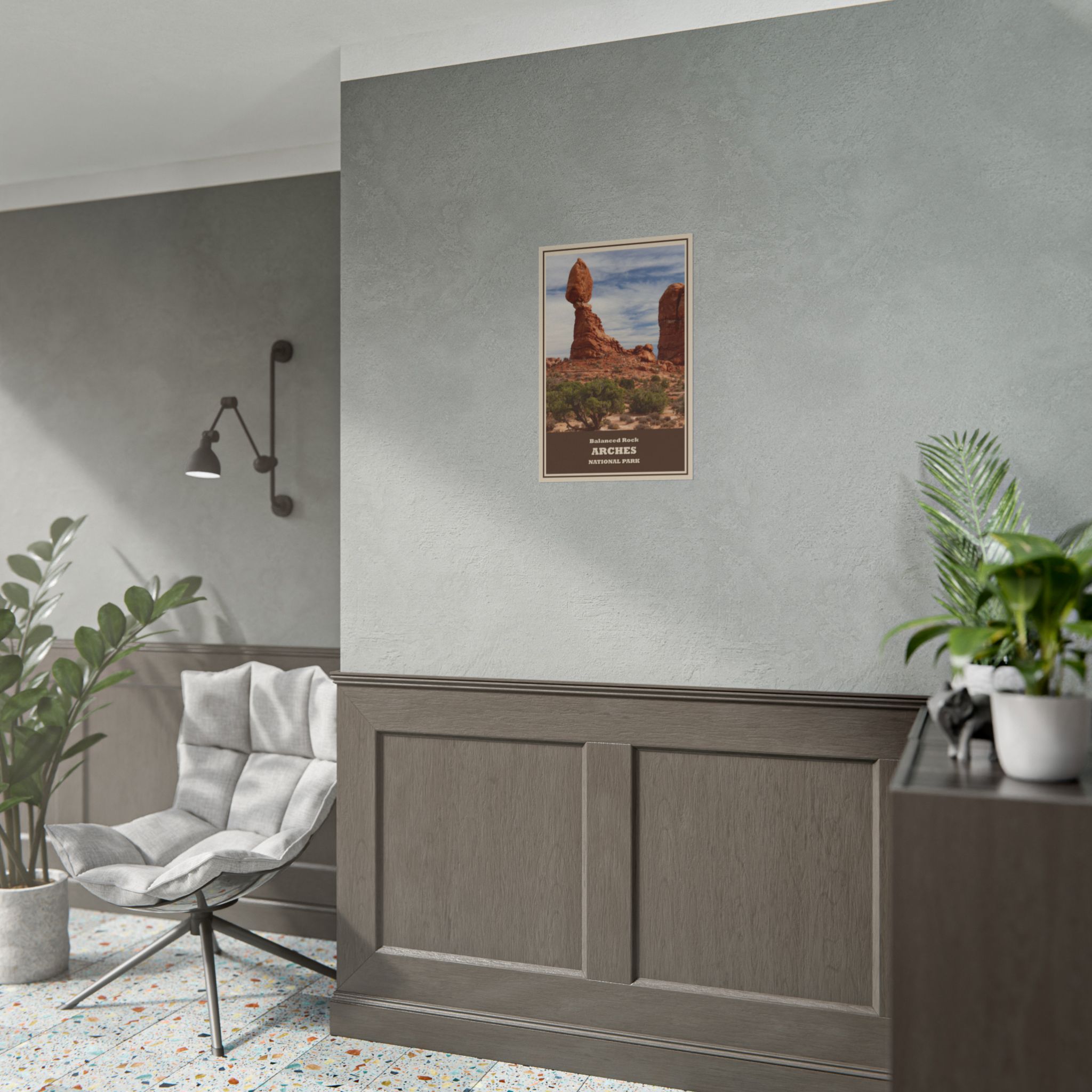Stand in awe of Utah’s breathtaking red rock desert with this vintage-style travel poster featuring the iconic Balanced Rock in Arches National Park. One of the park’s most photographed landmarks, this massive sandstone boulder appears impossibly perched on a slender pedestal, symbolizing the raw beauty and wonder of America’s Southwest.