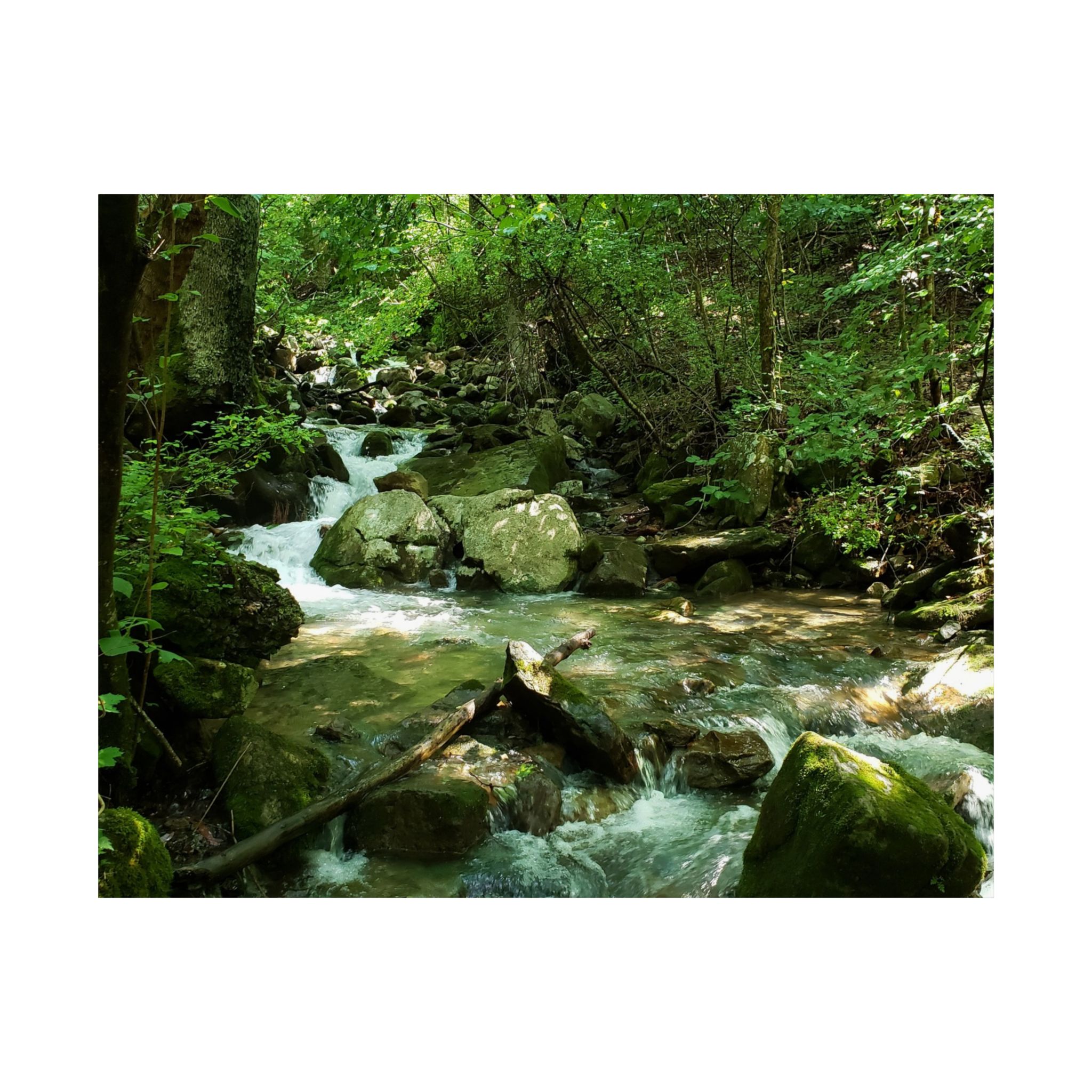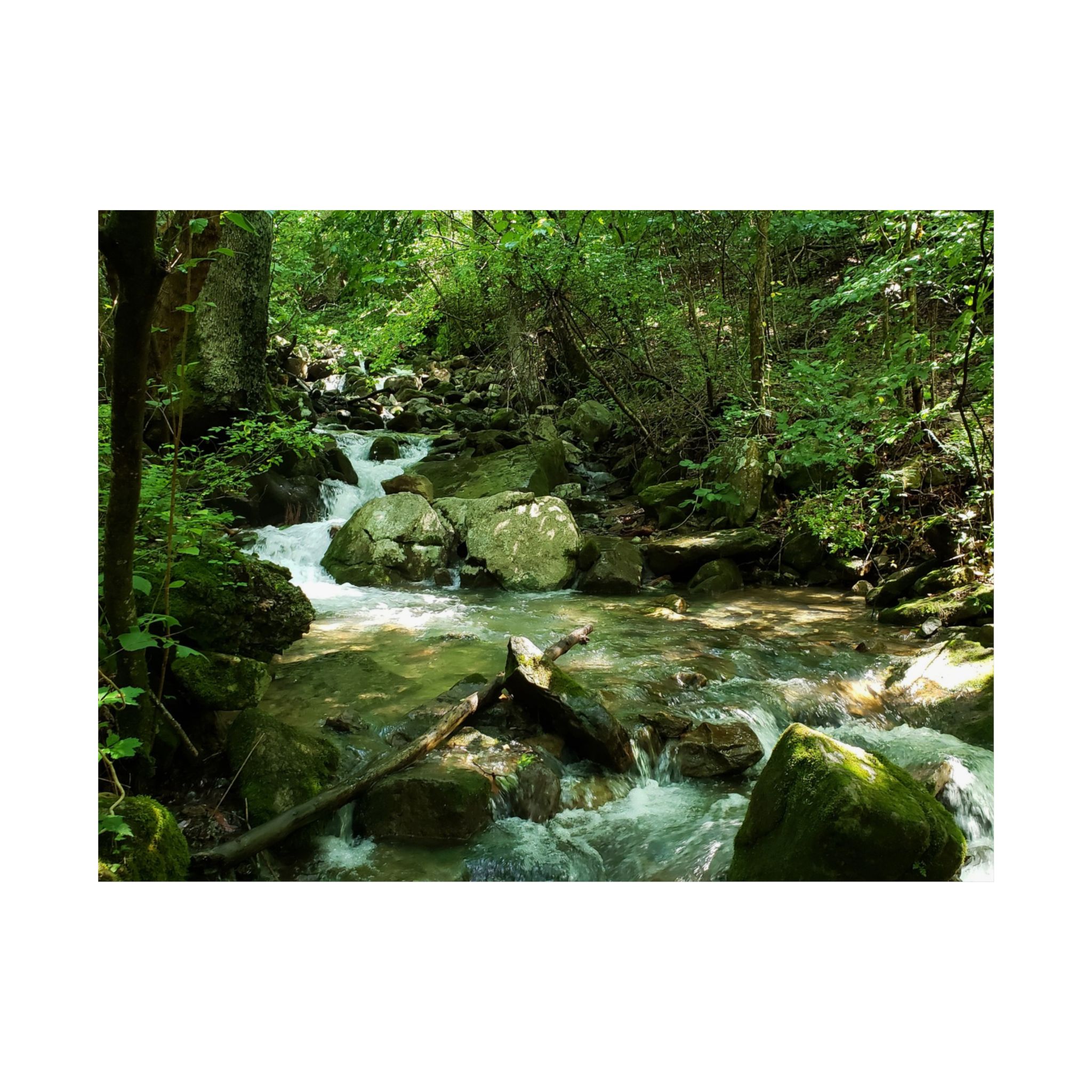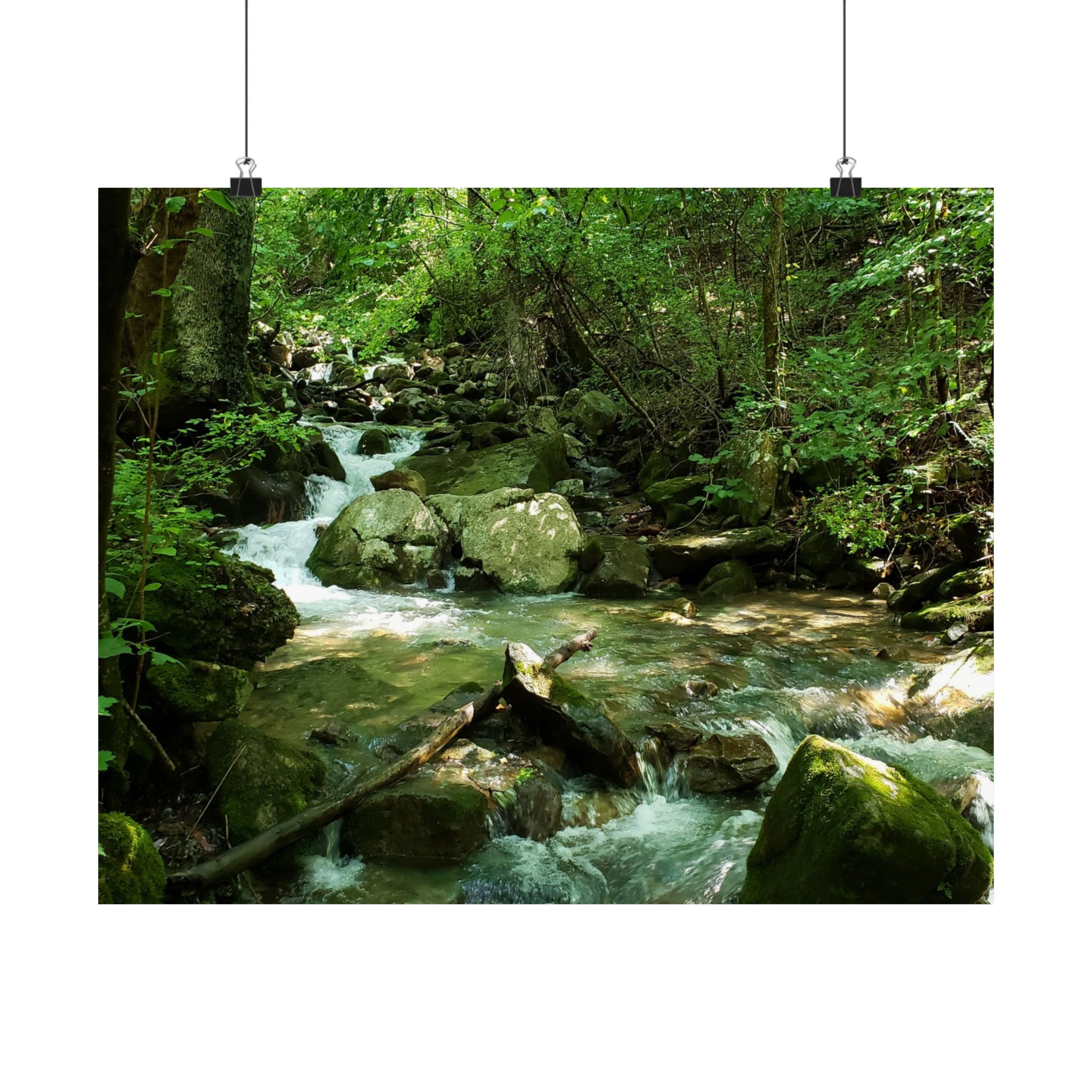 This fine art photograph showcases the peaceful beauty of a mountain stream nestled within the forests of Cumberland Gap, Tennessee. The rushing water over mossy stones framed by dense trees captures the natural wonder of the Appalachian region, making it an inspiring addition to your home or office.
