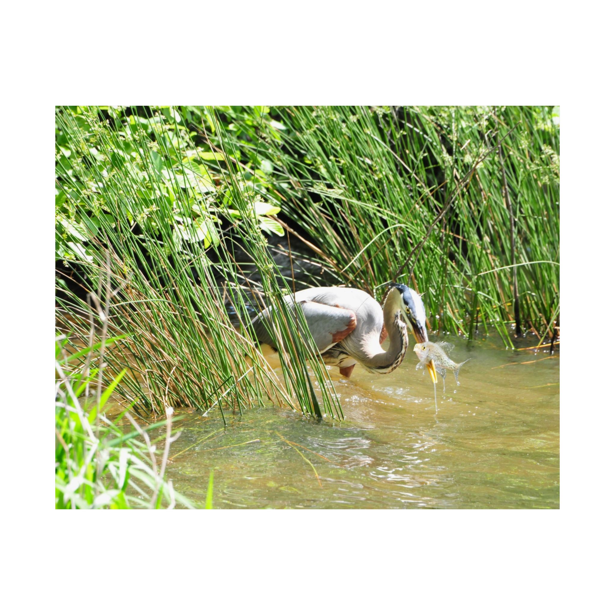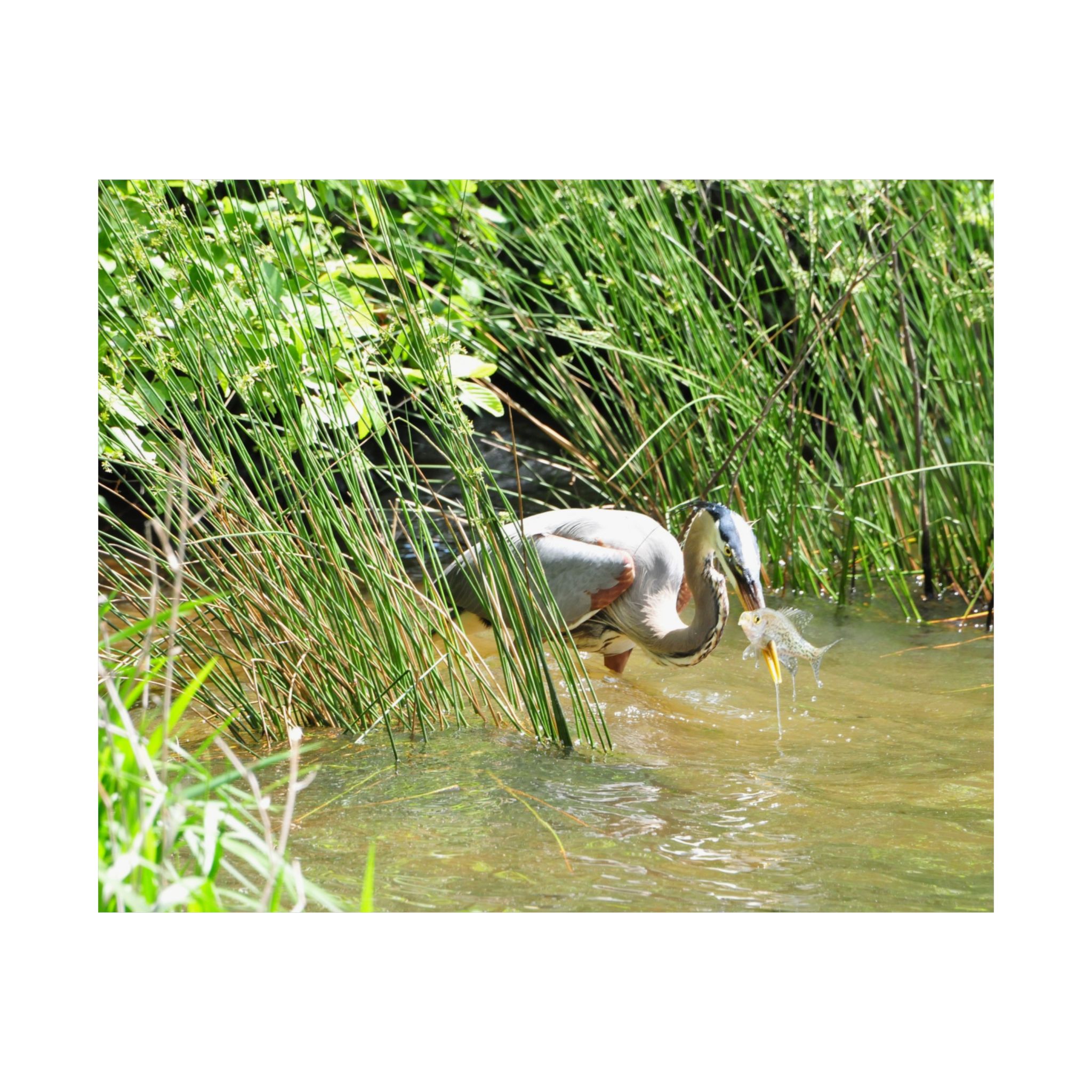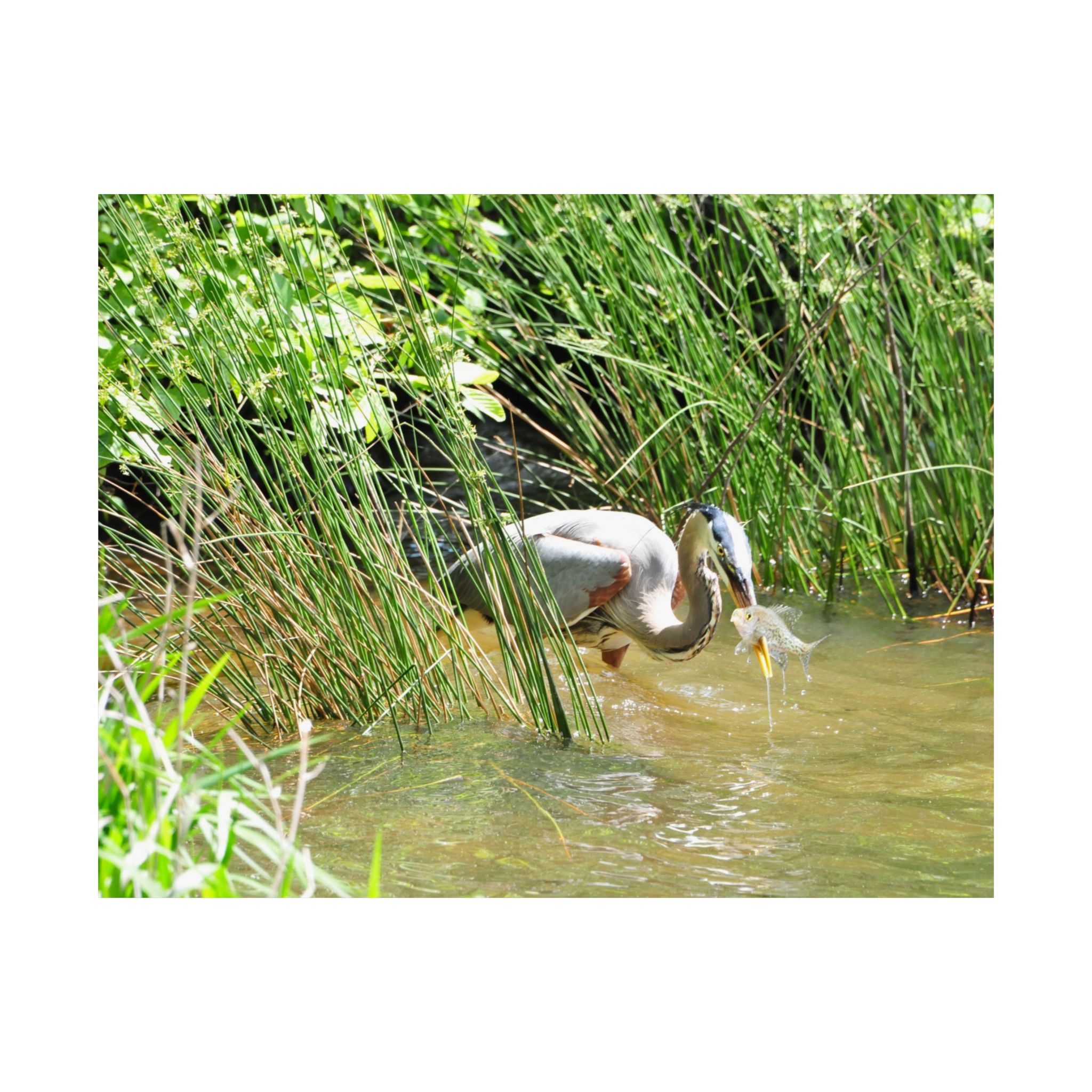 This museum-quality fine art print captures the timeless elegance of a Great Blue Heron in the wetlands of Eastern North Carolina. Emerging from tall grasses with a freshly caught fish, the heron embodies the raw beauty of survival in the wild. Every feather, water droplet, and ripple is presented in stunning detail, bringing the viewer closer to the natural world.
