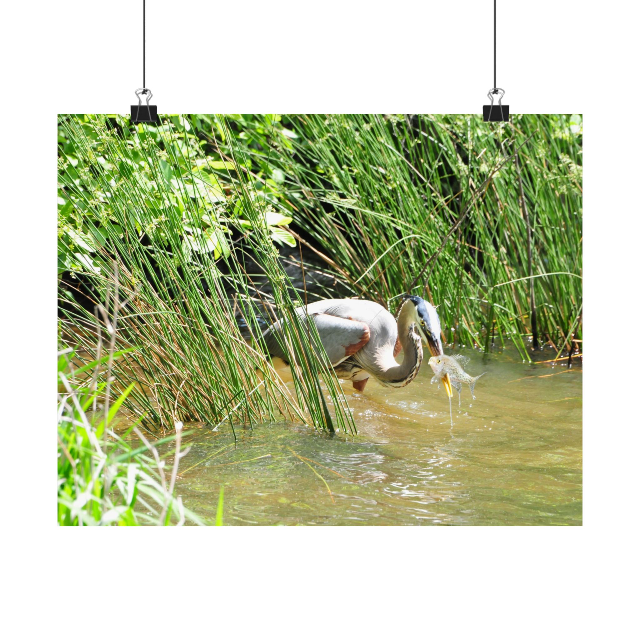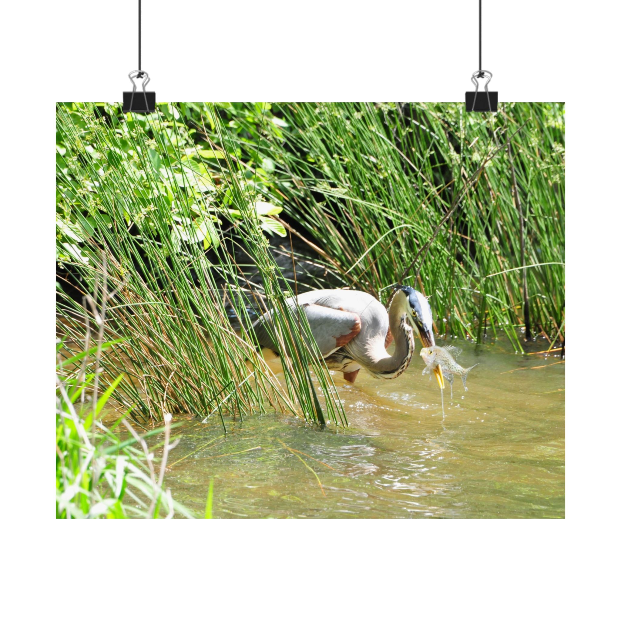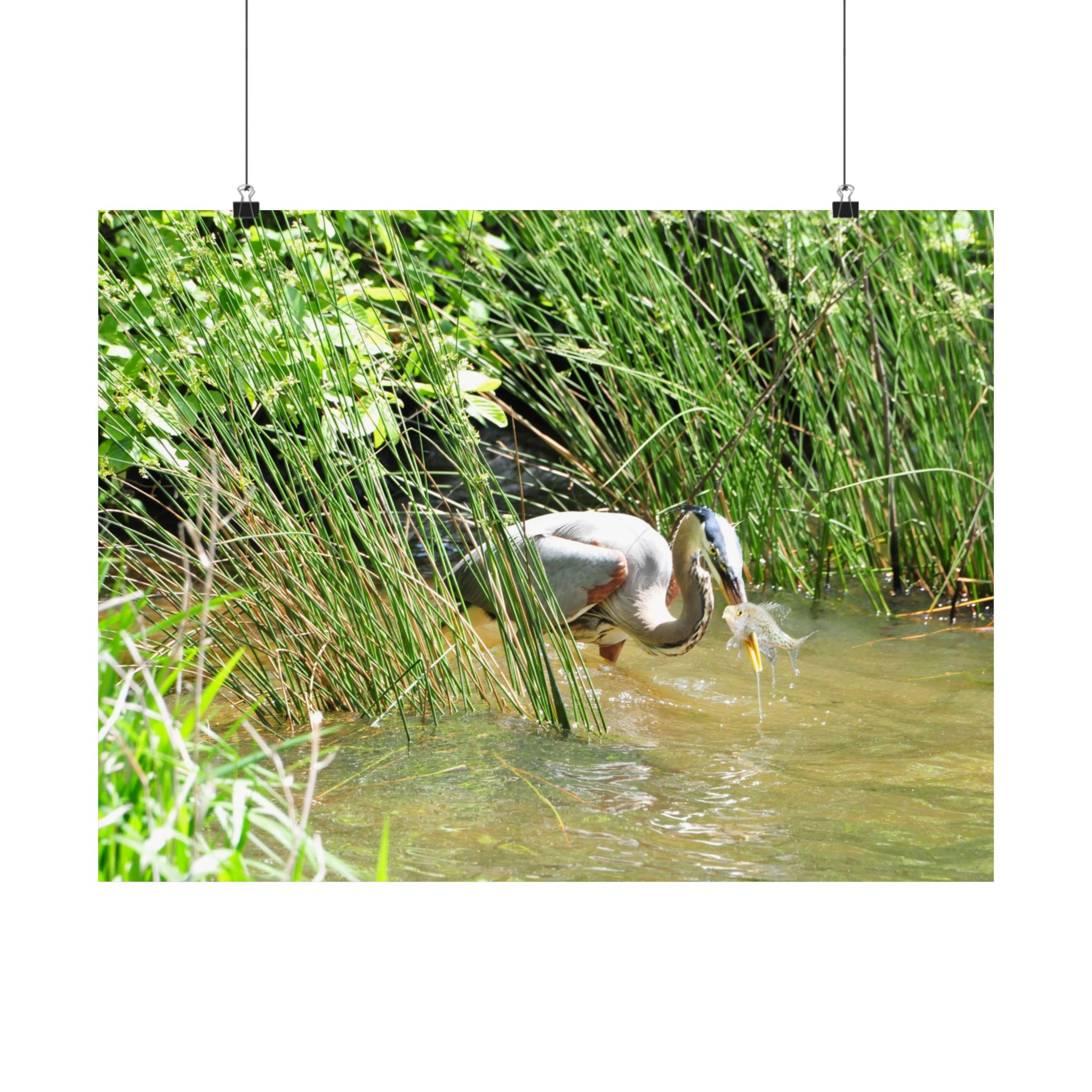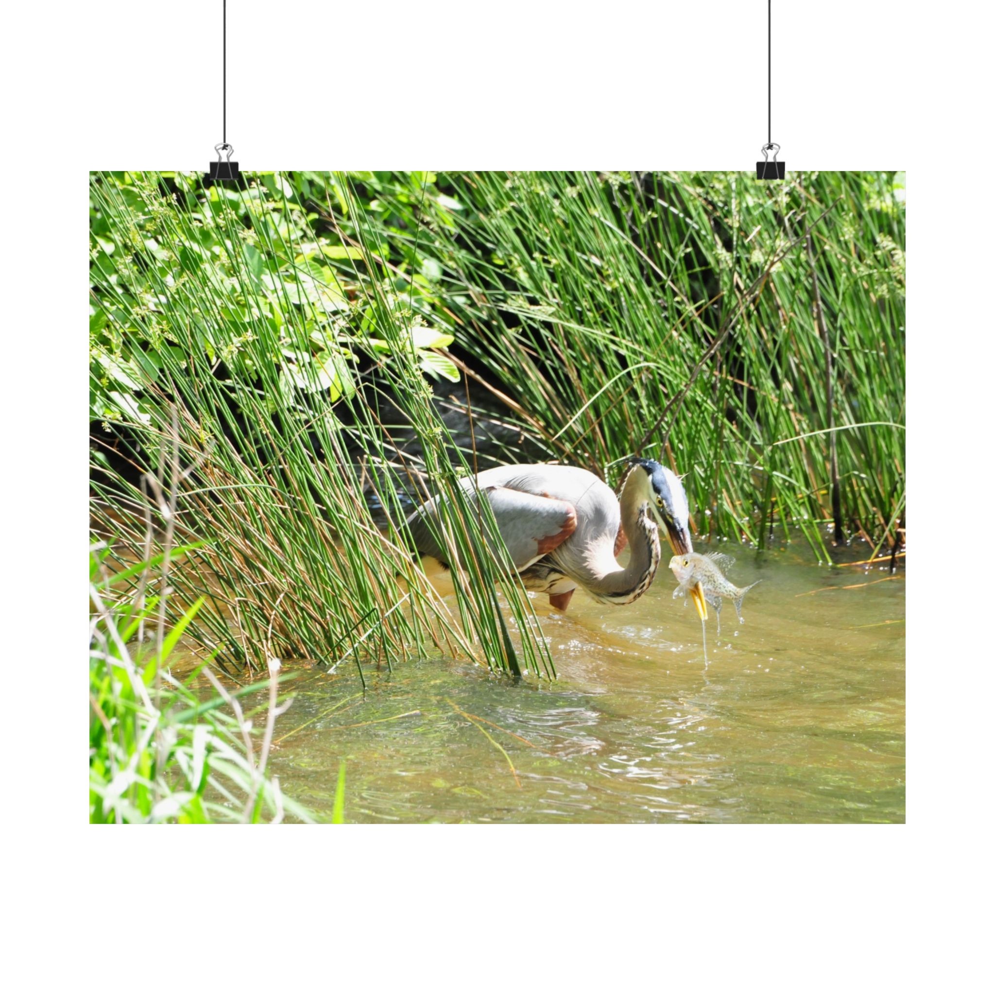 This museum-quality fine art print captures the timeless elegance of a Great Blue Heron in the wetlands of Eastern North Carolina. Emerging from tall grasses with a freshly caught fish, the heron embodies the raw beauty of survival in the wild. Every feather, water droplet, and ripple is presented in stunning detail, bringing the viewer closer to the natural world.