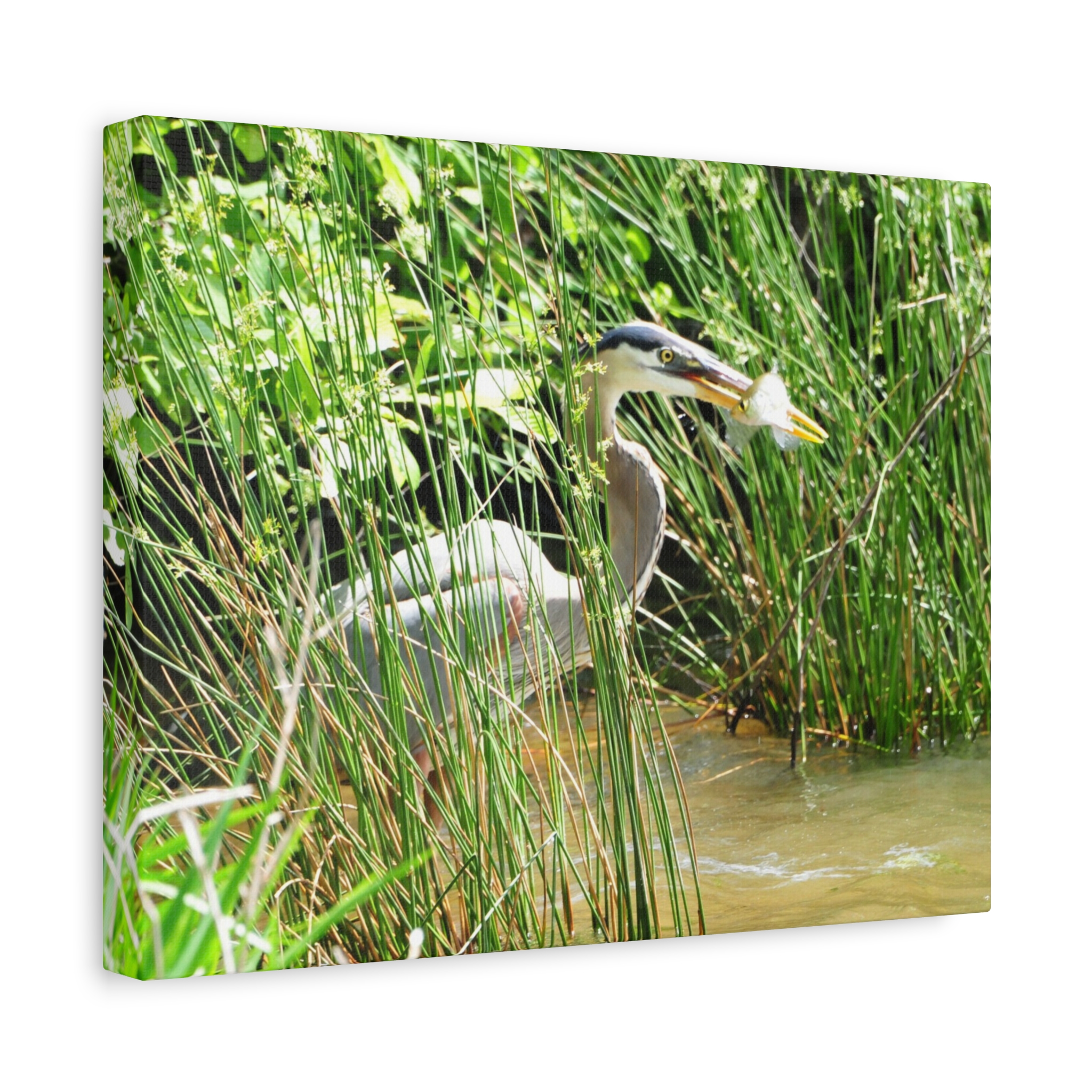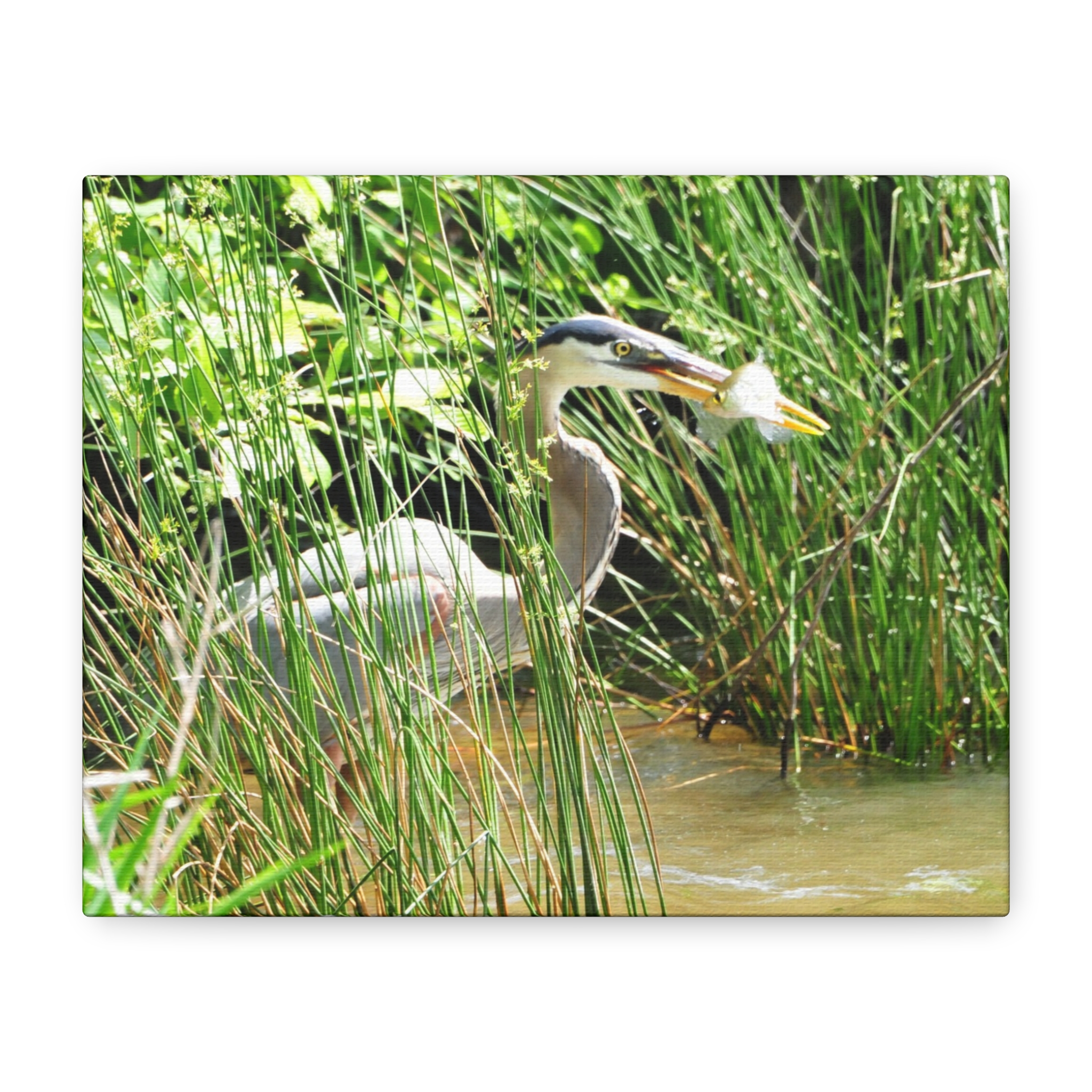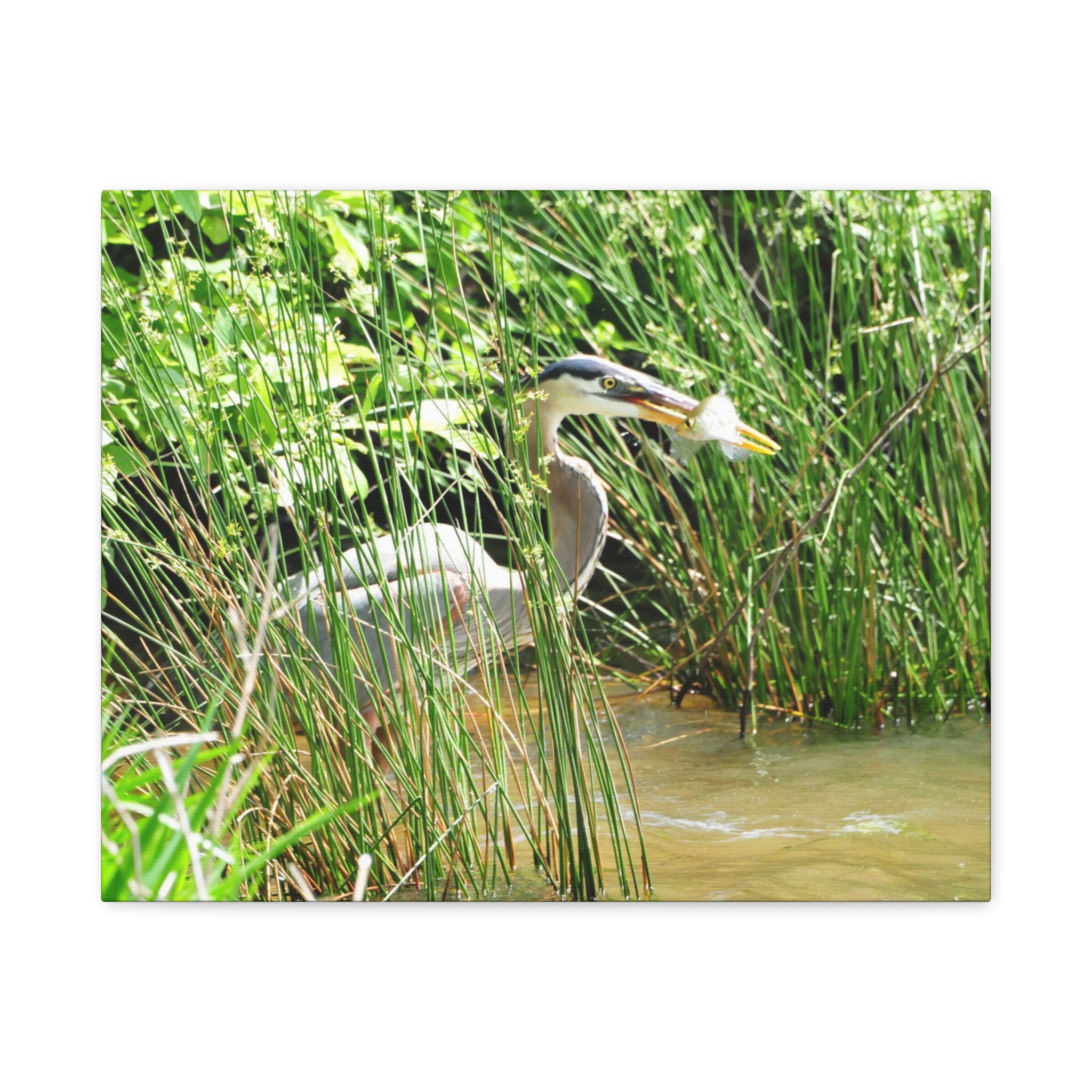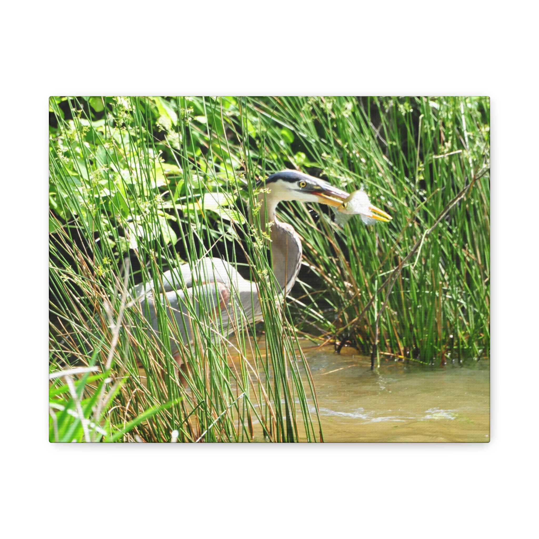 Bring the wetlands of Eastern North Carolina into your home with this wrapped canvas featuring a Great Blue Heron striking its prey among the reeds. The vivid greens, water reflections, and sharp detail of the heron’s catch create a bold, natural centerpiece for your space.