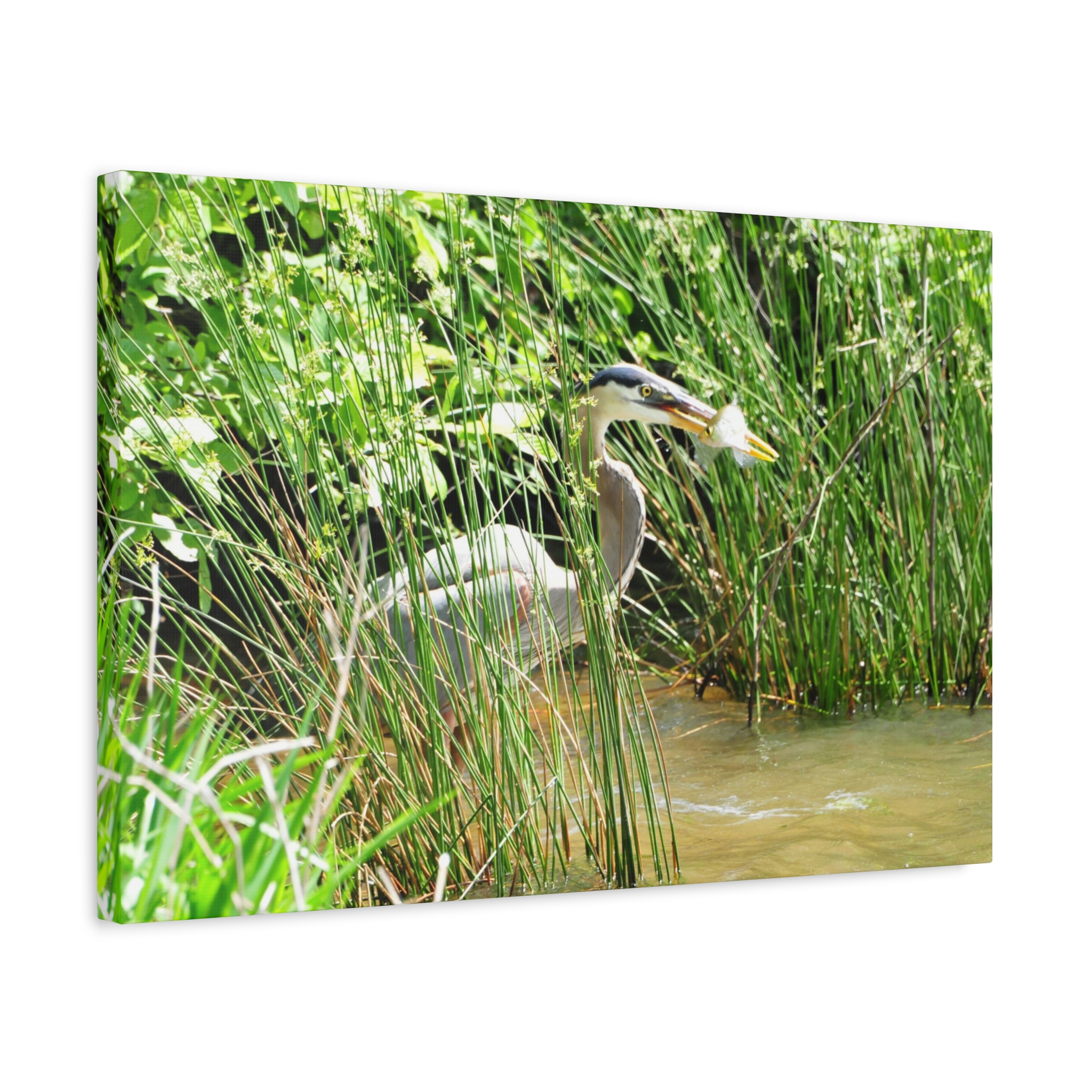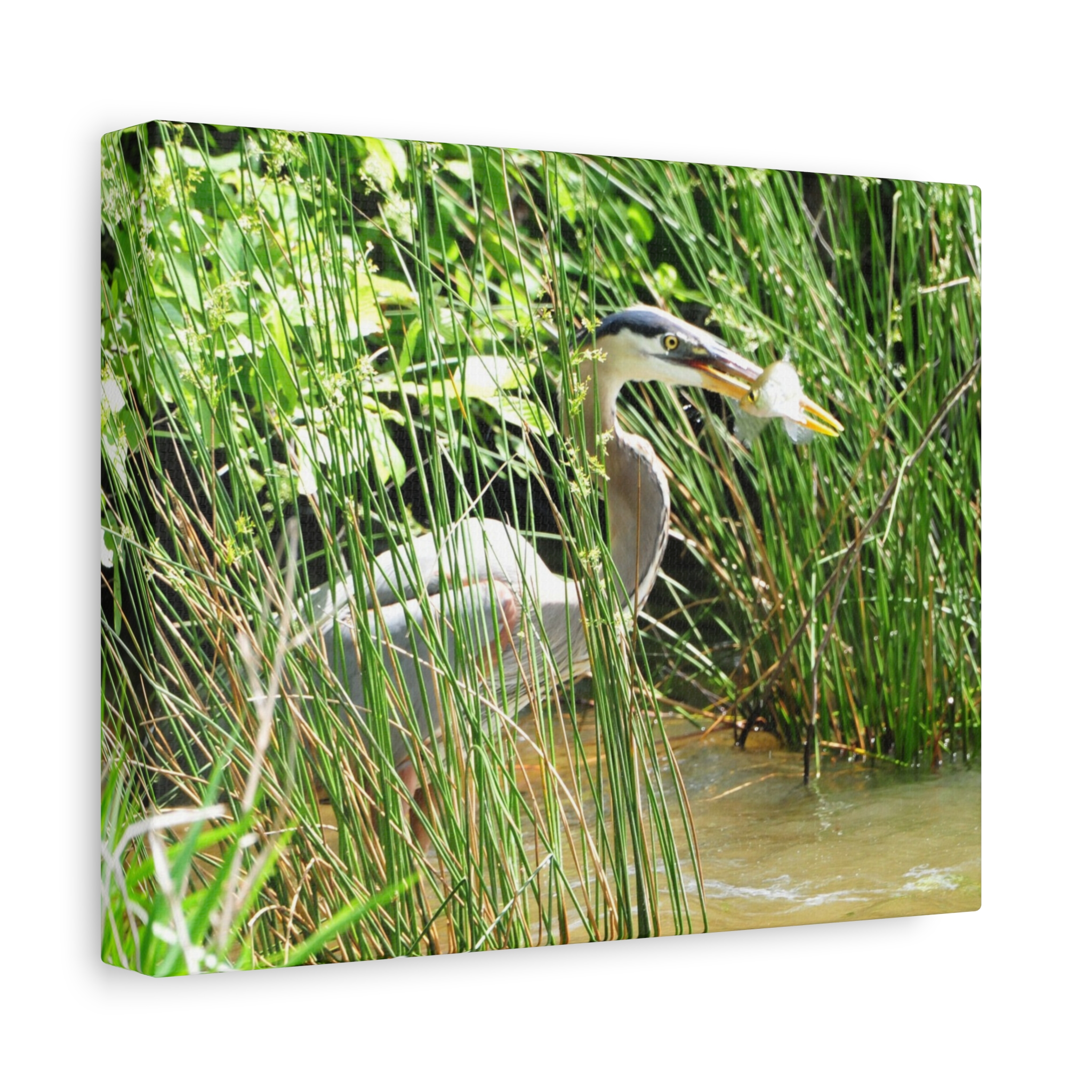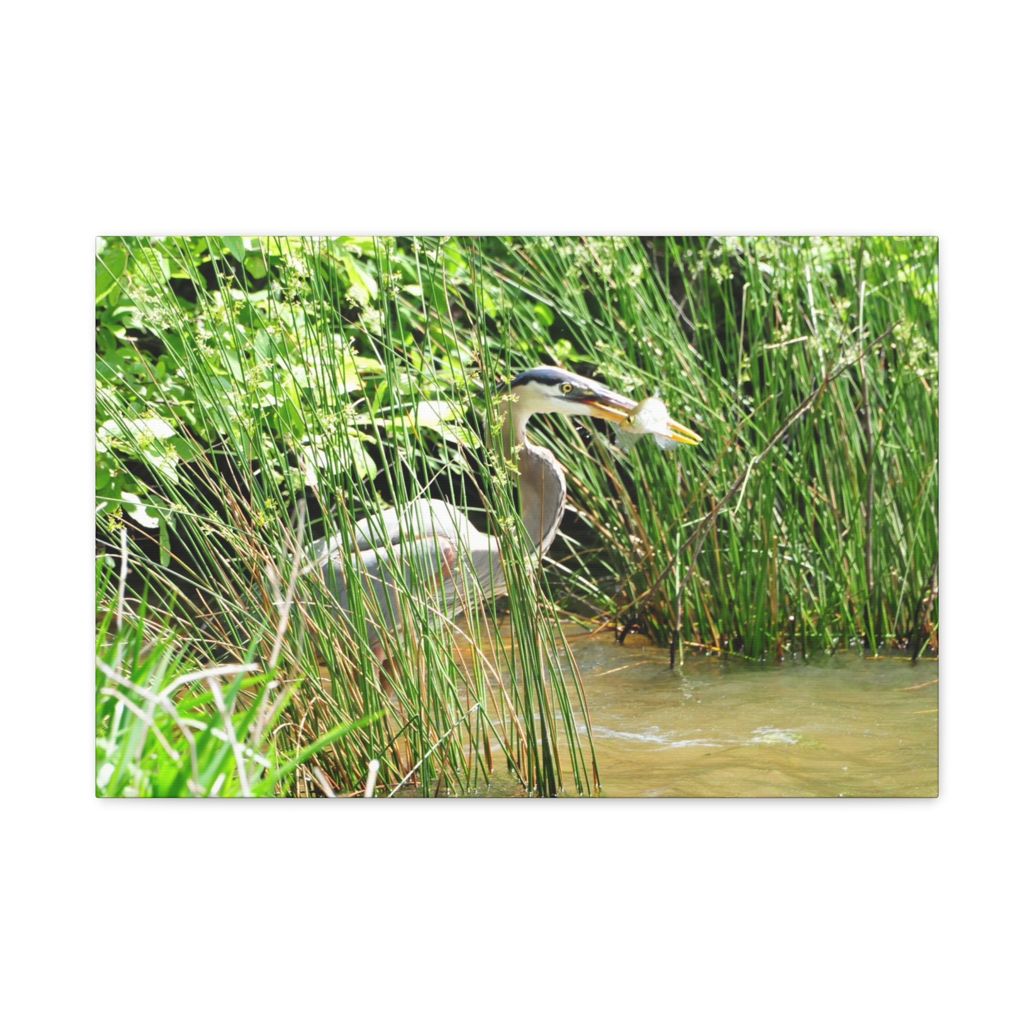 Bring the wetlands of Eastern North Carolina into your home with this wrapped canvas featuring a Great Blue Heron striking its prey among the reeds. The vivid greens, water reflections, and sharp detail of the heron’s catch create a bold, natural centerpiece for your space.