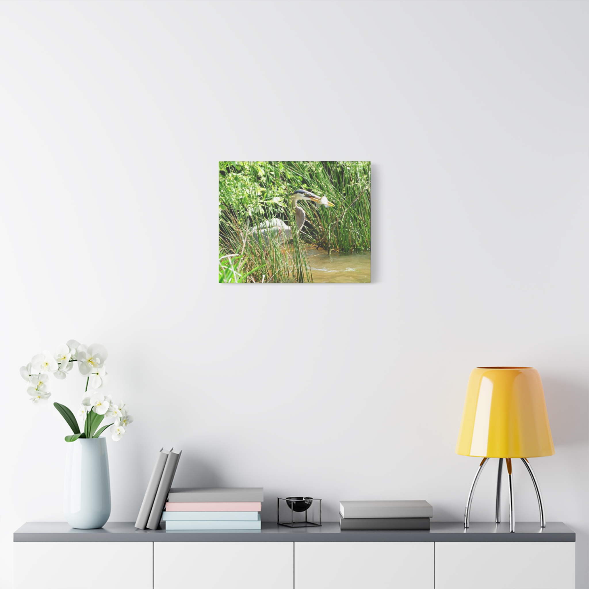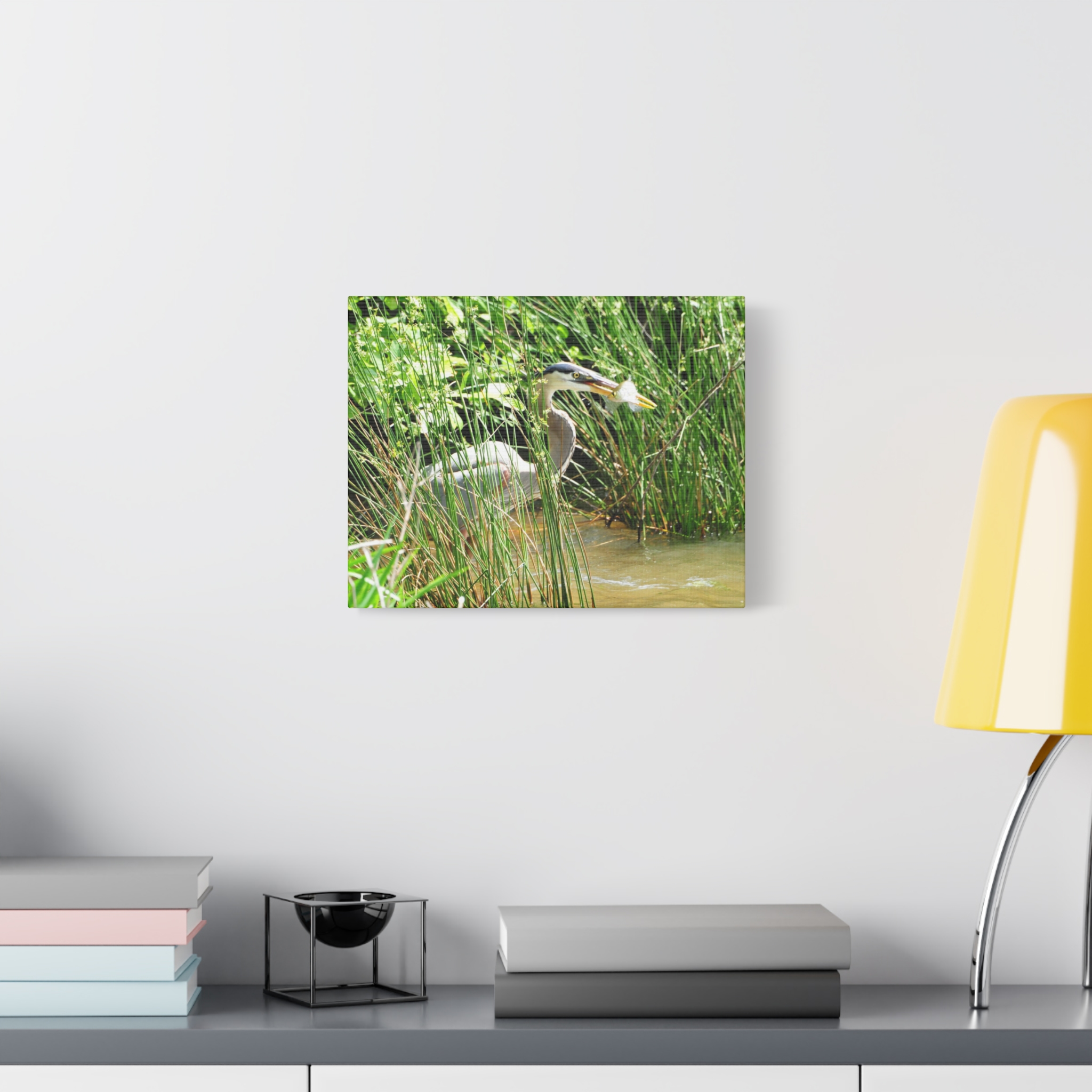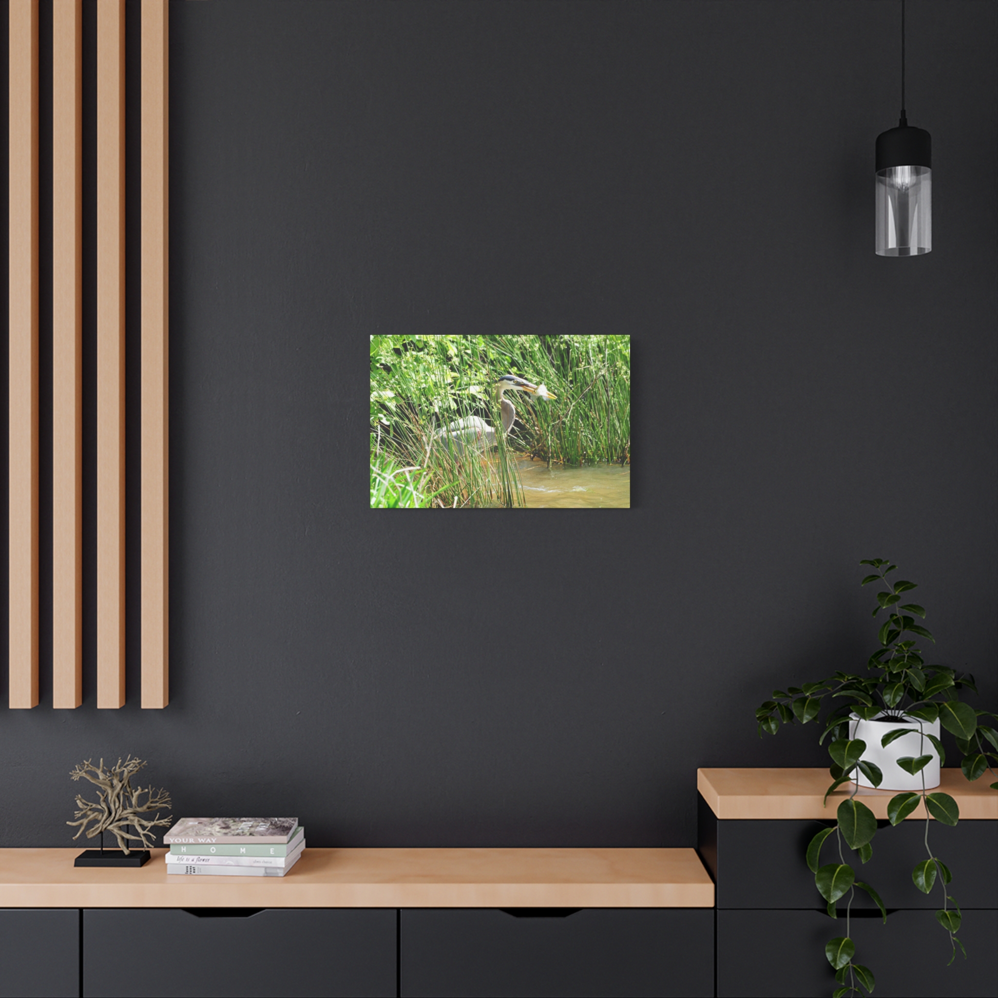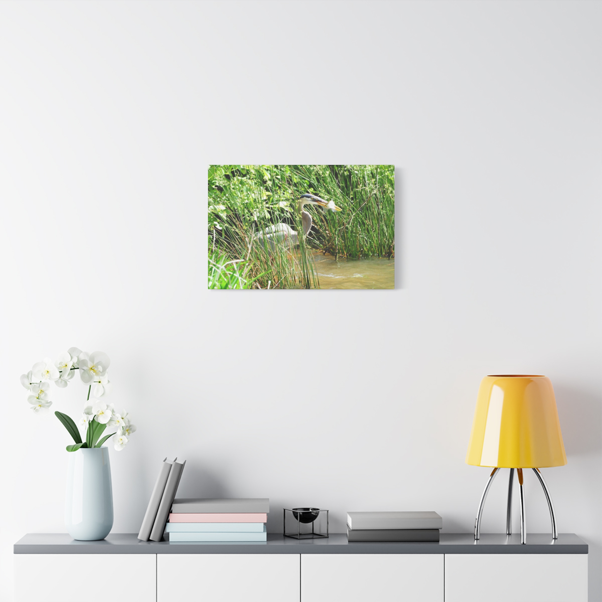 Bring the wetlands of Eastern North Carolina into your home with this wrapped canvas featuring a Great Blue Heron striking its prey among the reeds. The vivid greens, water reflections, and sharp detail of the heron’s catch create a bold, natural centerpiece for your space.