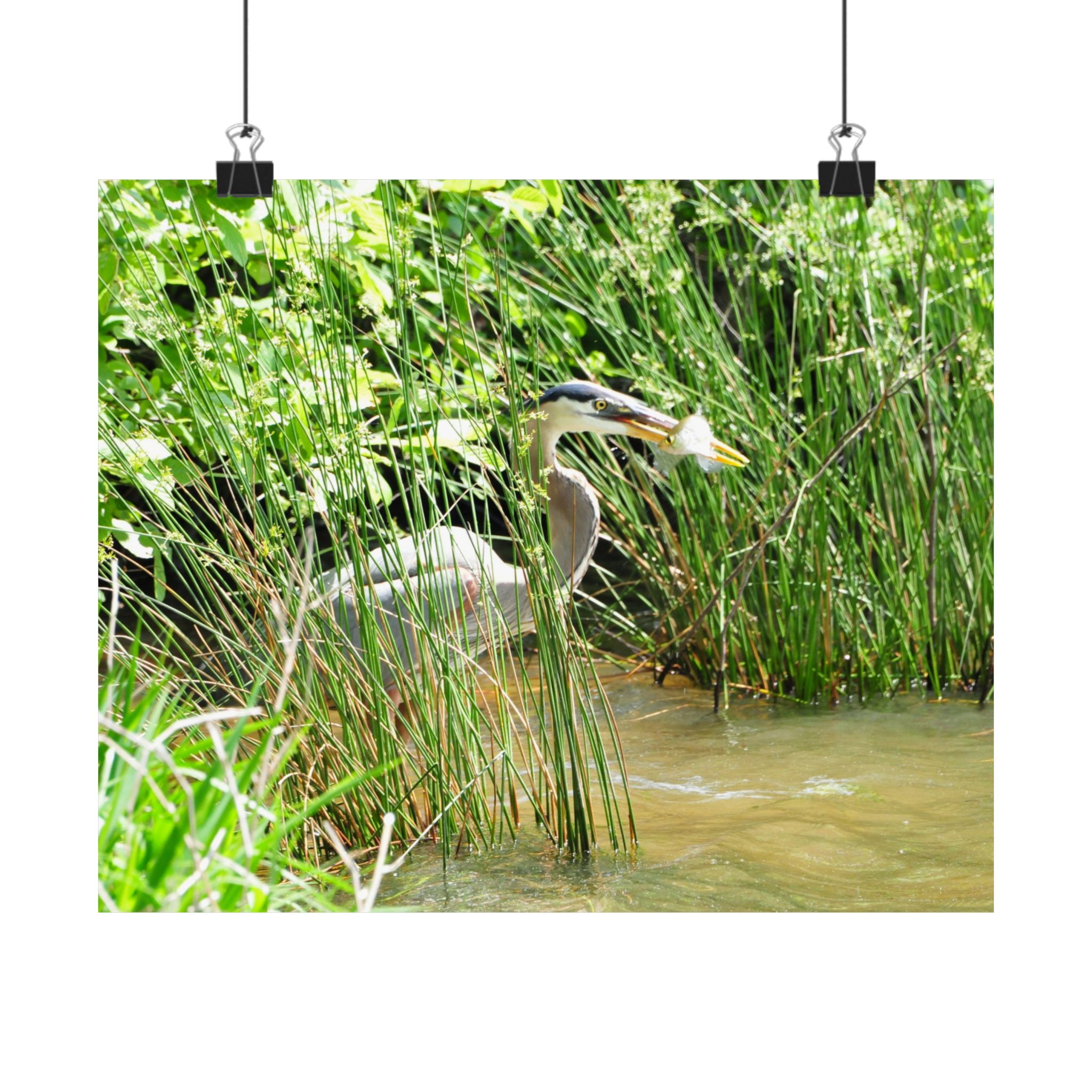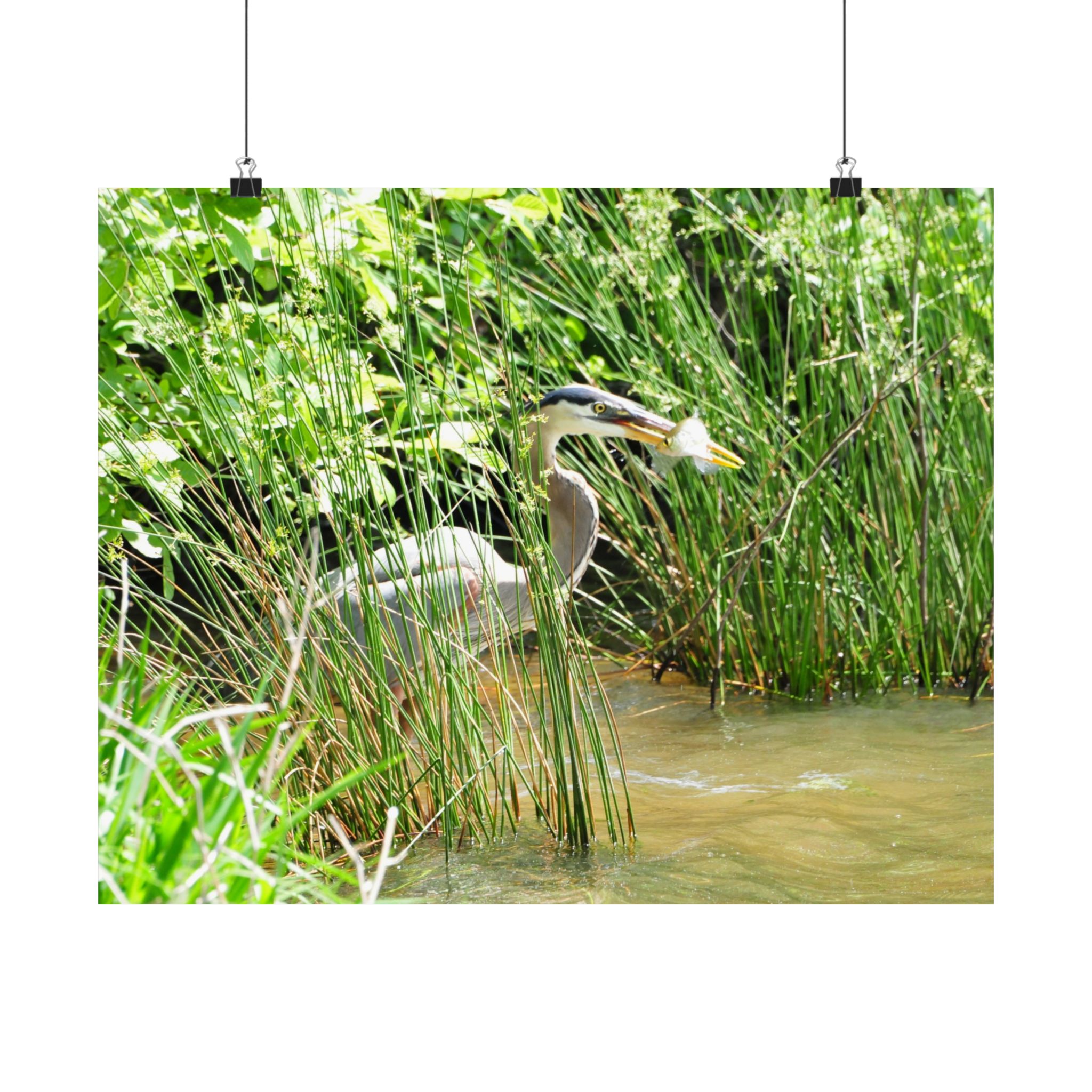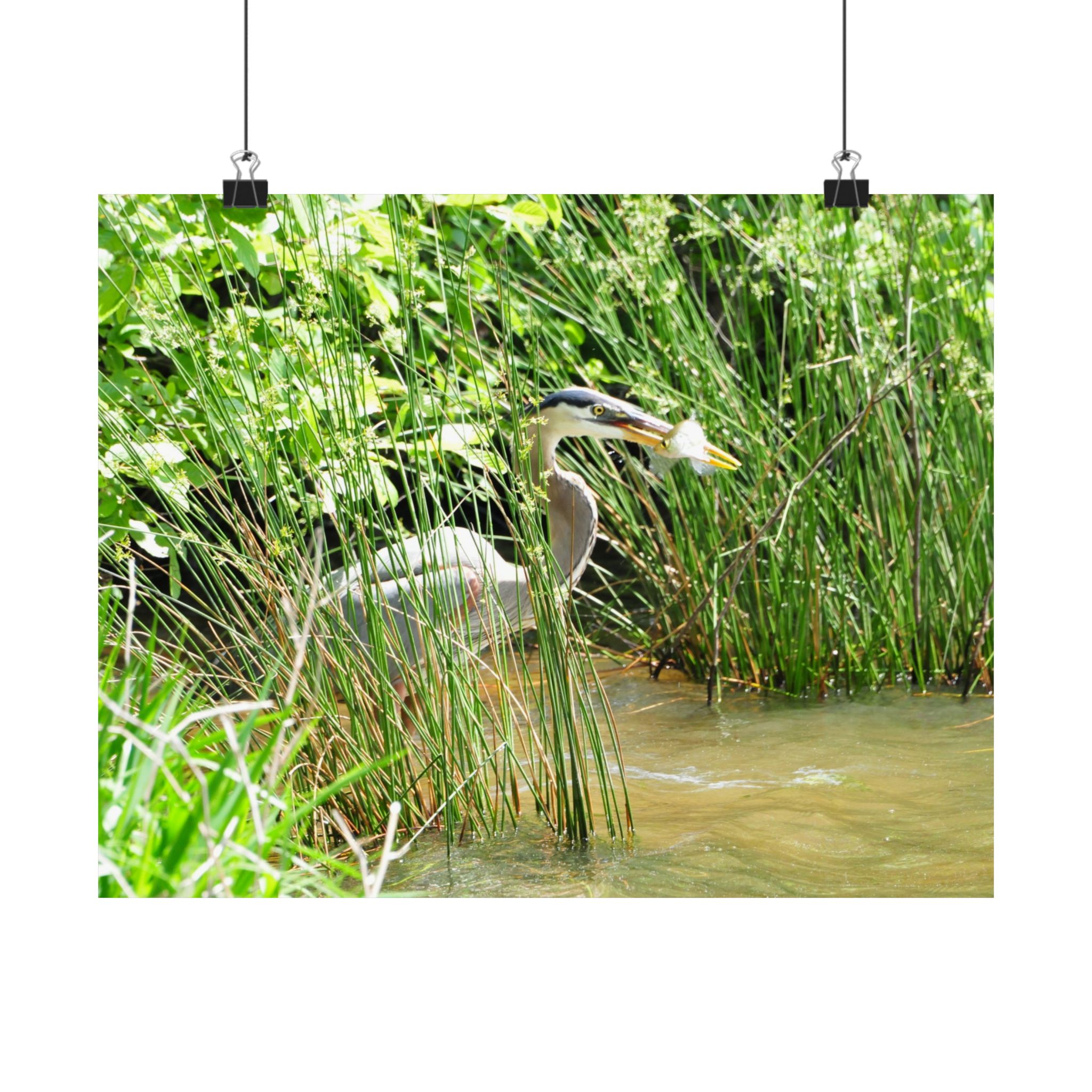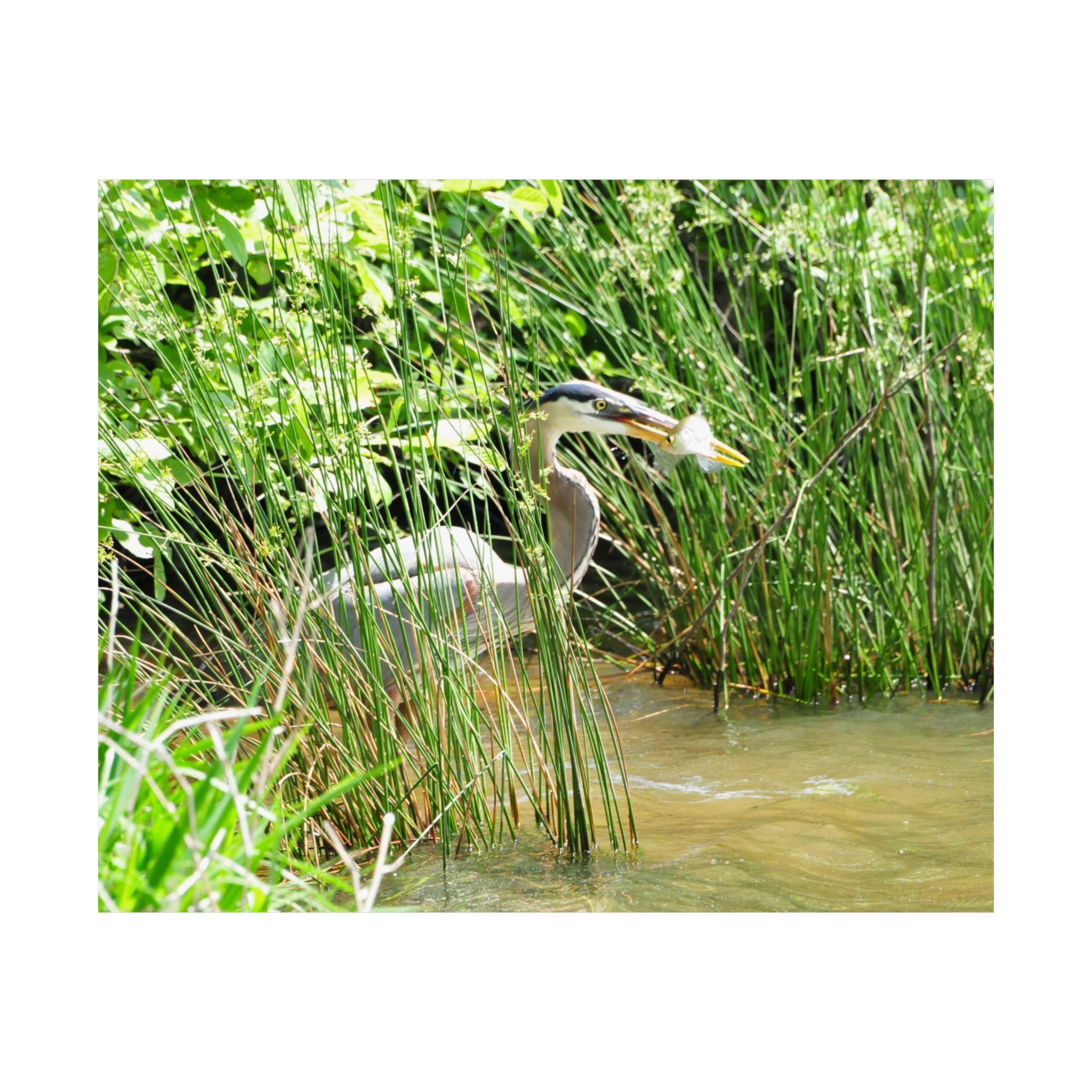 Great Blue Heron Wildlife Photography Print – Iconic Bird Catching Fish in Eastern North Carolina Wetlands – Fine Art Nature Print on 300 gsm Paper for Coastal Décor, Birdwatchers, and Wildlife Enthusiasts