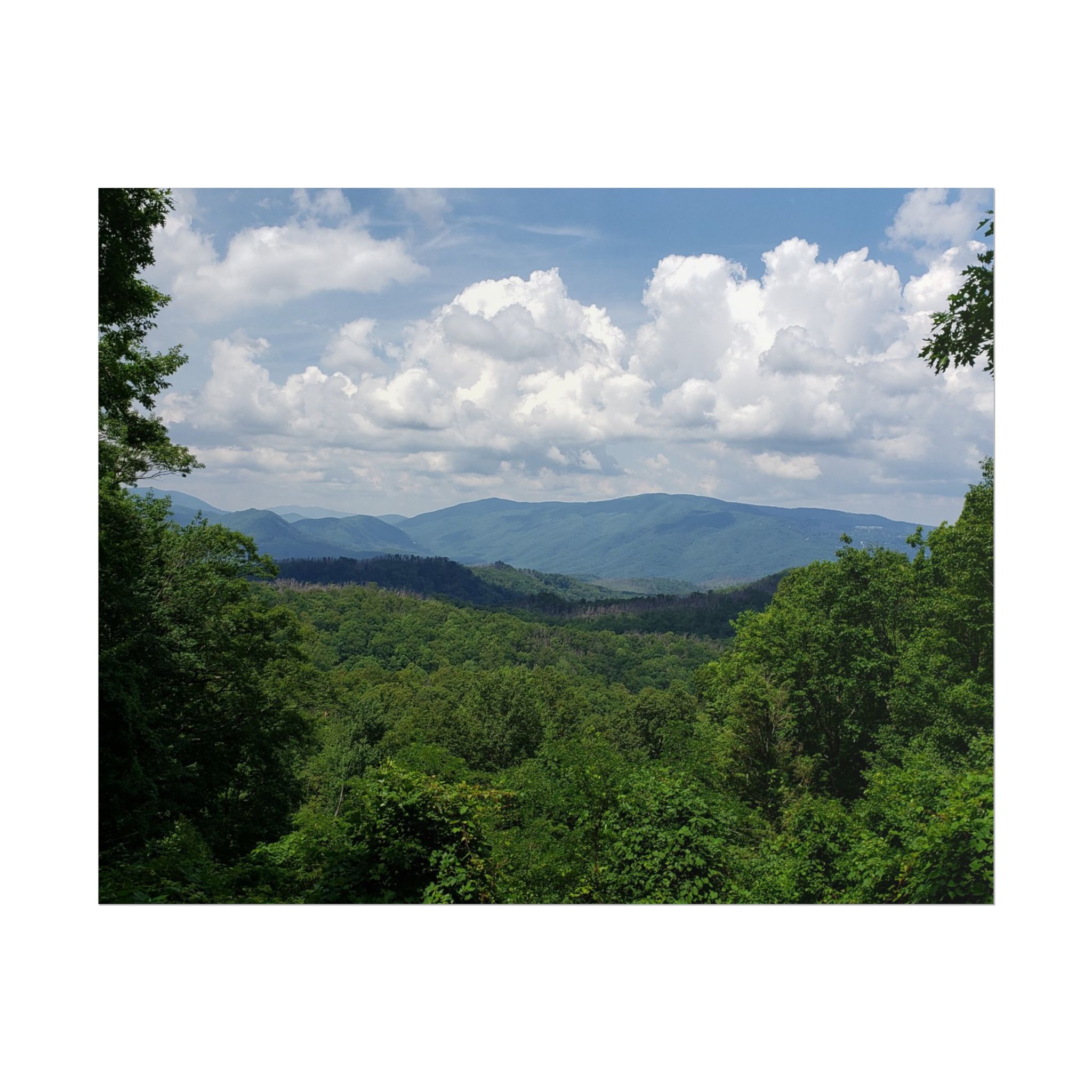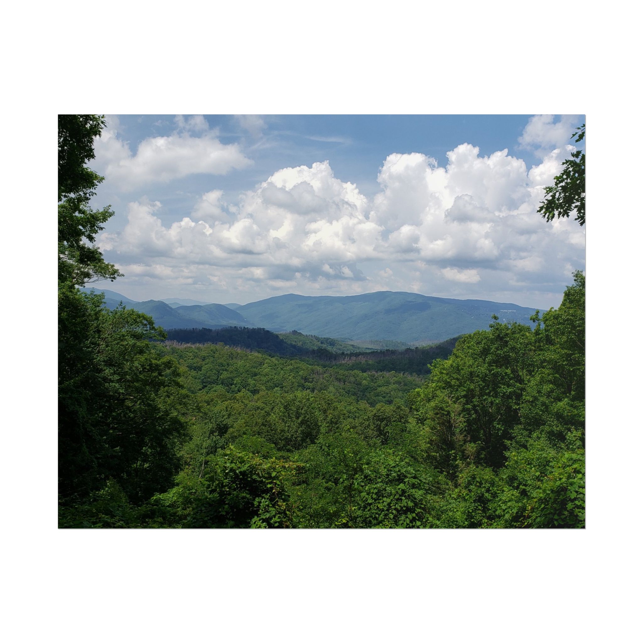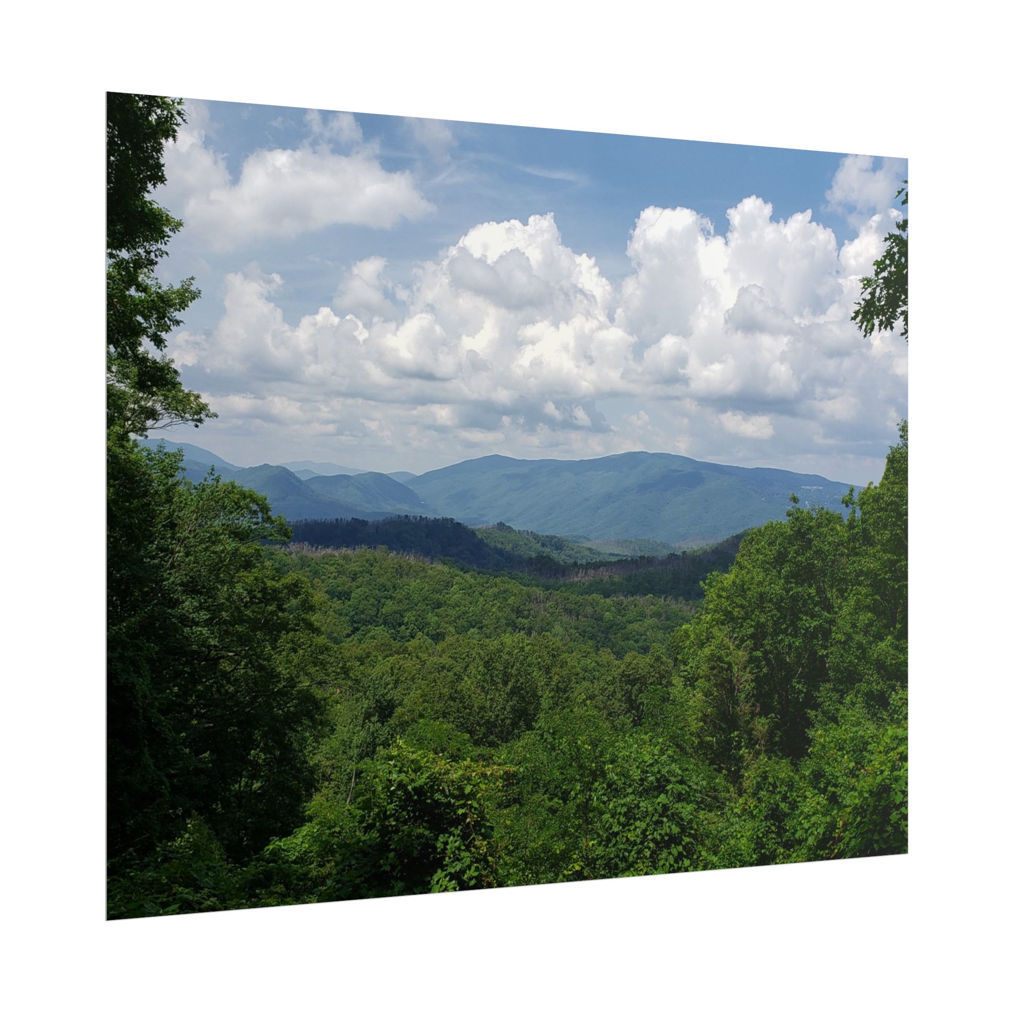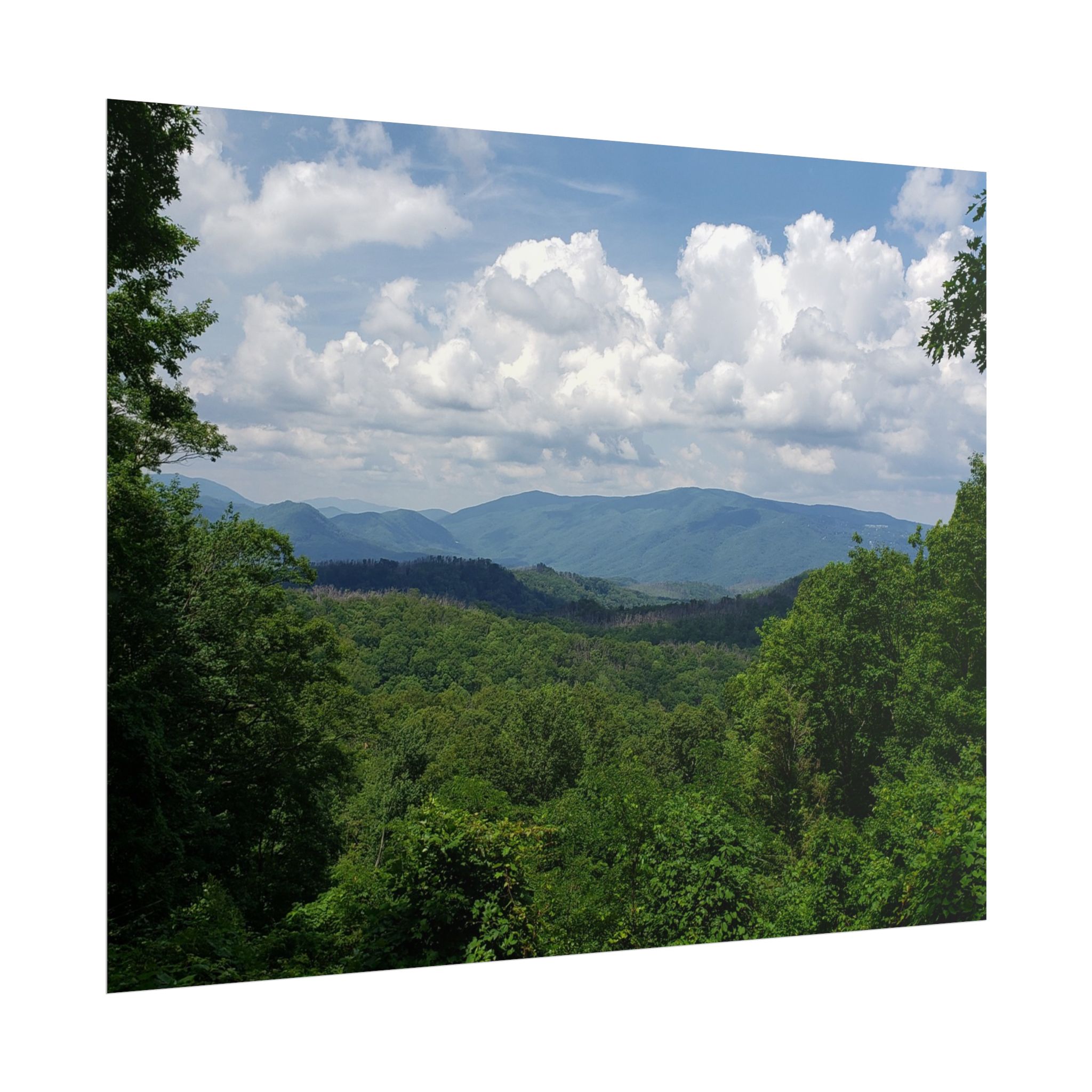 Step into the breathtaking beauty of the Great Smoky Mountains National Park with this fine matte print capturing layers of rolling blue ridges, dense green forests, and a vibrant summer sky dotted with clouds. Known for its misty horizons and ancient Appalachian landscapes, this view highlights the timeless beauty of America’s most-visited national park. The Smokies are celebrated for their biodiversity and sweeping vistas, and this image brings that same peace and grandeur into your home or office.