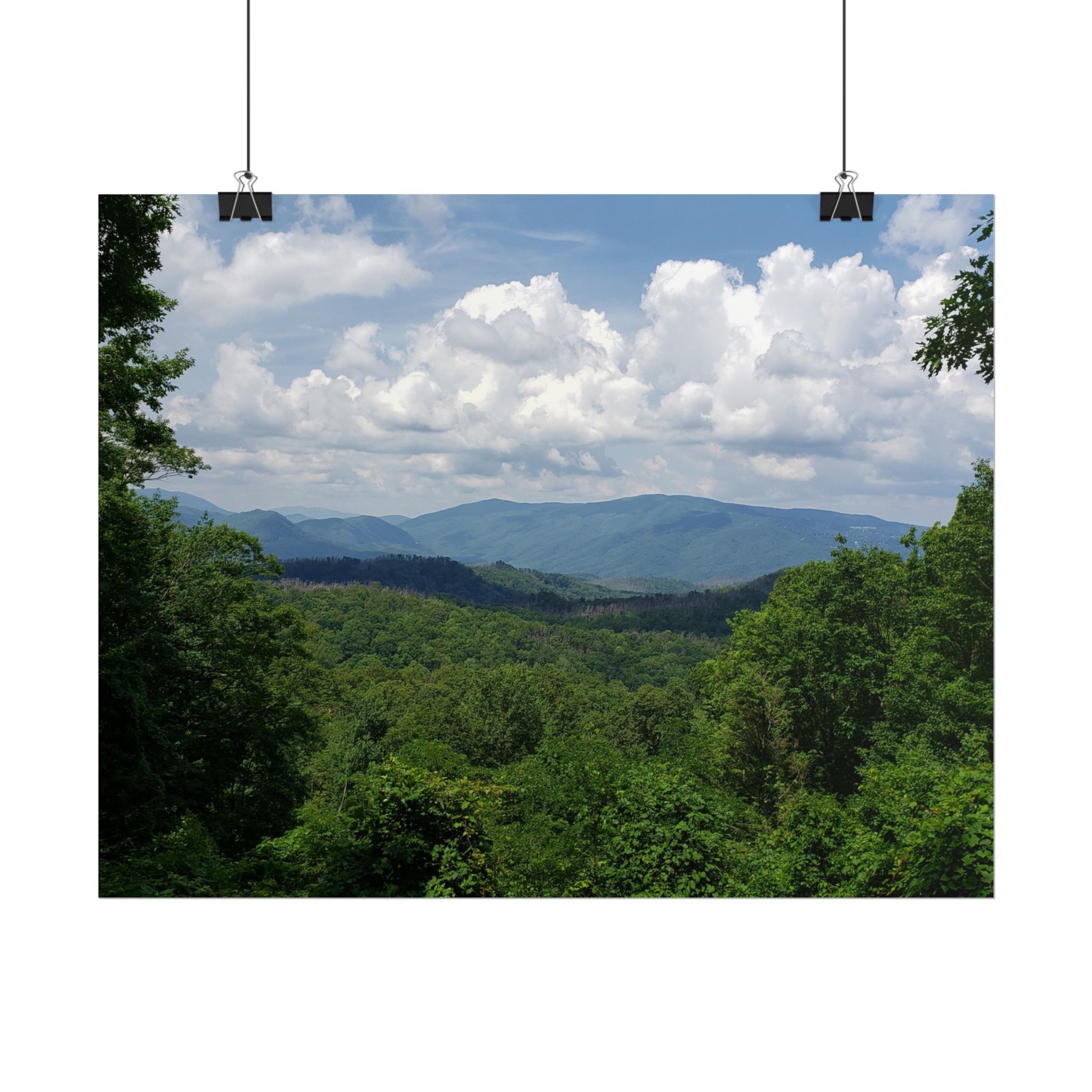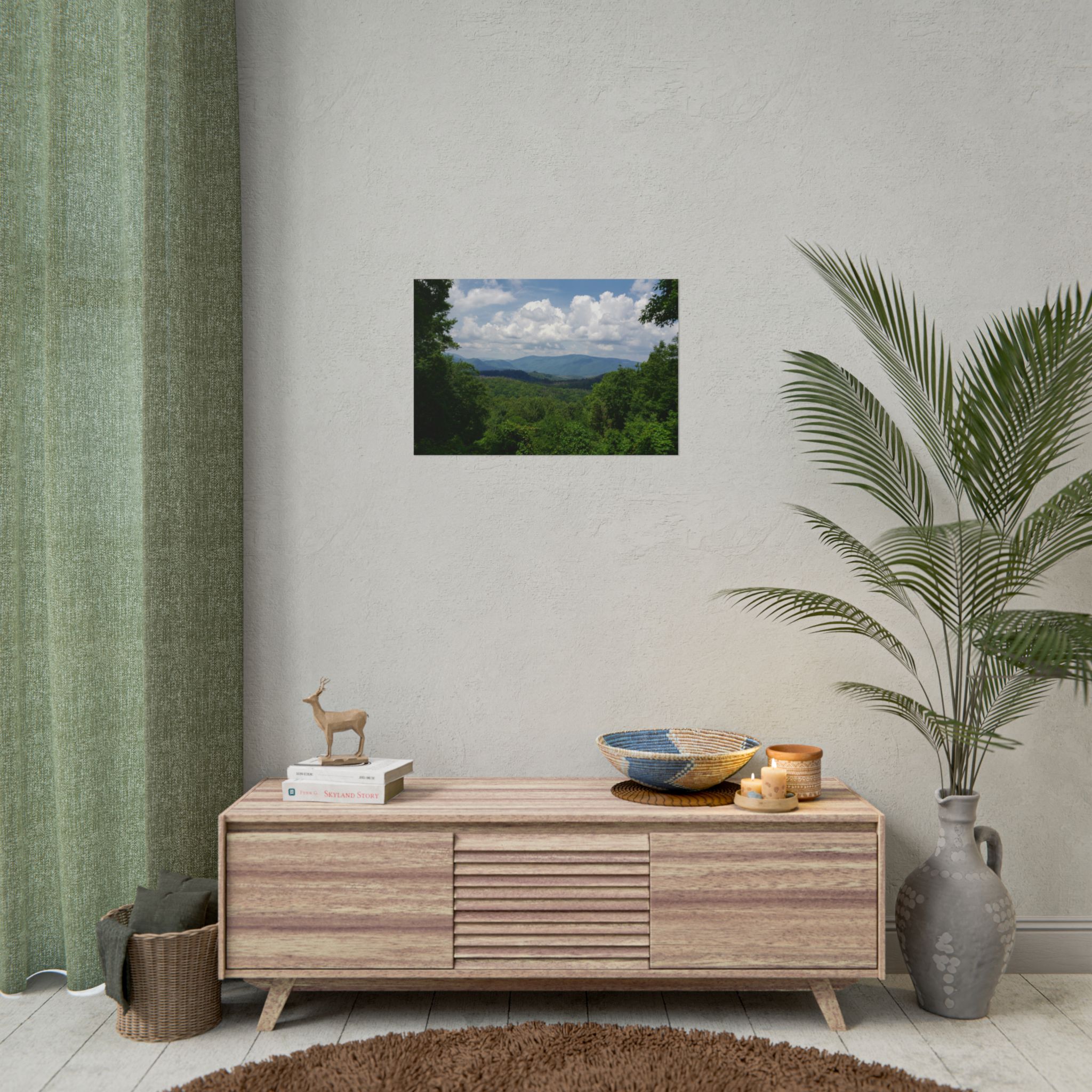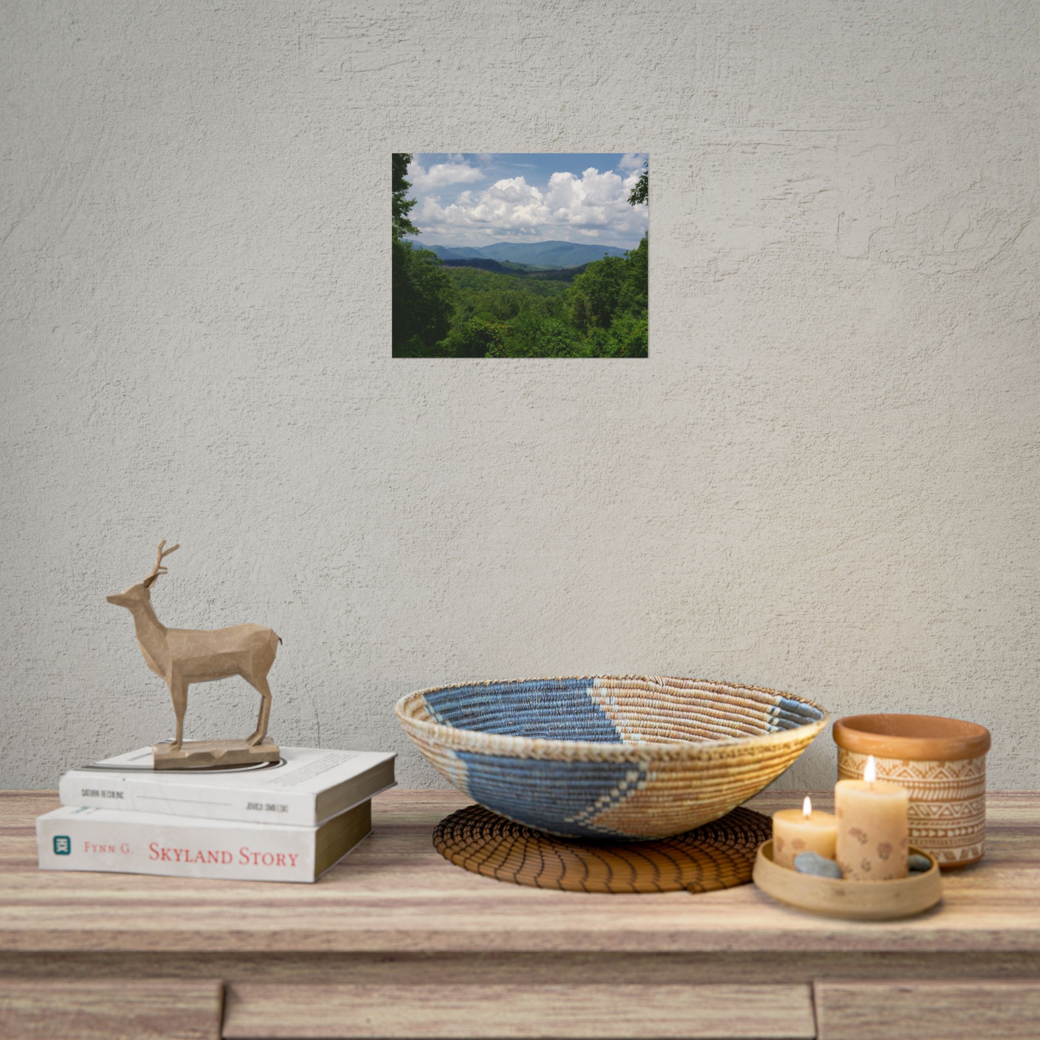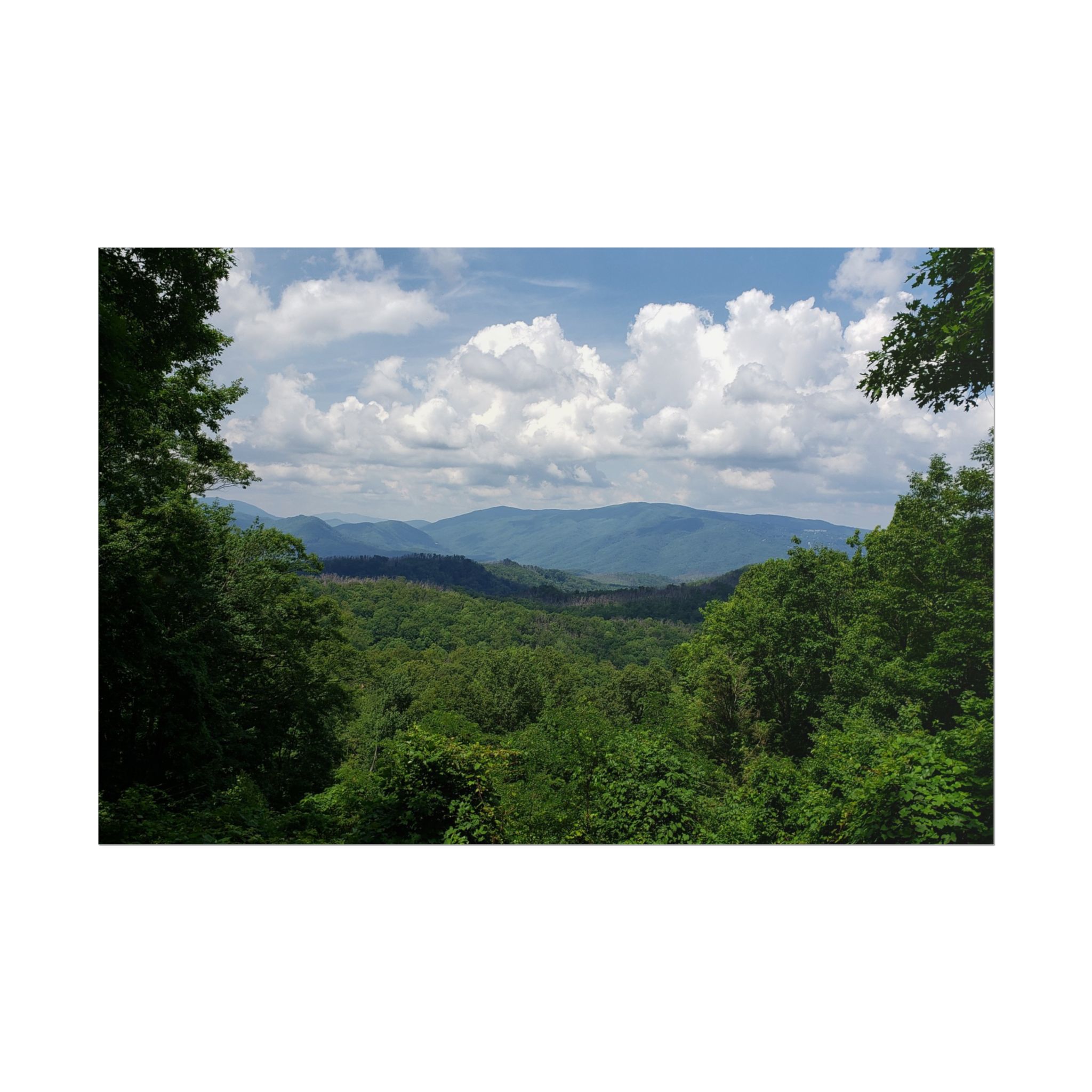 Step into the breathtaking beauty of the Great Smoky Mountains National Park with this fine matte print capturing layers of rolling blue ridges, dense green forests, and a vibrant summer sky dotted with clouds. Known for its misty horizons and ancient Appalachian landscapes, this view highlights the timeless beauty of America’s most-visited national park. The Smokies are celebrated for their biodiversity and sweeping vistas, and this image brings that same peace and grandeur into your home or office.