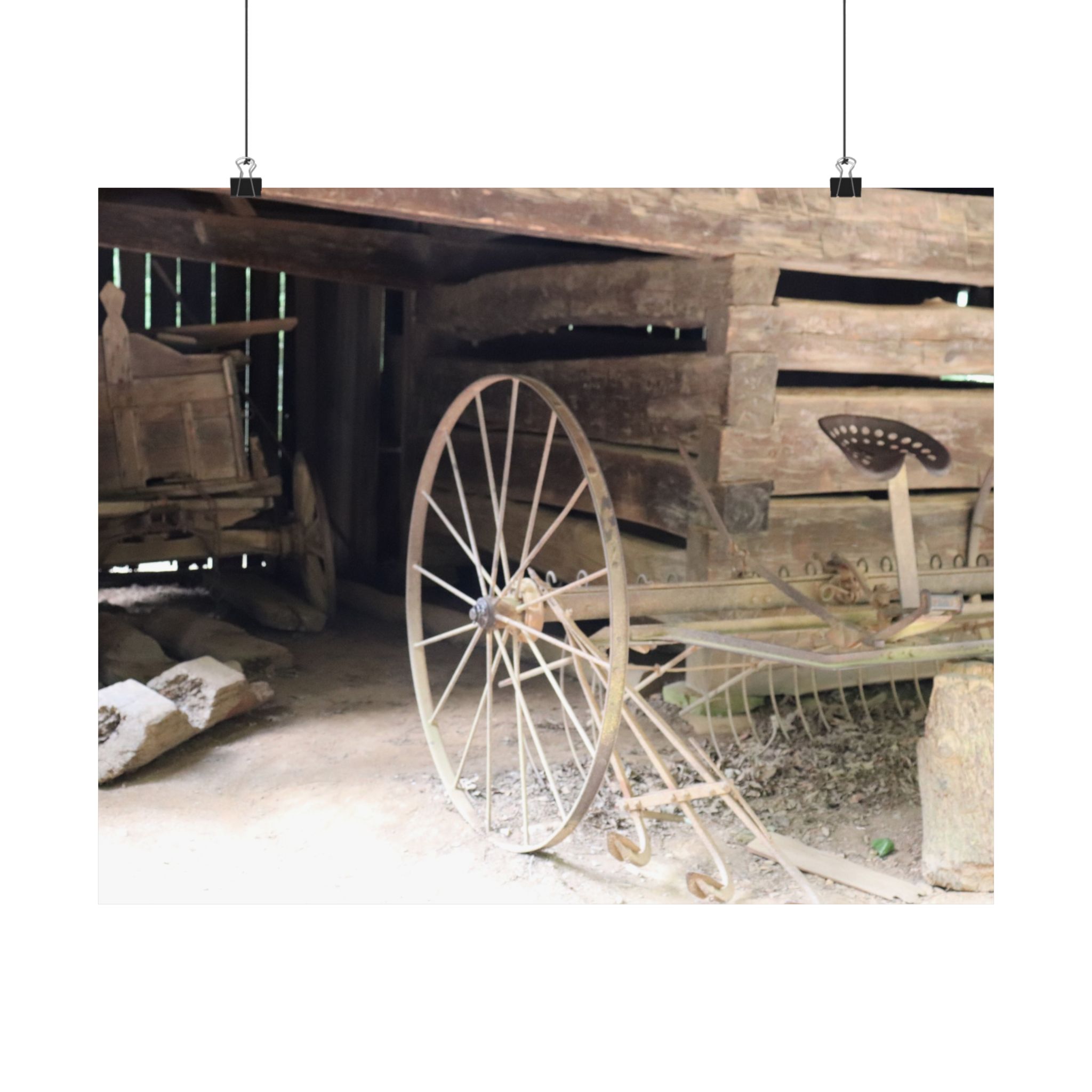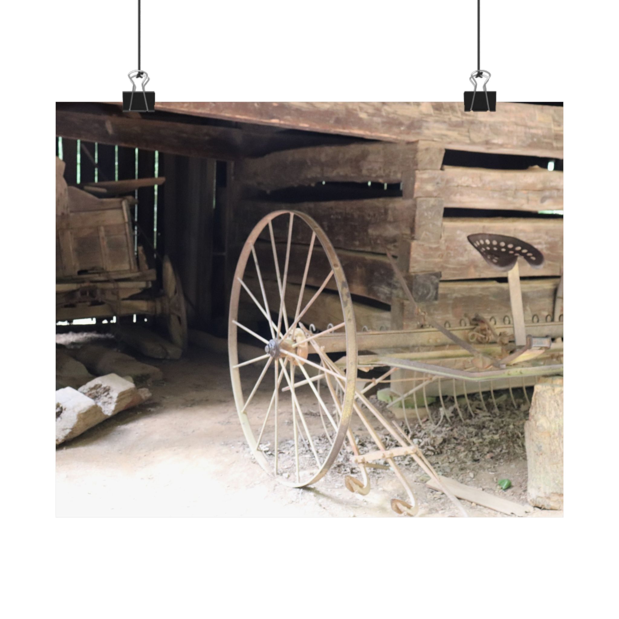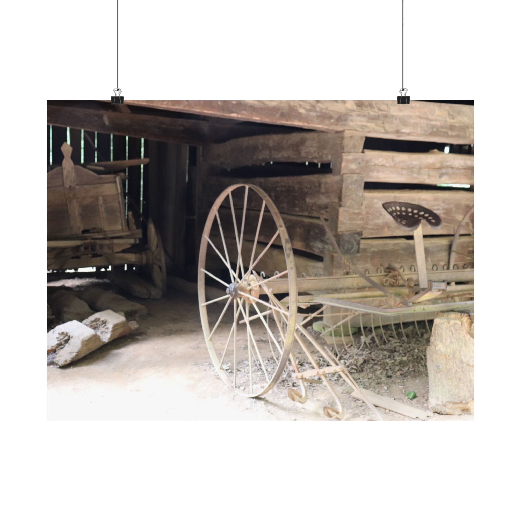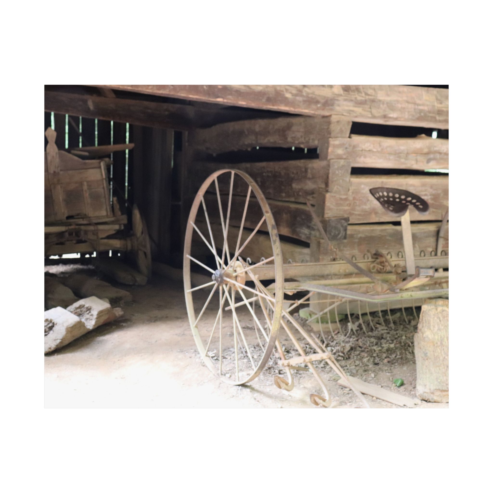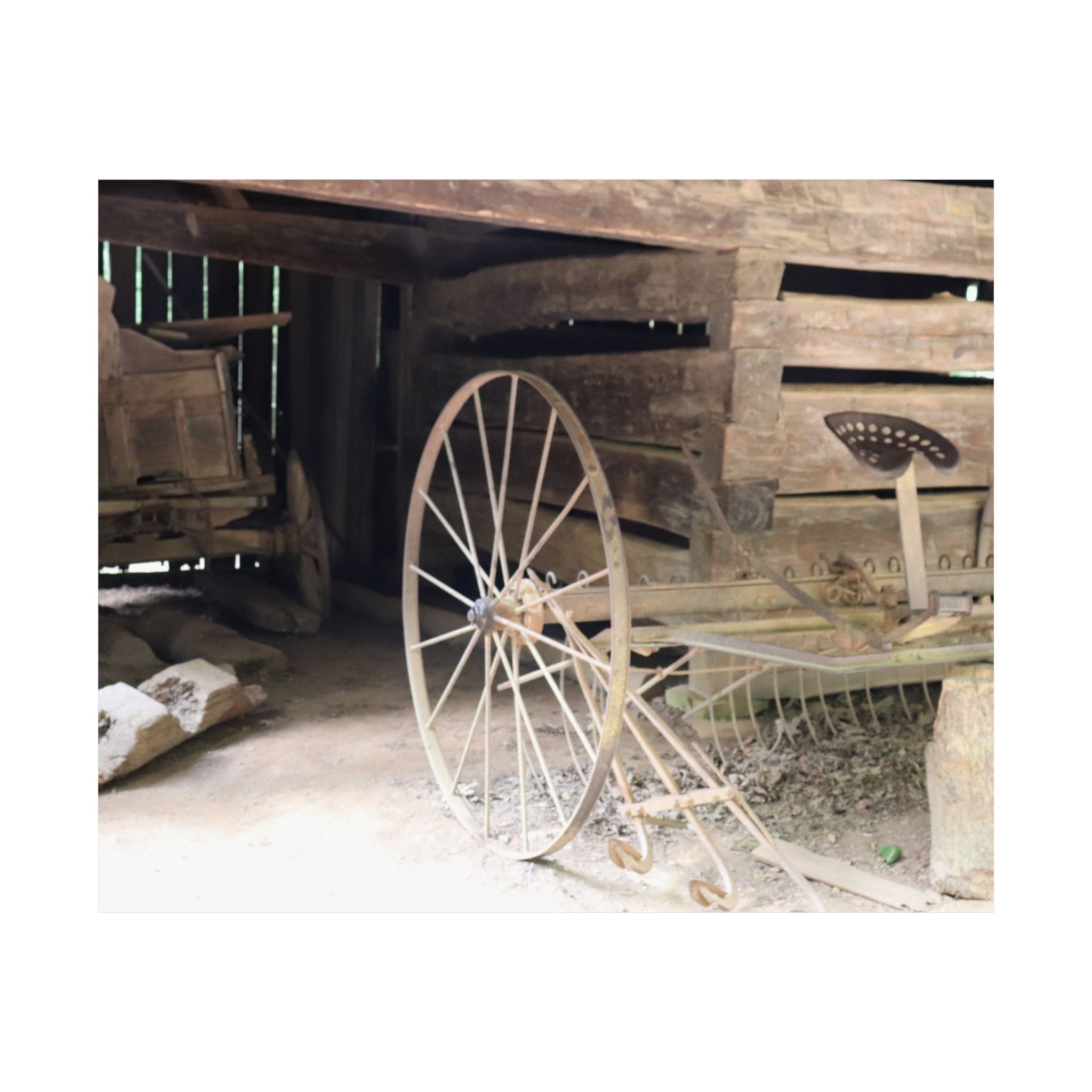 This photograph captures the timeless character of a preserved Appalachian farmstead at Cades Cove in Great Smoky Mountains National Park, Tennessee. The rustic farm equipment and weathered wooden structures embody the pioneer spirit and farming traditions of early American settlers. Surrounded by lush Smoky Mountain forest, this image preserves the legacy of Appalachian craftsmanship and resilience, making it an ideal piece for history enthusiasts, rustic décor lovers, and national park collectors.