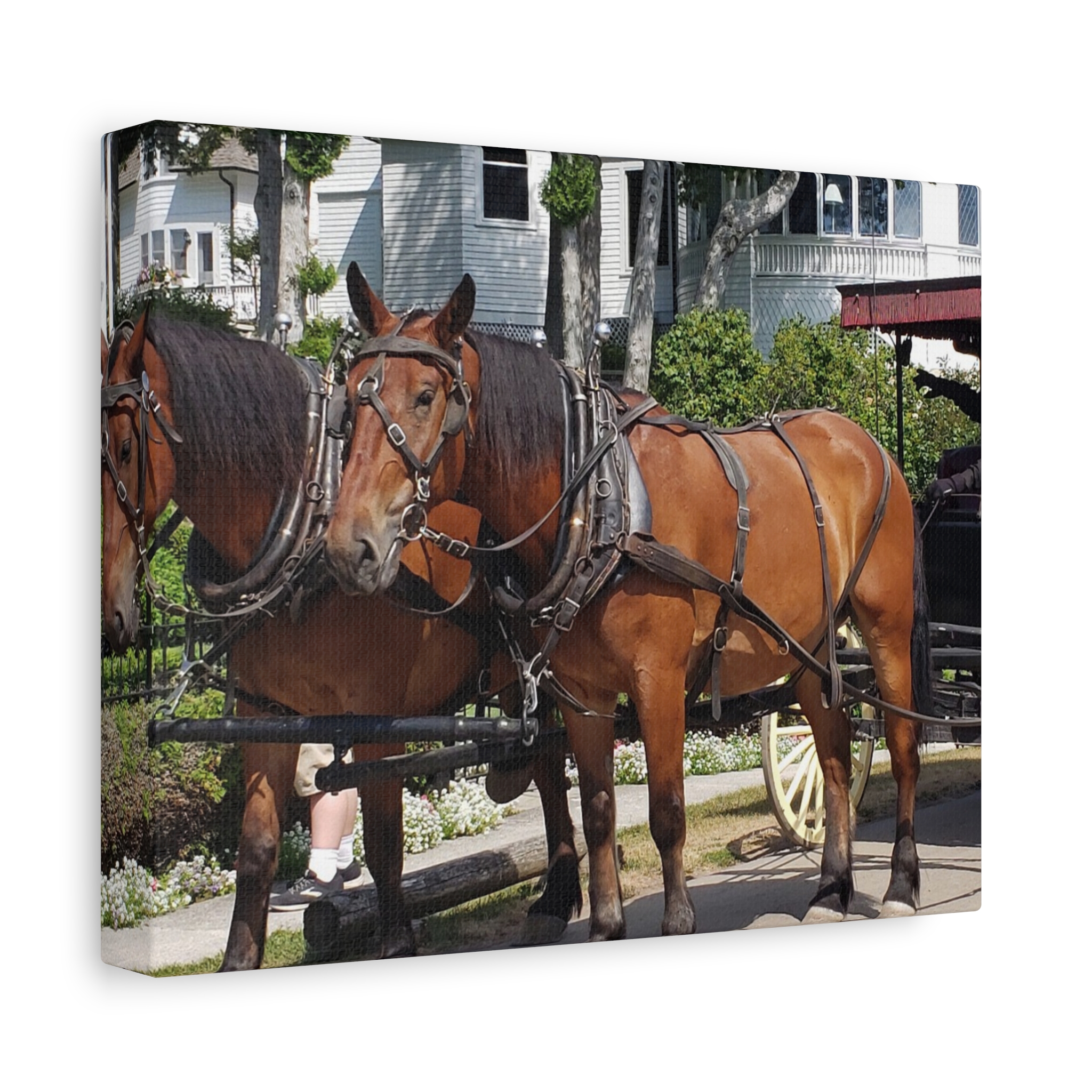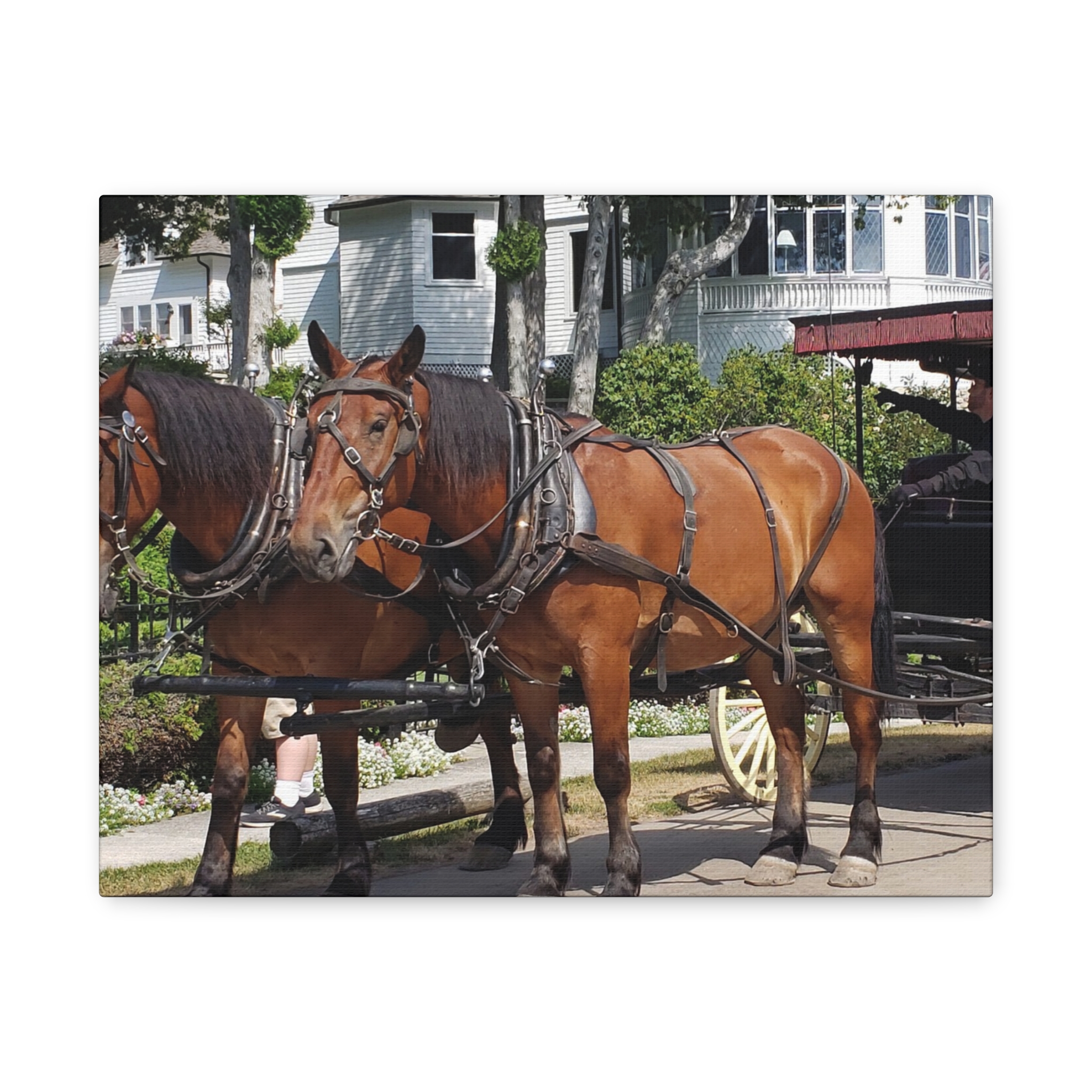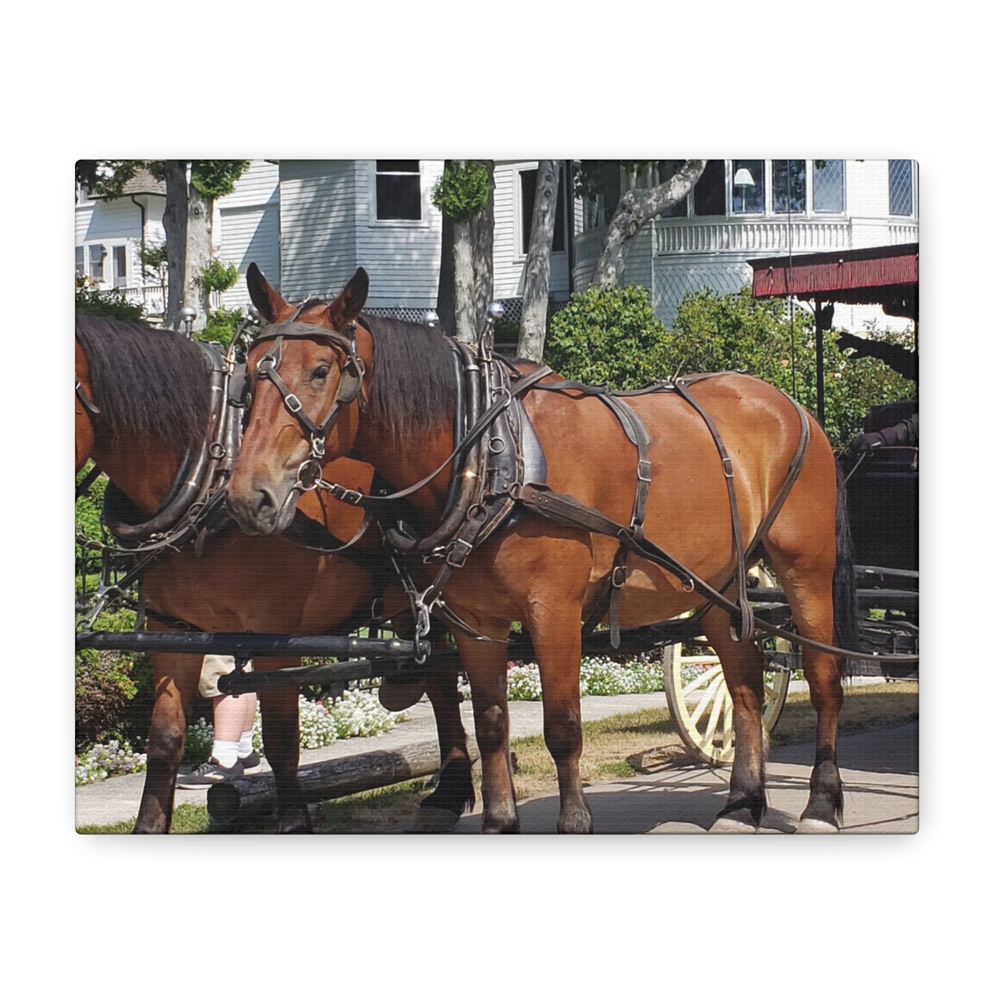 Bring the charm of Mackinac Island’s West Bluff into your home with this wrapped canvas print of a horse and carriage scene. Known for its ban on automobiles, Mackinac Island has preserved a way of life rooted in history, where horse-drawn carriages still glide past elegant Victorian homes and manicured gardens. This image captures the strength of two draft horses standing proudly before their carriage, framed by the historic homes that overlook Lake Huron.