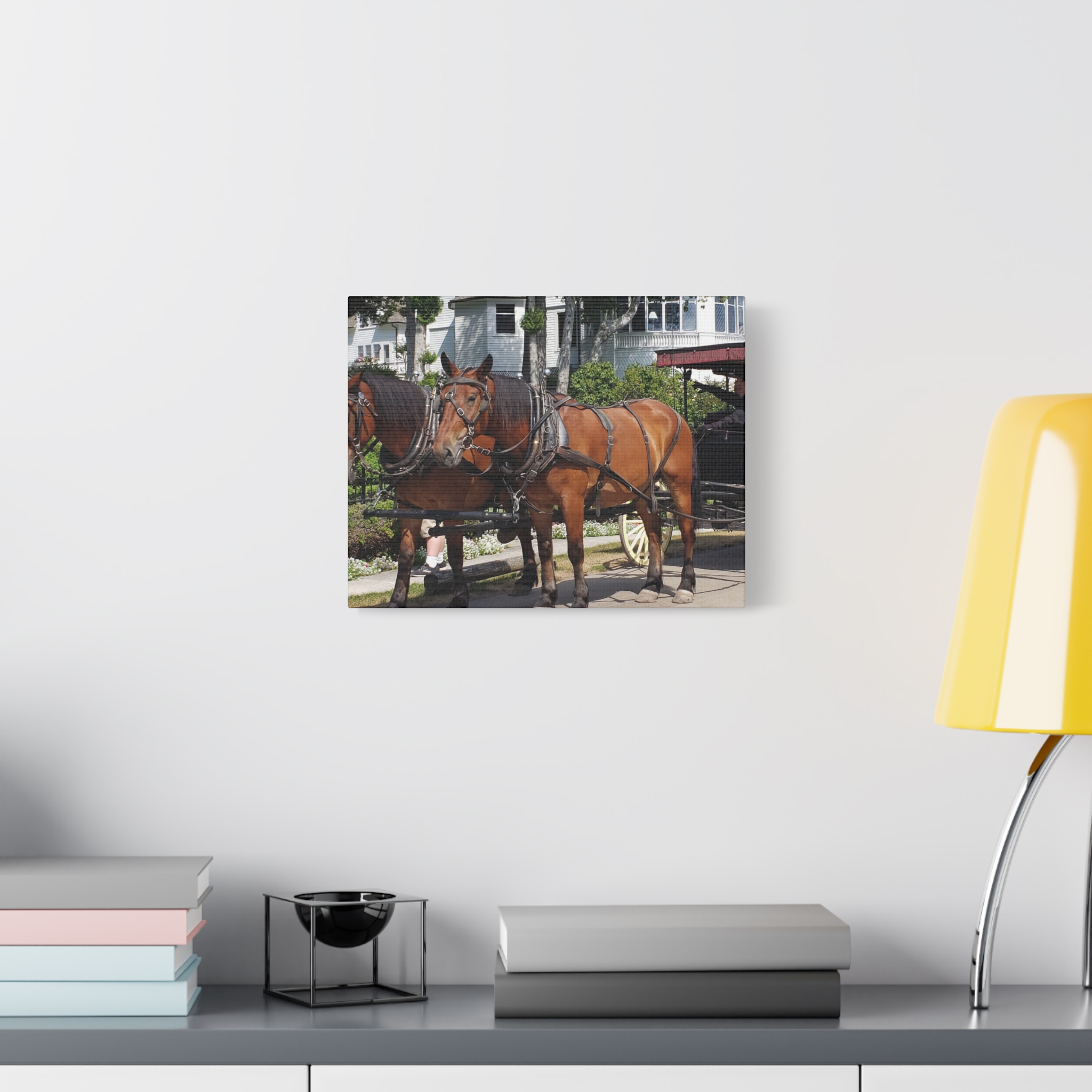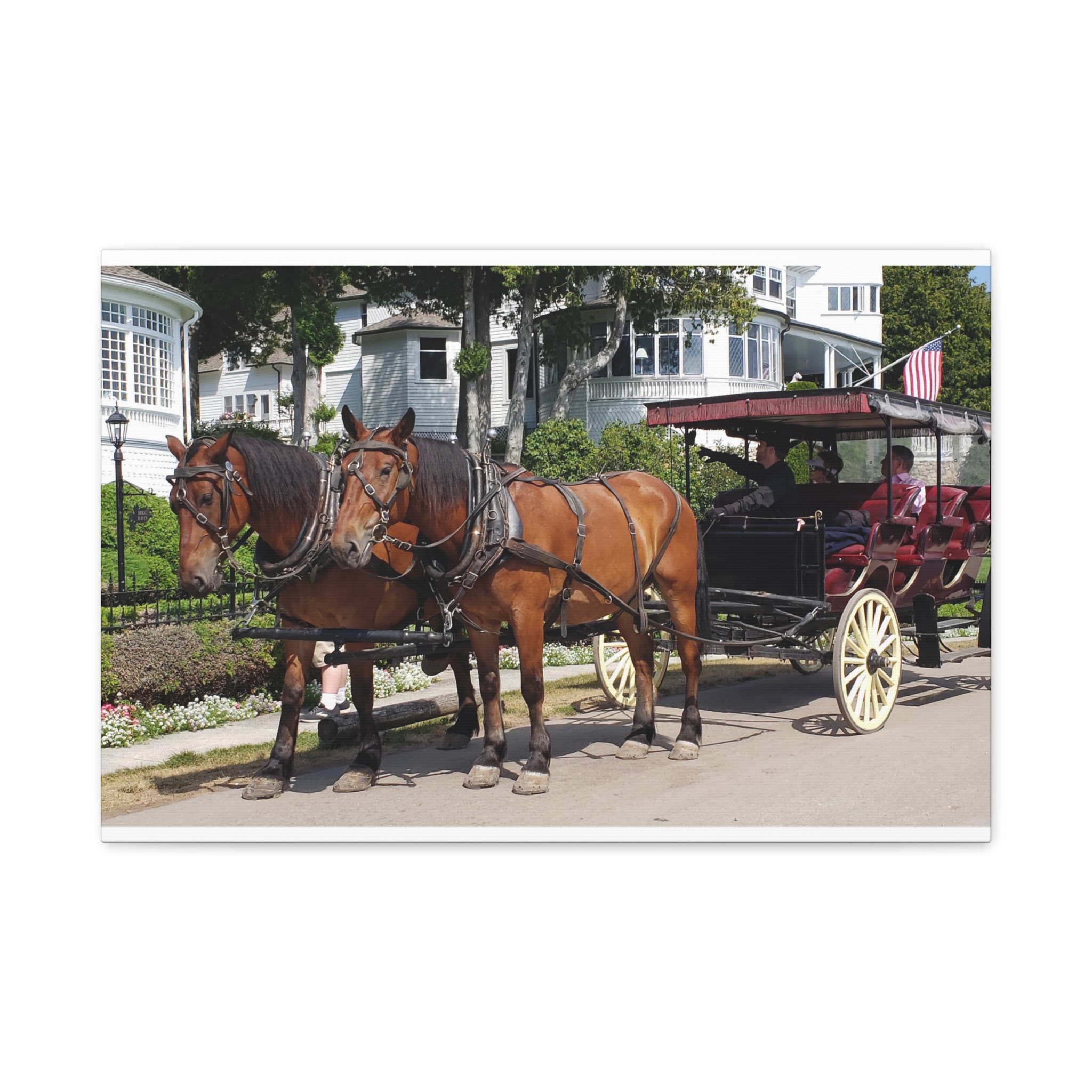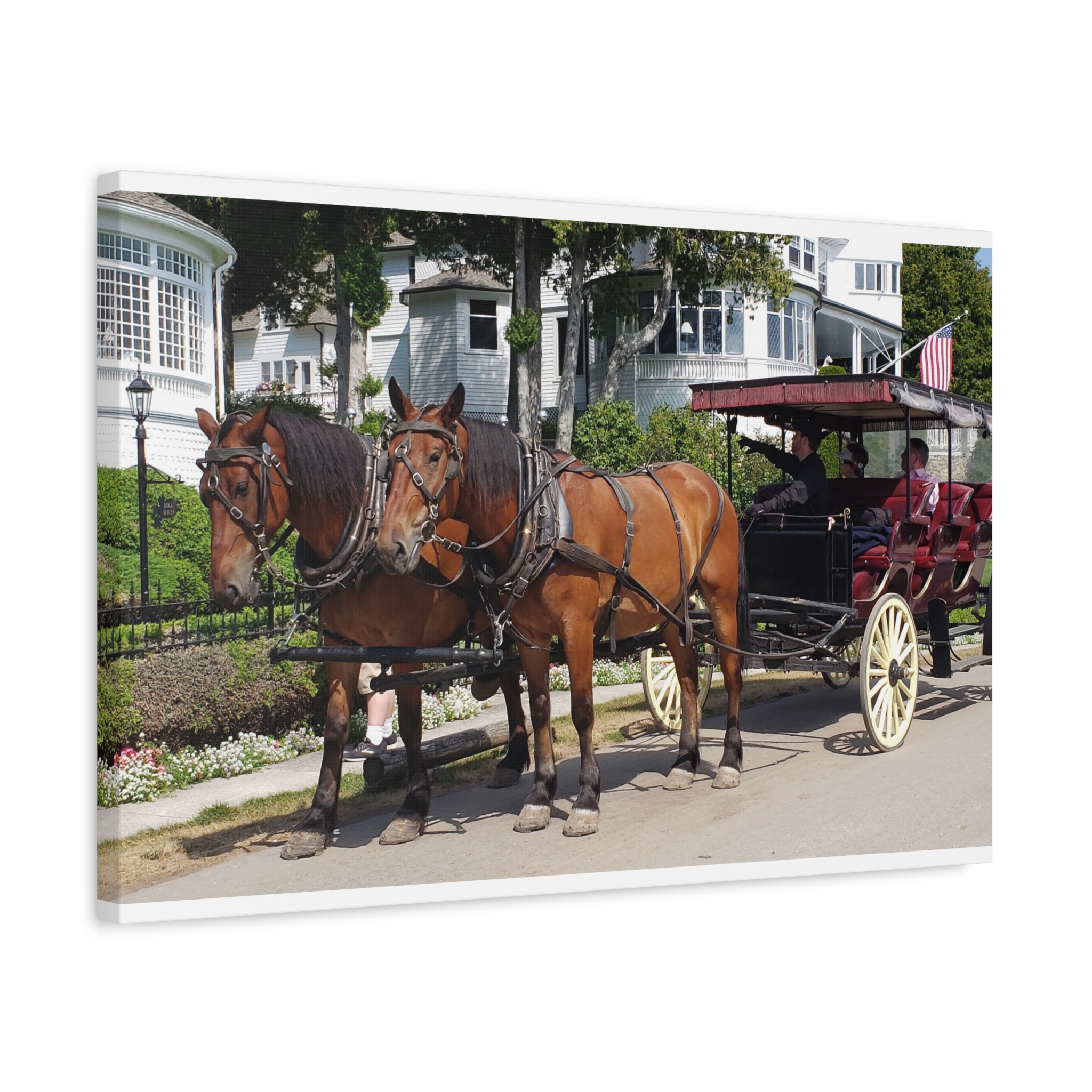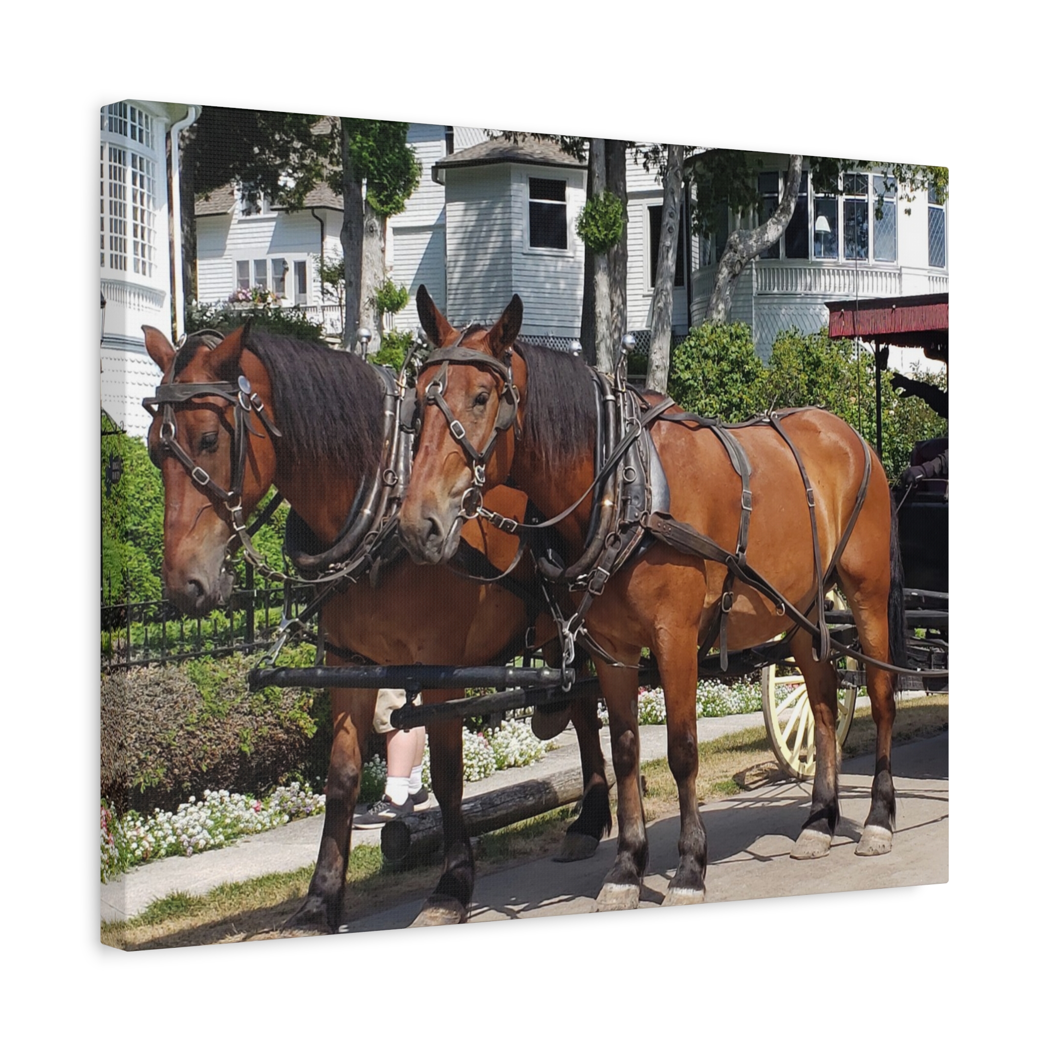 Bring the charm of Mackinac Island’s West Bluff into your home with this wrapped canvas print of a horse and carriage scene. Known for its ban on automobiles, Mackinac Island has preserved a way of life rooted in history, where horse-drawn carriages still glide past elegant Victorian homes and manicured gardens. This image captures the strength of two draft horses standing proudly before their carriage, framed by the historic homes that overlook Lake Huron.