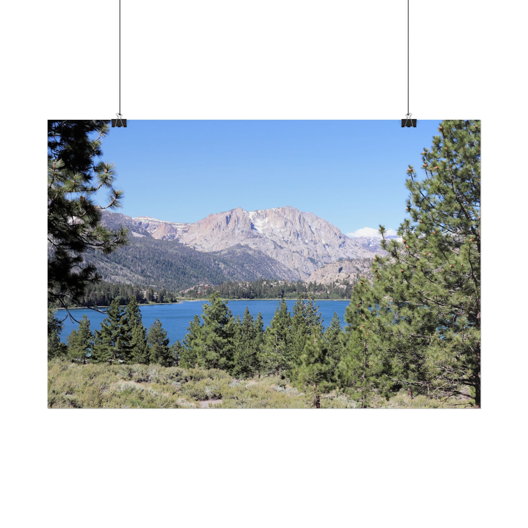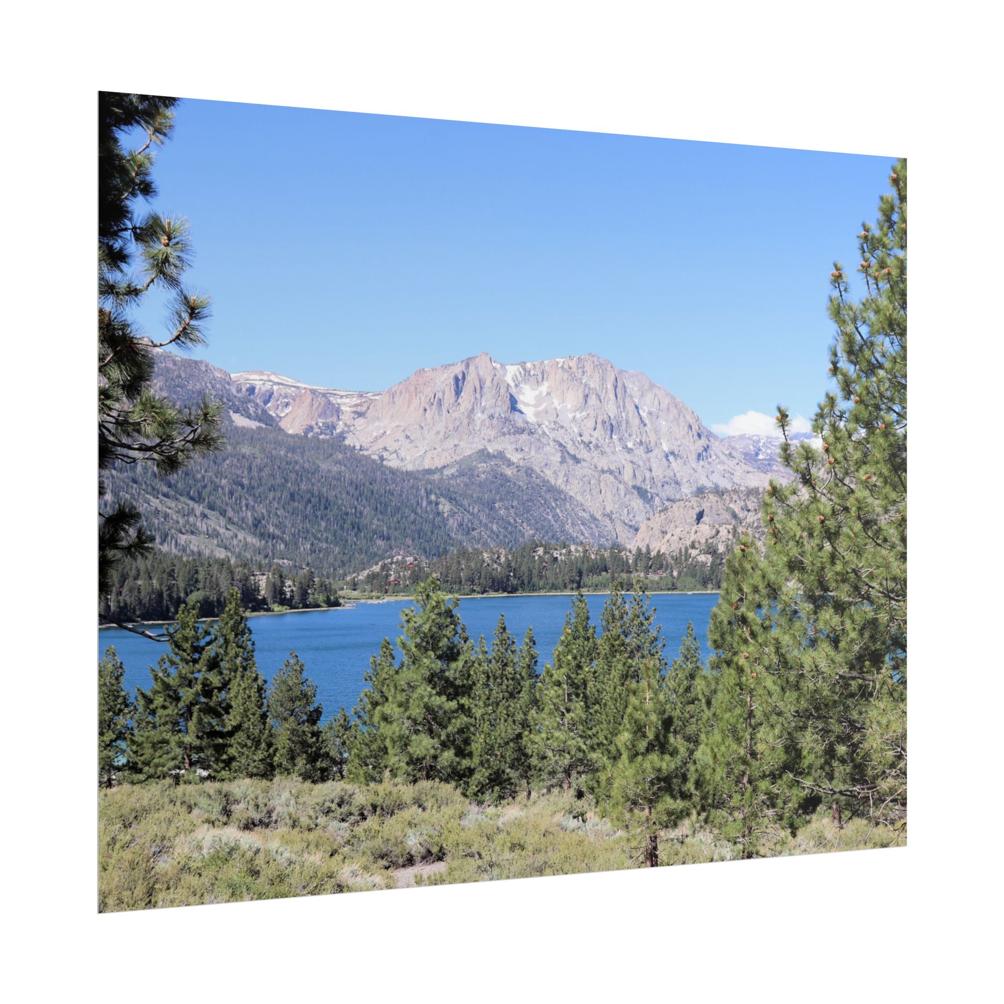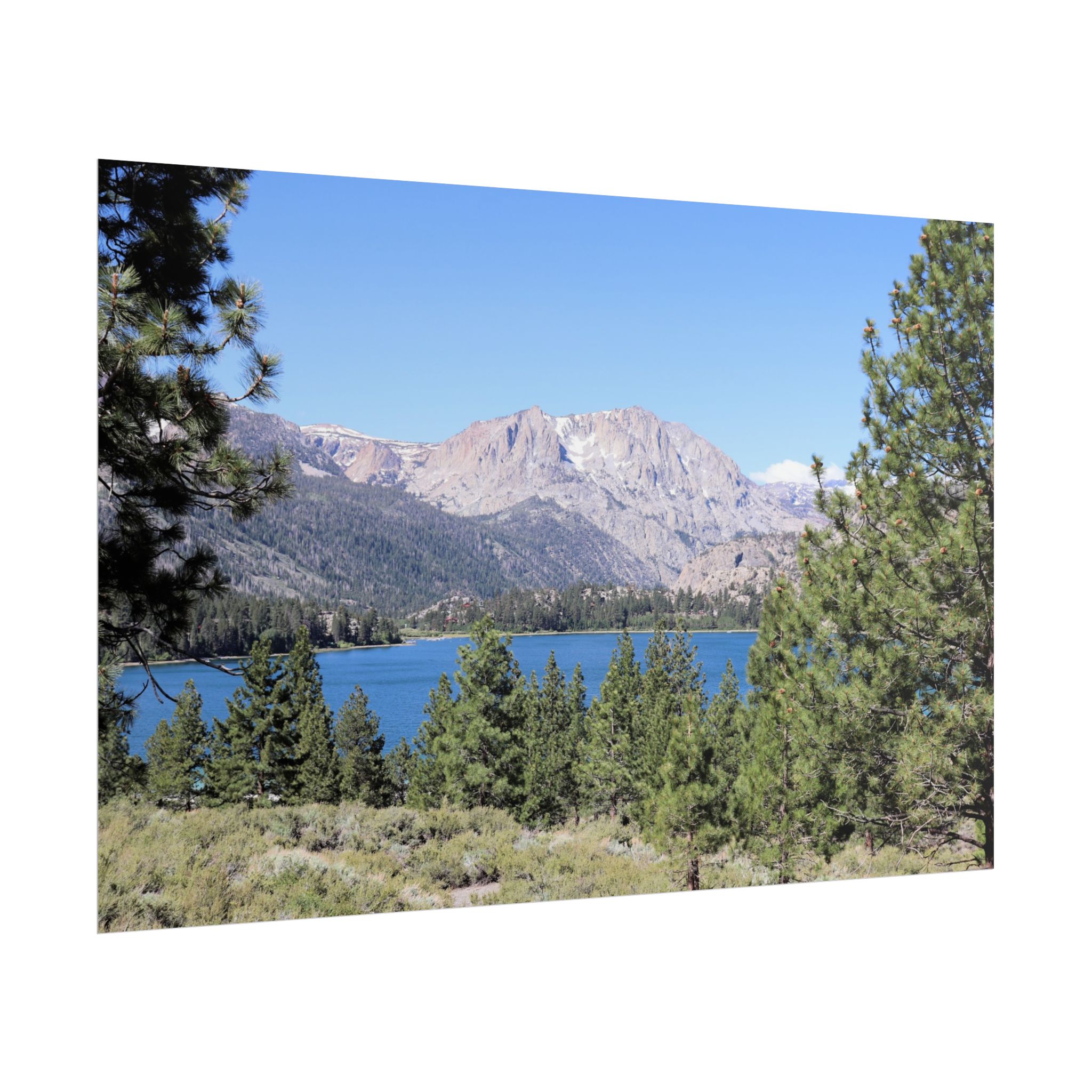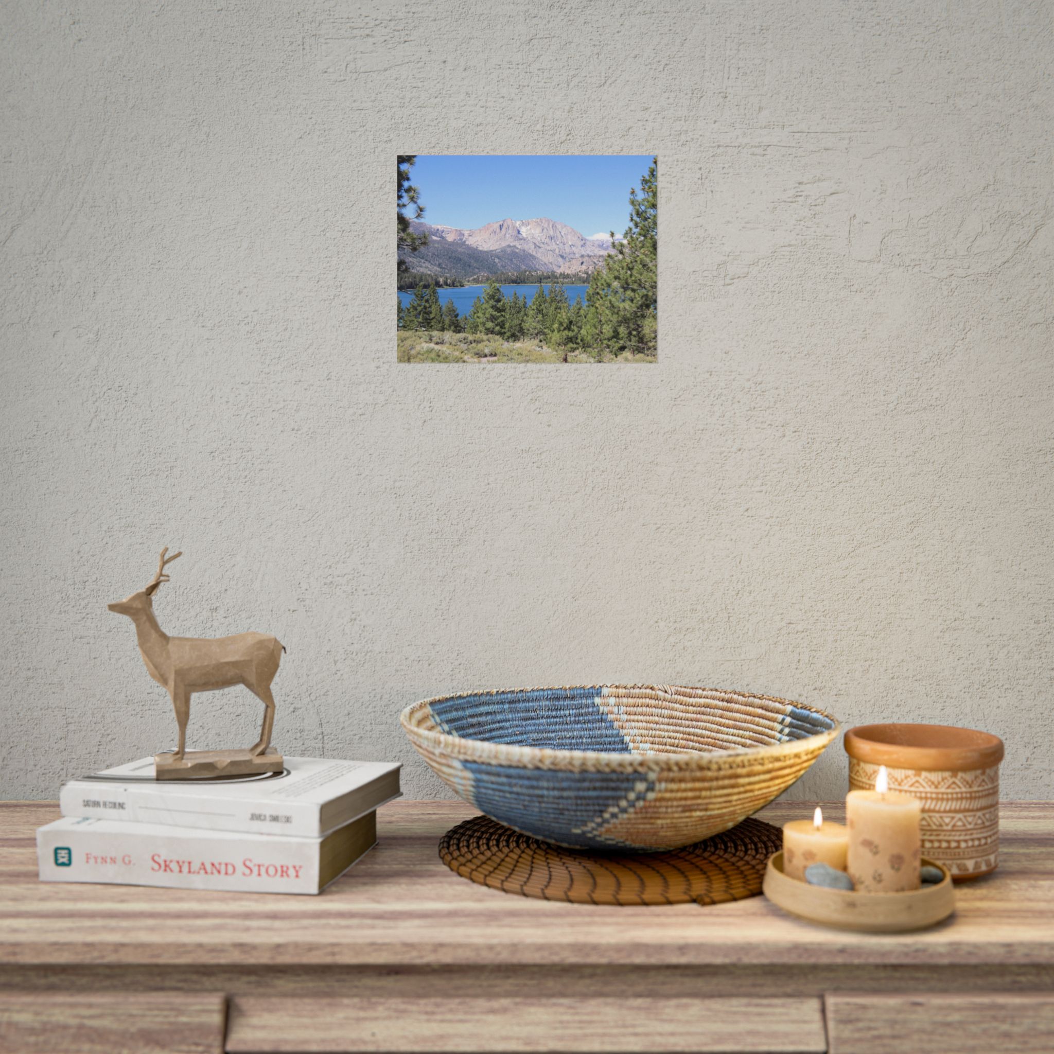 Capture the peaceful charm of the Eastern Sierra with this matte print of June Lake, where crystal-clear alpine waters meet rugged mountain peaks and lush pine forests. This stunning view showcases the deep blues of the lake framed by evergreens, with snow-dusted ridges rising in the distance under a perfect California sky.