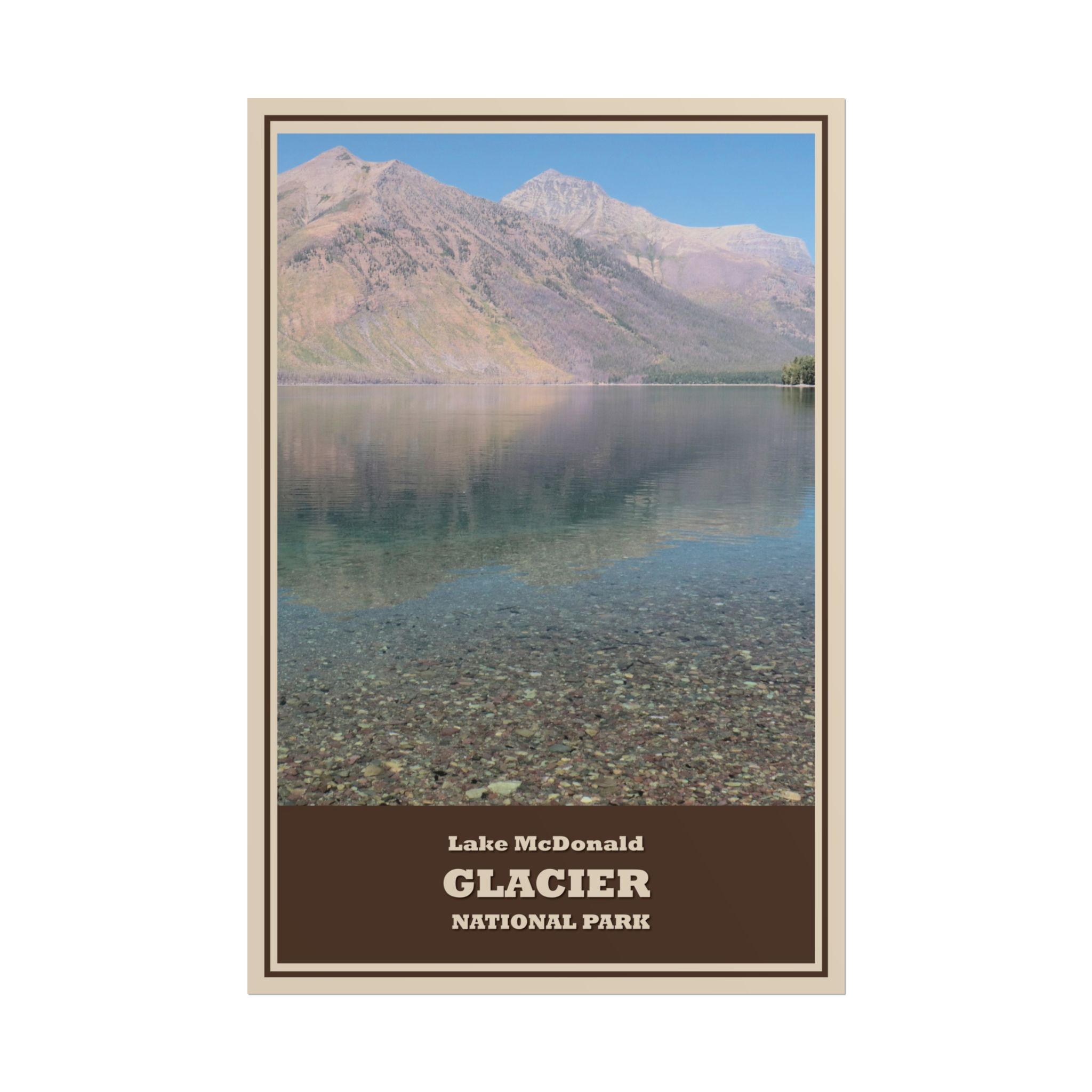 Celebrate the serene beauty of Lake McDonald, the largest lake in Glacier National Park, with this vintage-style travel poster. Known for its crystal-clear waters, colorful pebbled shoreline, and breathtaking mountain backdrop, Lake McDonald is a must-see highlight of the park. This retro-inspired design captures the peaceful spirit of Glacier, making it an ideal piece for any nature lover or traveler.