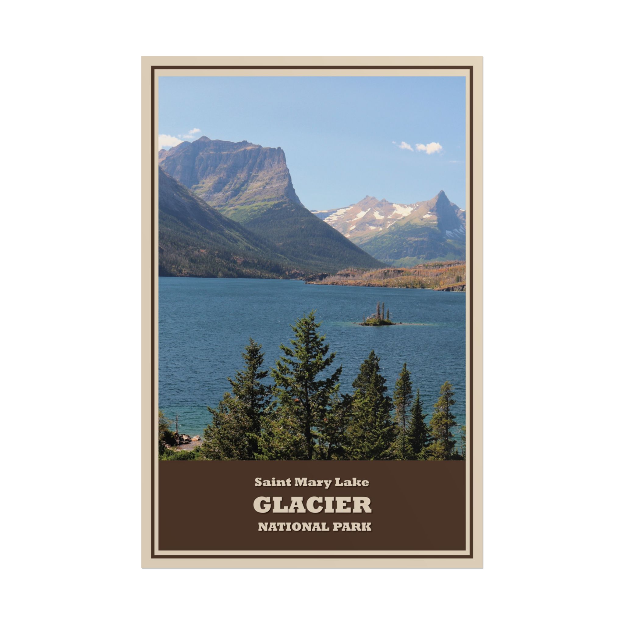 Celebrate the breathtaking beauty of Saint Mary Lake, one of the most photographed spots in Glacier National Park, with this vintage-style travel poster. Featuring stunning alpine scenery, crystal-clear waters, and the iconic Wild Goose Island, this retro-inspired artwork captures the rugged charm of Montana’s crown jewel.