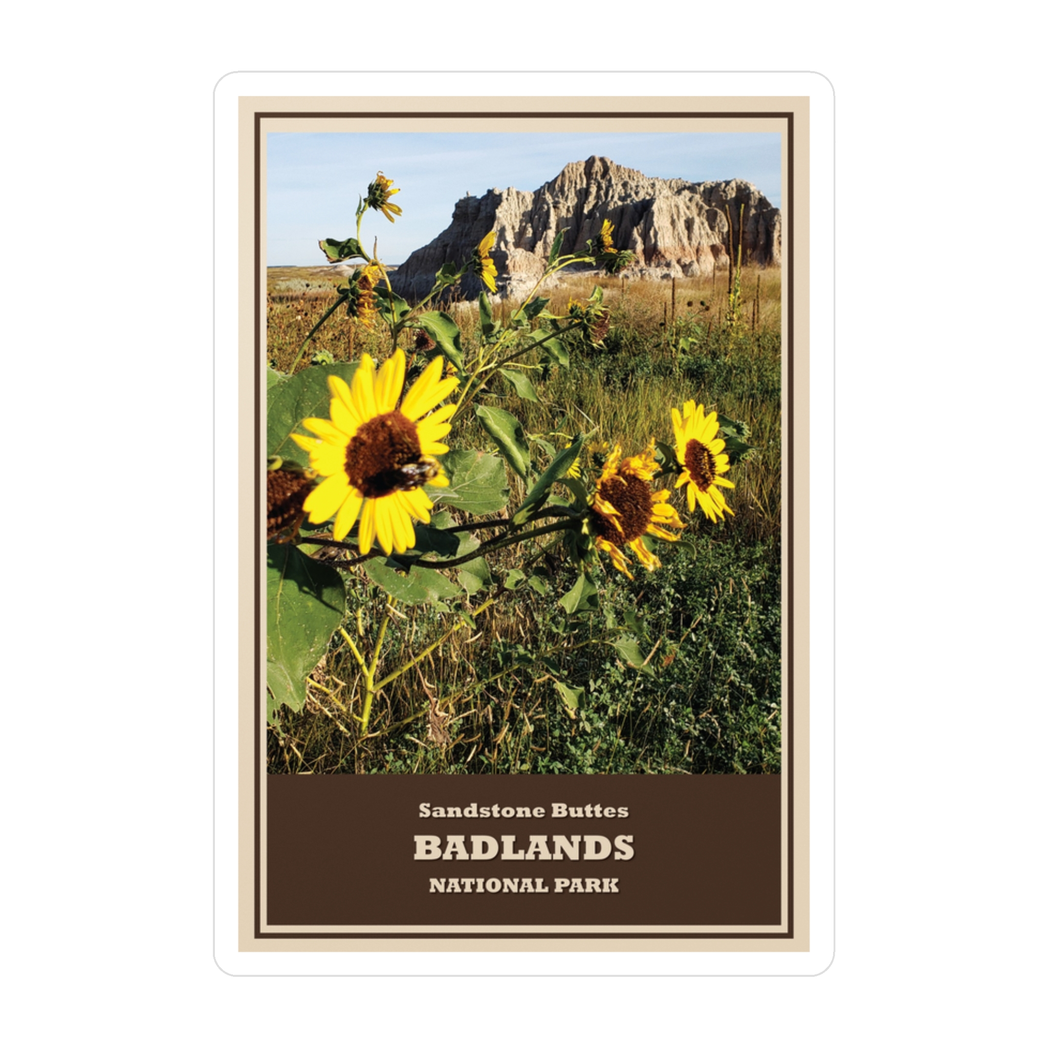Perfect for nature lovers, hikers, road-trippers, RV travelers, plant enthusiasts, and collectors of national park memorabilia, this sticker brings a touch of prairie sunshine wherever you go. The classic framed design gives it the feel of a retro field-guide plate or WPA-era travel poster—ideal for anyone who loves wildflowers or the rugged charm of the Badlands.