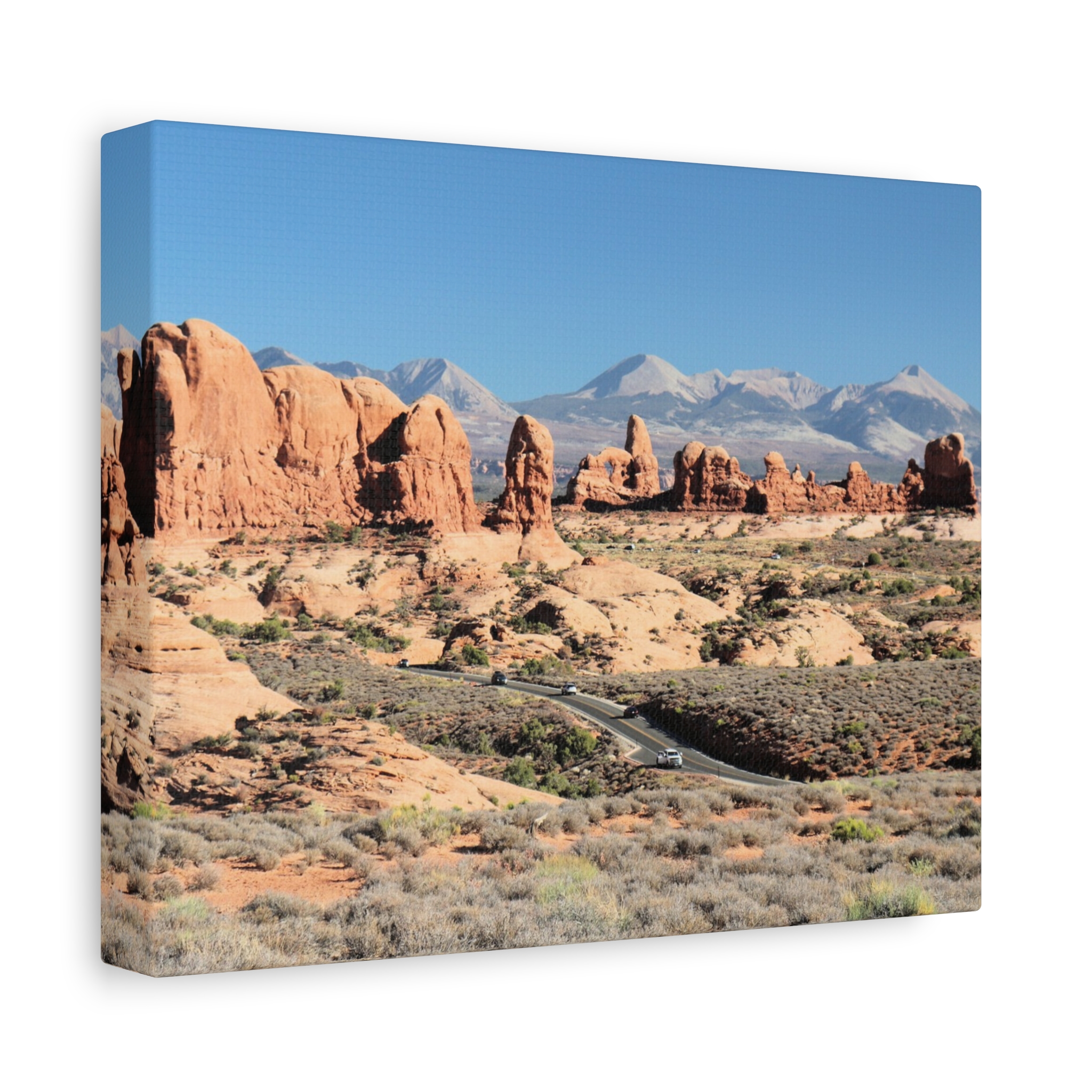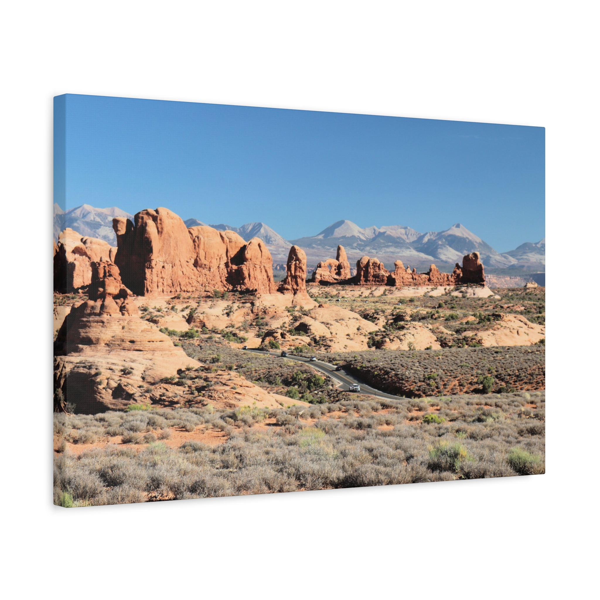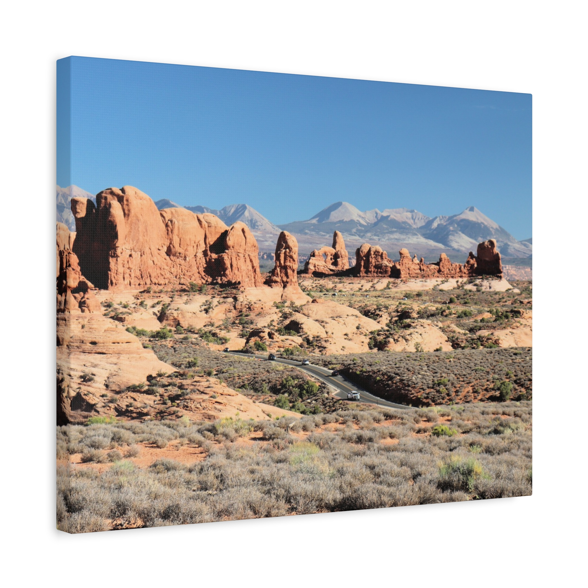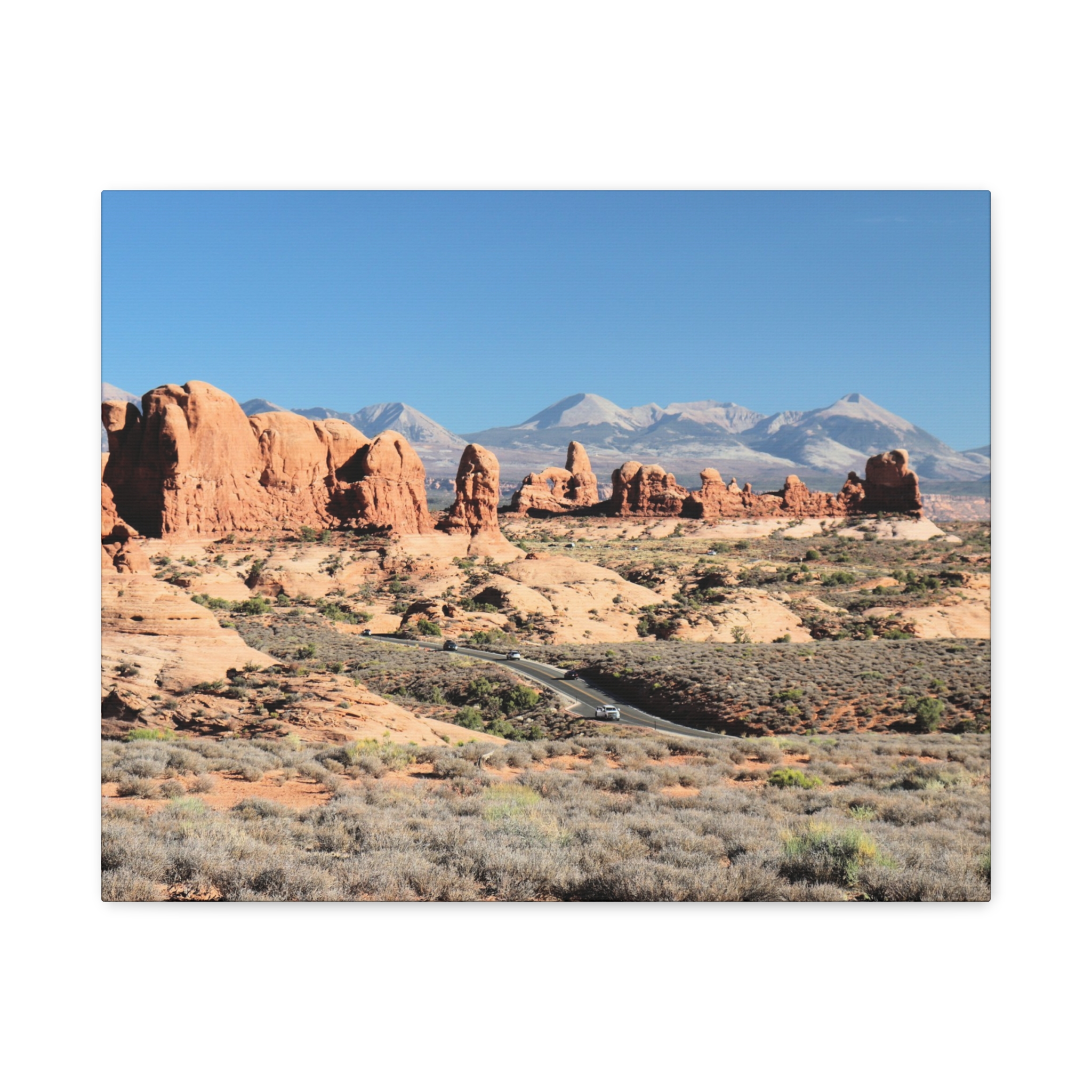 Transform your home into a desert sanctuary with this wrapped canvas print of The Windows at Arches National Park in Moab, Utah. This photograph highlights the dramatic red sandstone formations, sculpted by nature into sweeping arches and towers, with the La Sal Mountains rising in the background under a brilliant sky. A statement piece for any space, it brings the warm, rugged beauty of Utah’s national parks into your living room, office, or cabin retreat.
