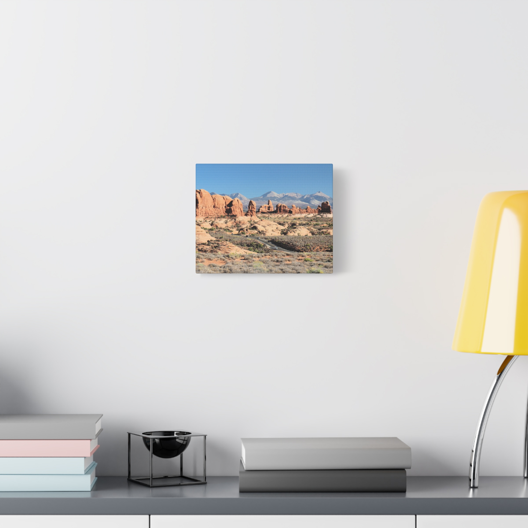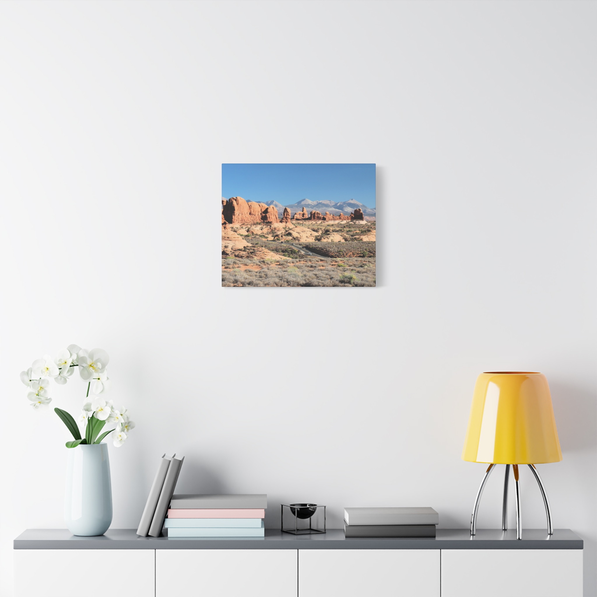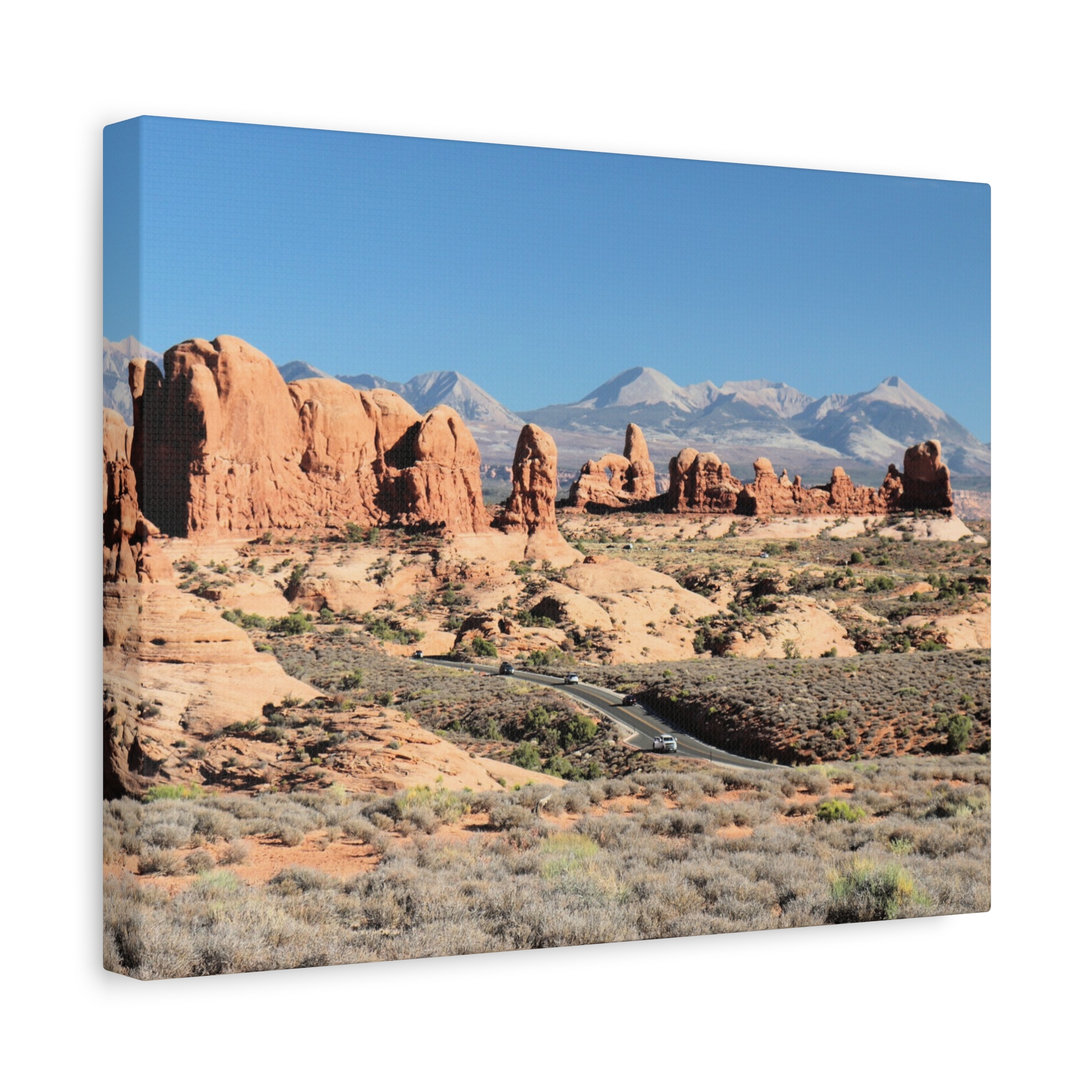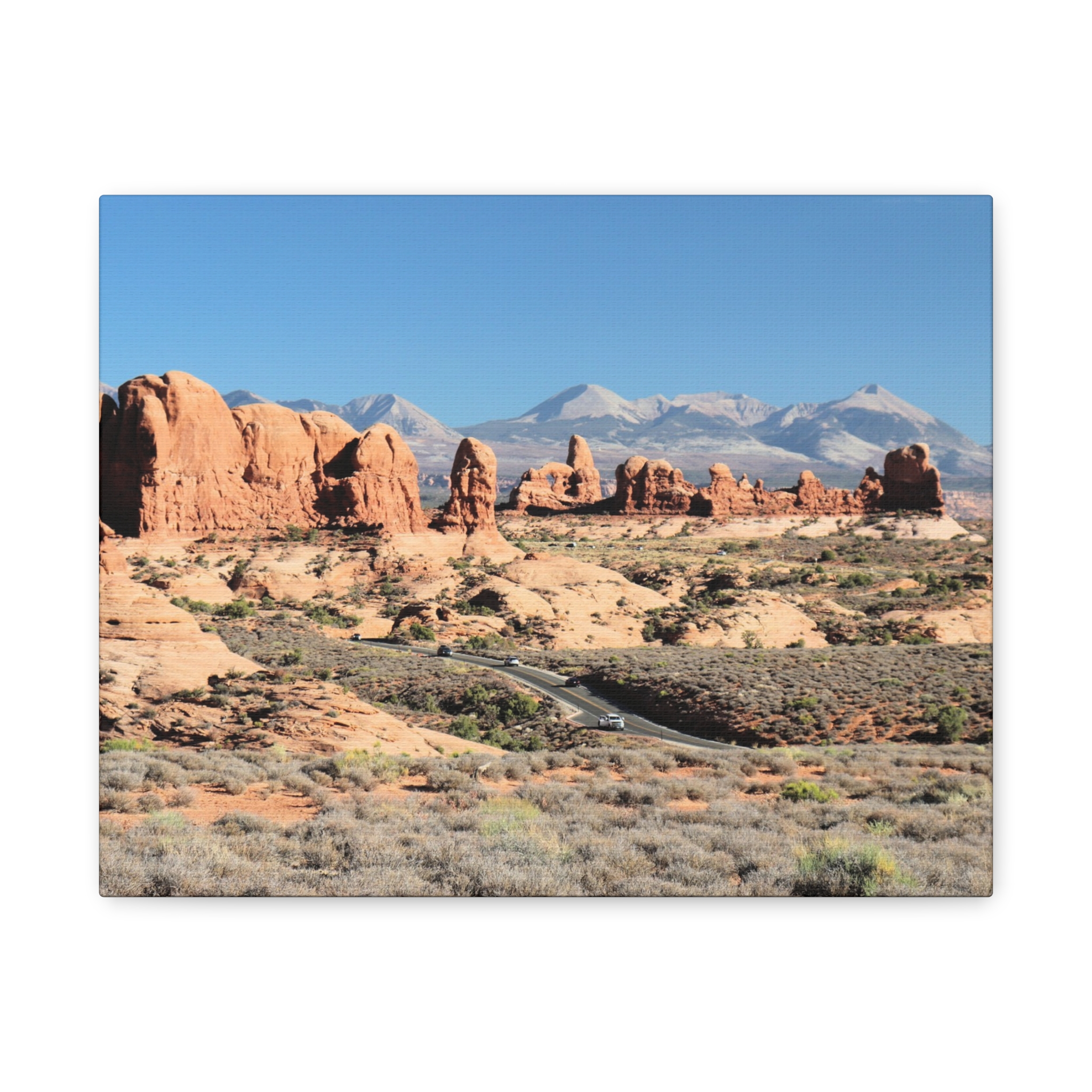 Transform your home into a desert sanctuary with this wrapped canvas print of The Windows at Arches National Park in Moab, Utah. This photograph highlights the dramatic red sandstone formations, sculpted by nature into sweeping arches and towers, with the La Sal Mountains rising in the background under a brilliant sky. A statement piece for any space, it brings the warm, rugged beauty of Utah’s national parks into your living room, office, or cabin retreat.
