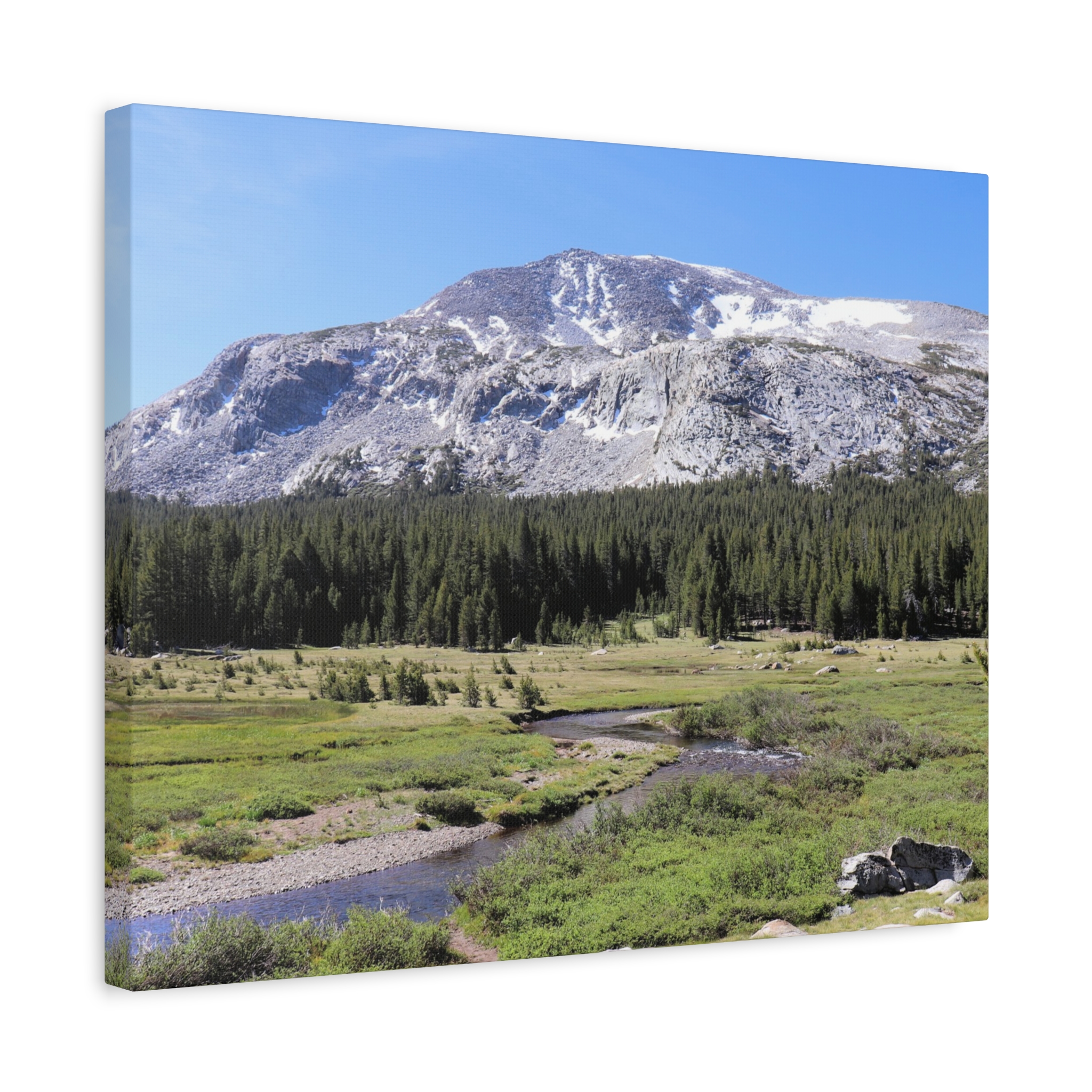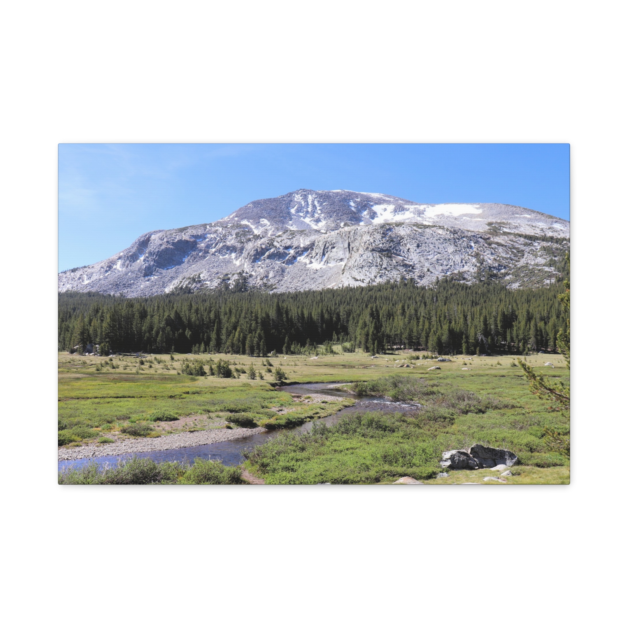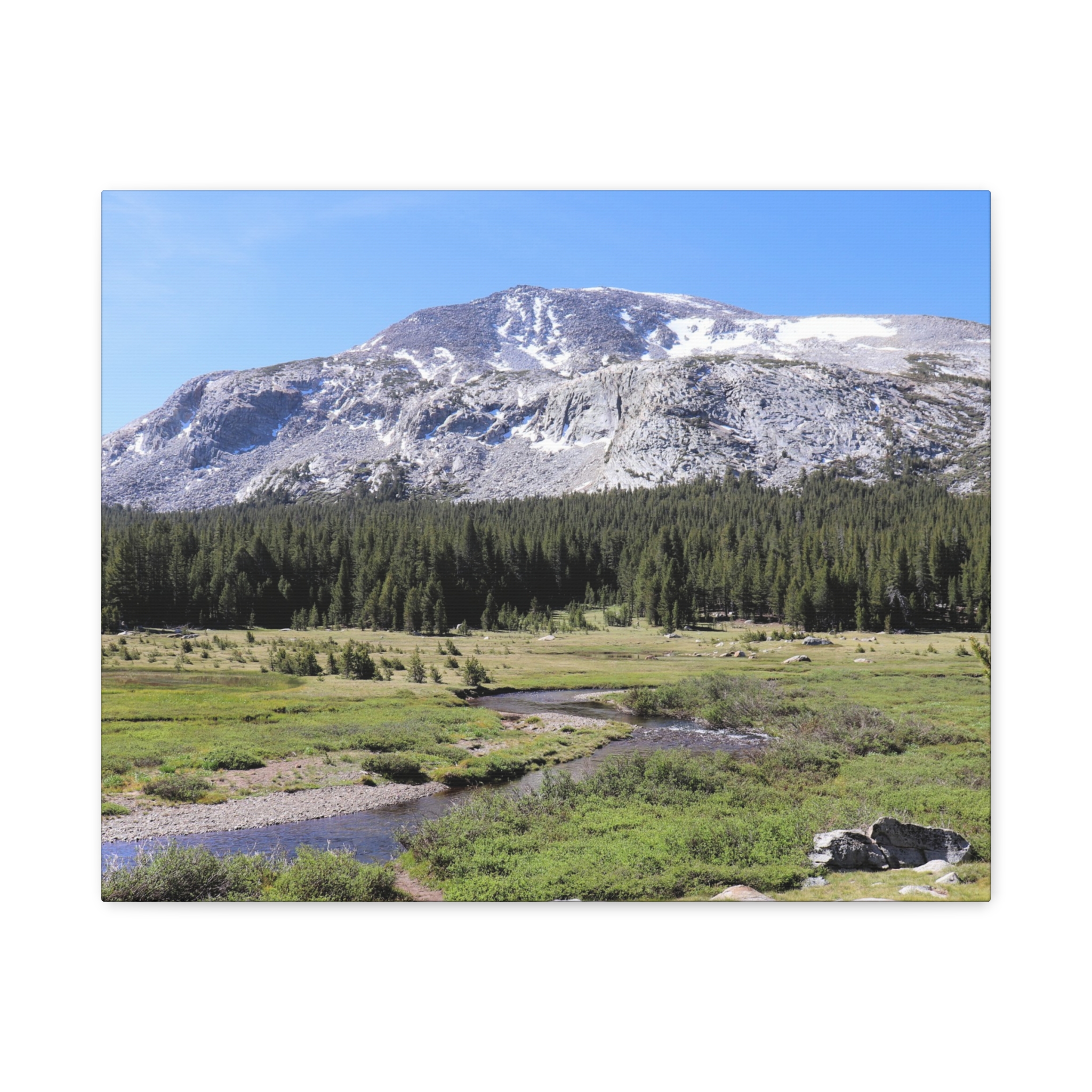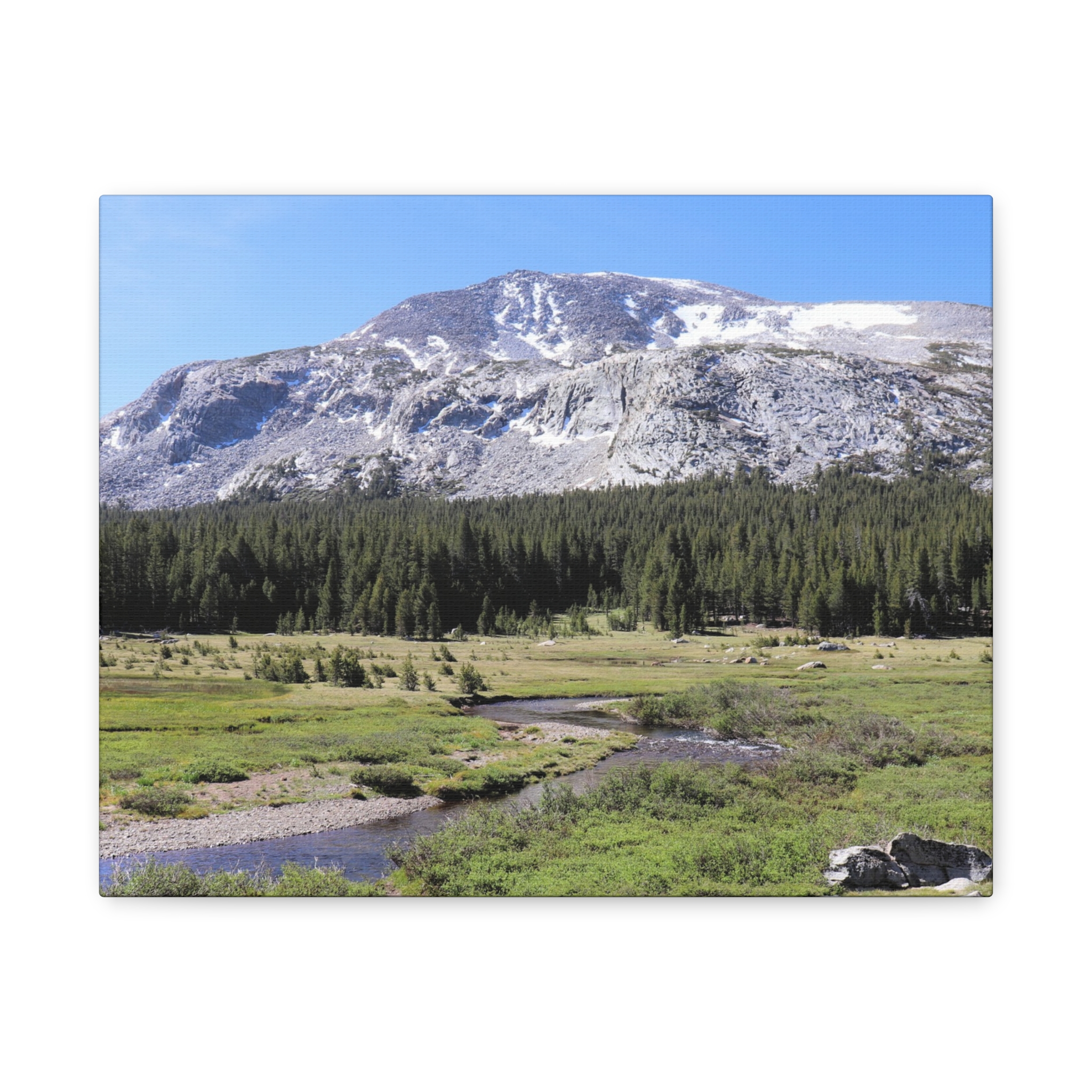 Bring the serene beauty of Yosemite’s high country into your home with this wrapped canvas print of Tuolumne Meadows. Snow-dusted peaks rise above lush meadows and winding alpine streams, with deep green pines completing this peaceful Sierra Nevada vista. The crisp blue sky and sunlit details make this piece a natural focal point for any room.