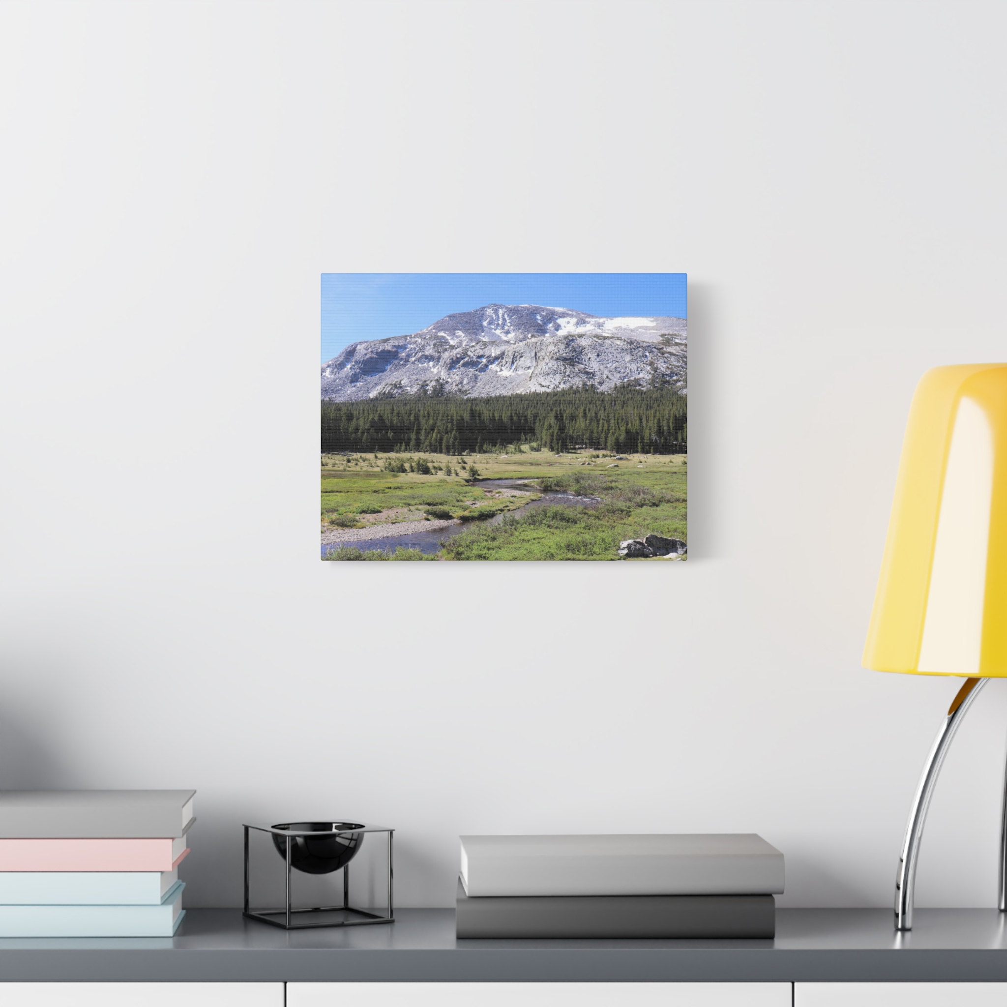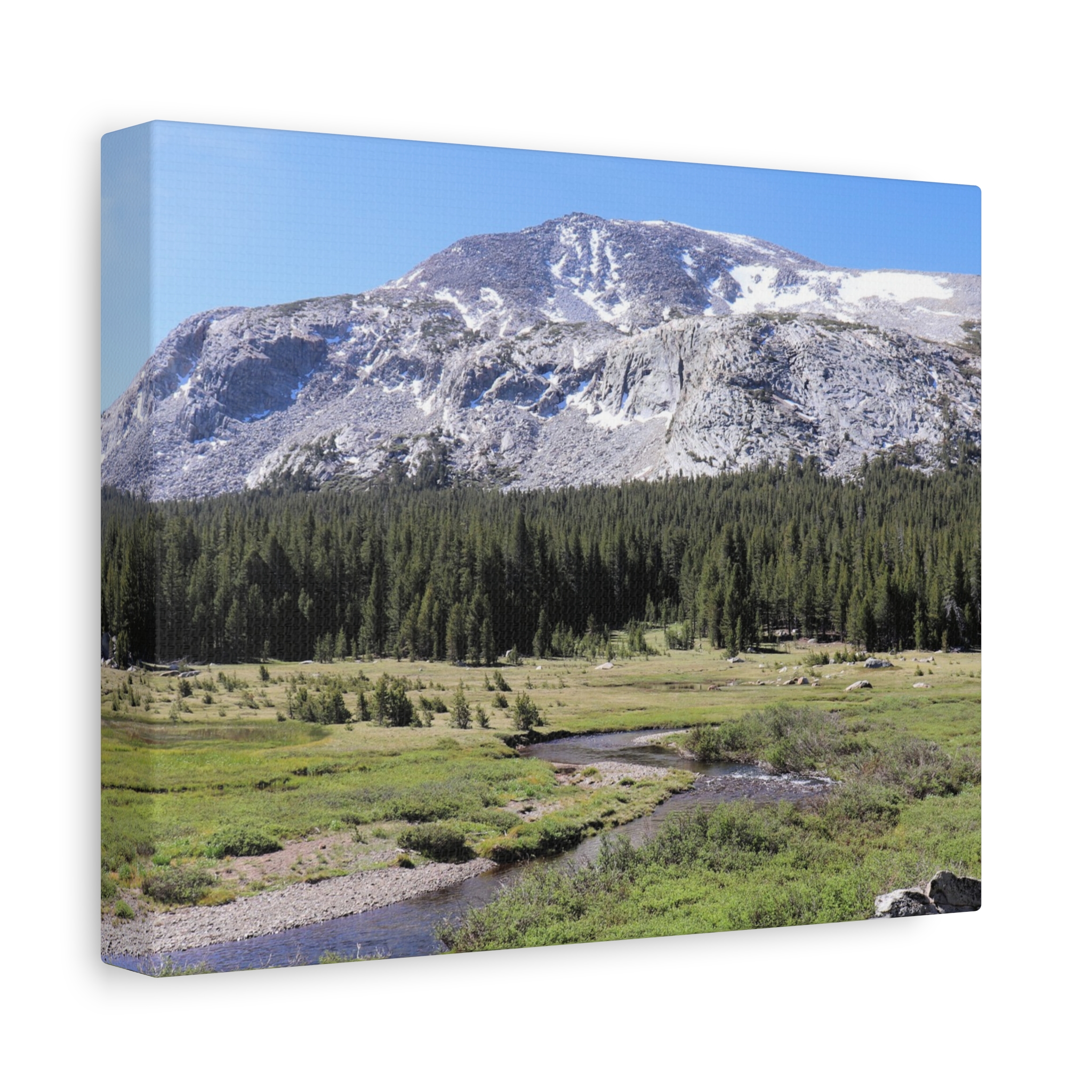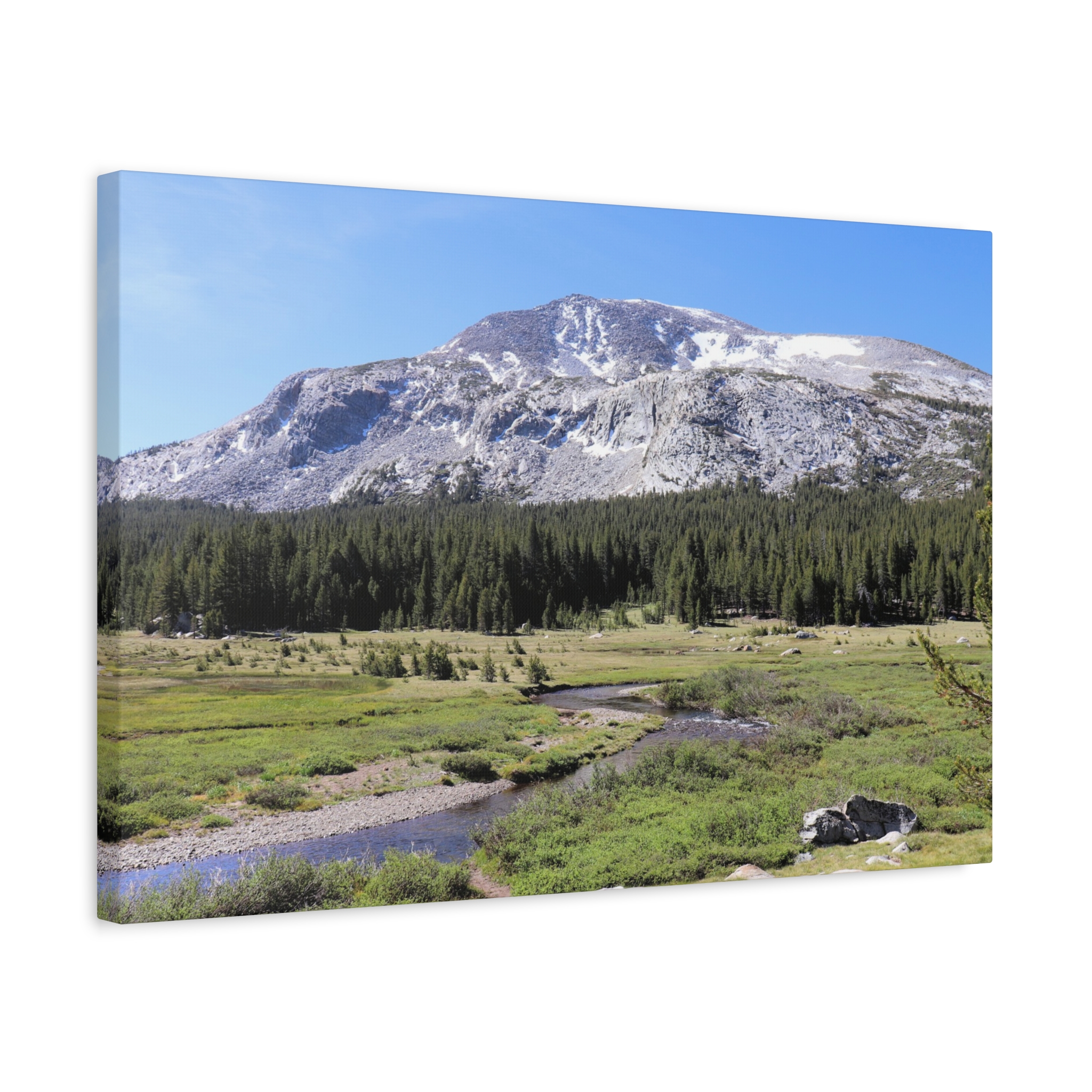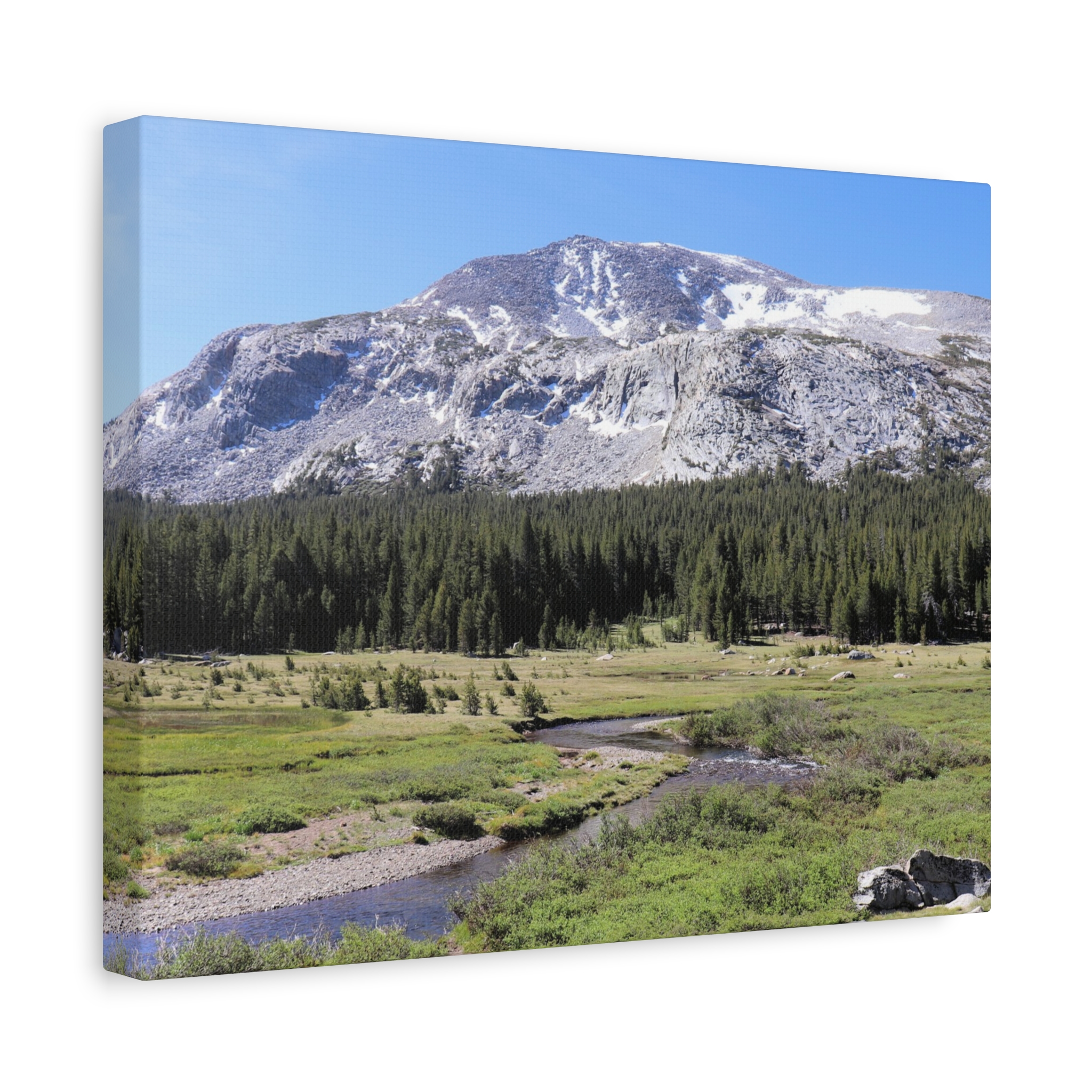 Bring the serene beauty of Yosemite’s high country into your home with this wrapped canvas print of Tuolumne Meadows. Snow-dusted peaks rise above lush meadows and winding alpine streams, with deep green pines completing this peaceful Sierra Nevada vista. The crisp blue sky and sunlit details make this piece a natural focal point for any room.