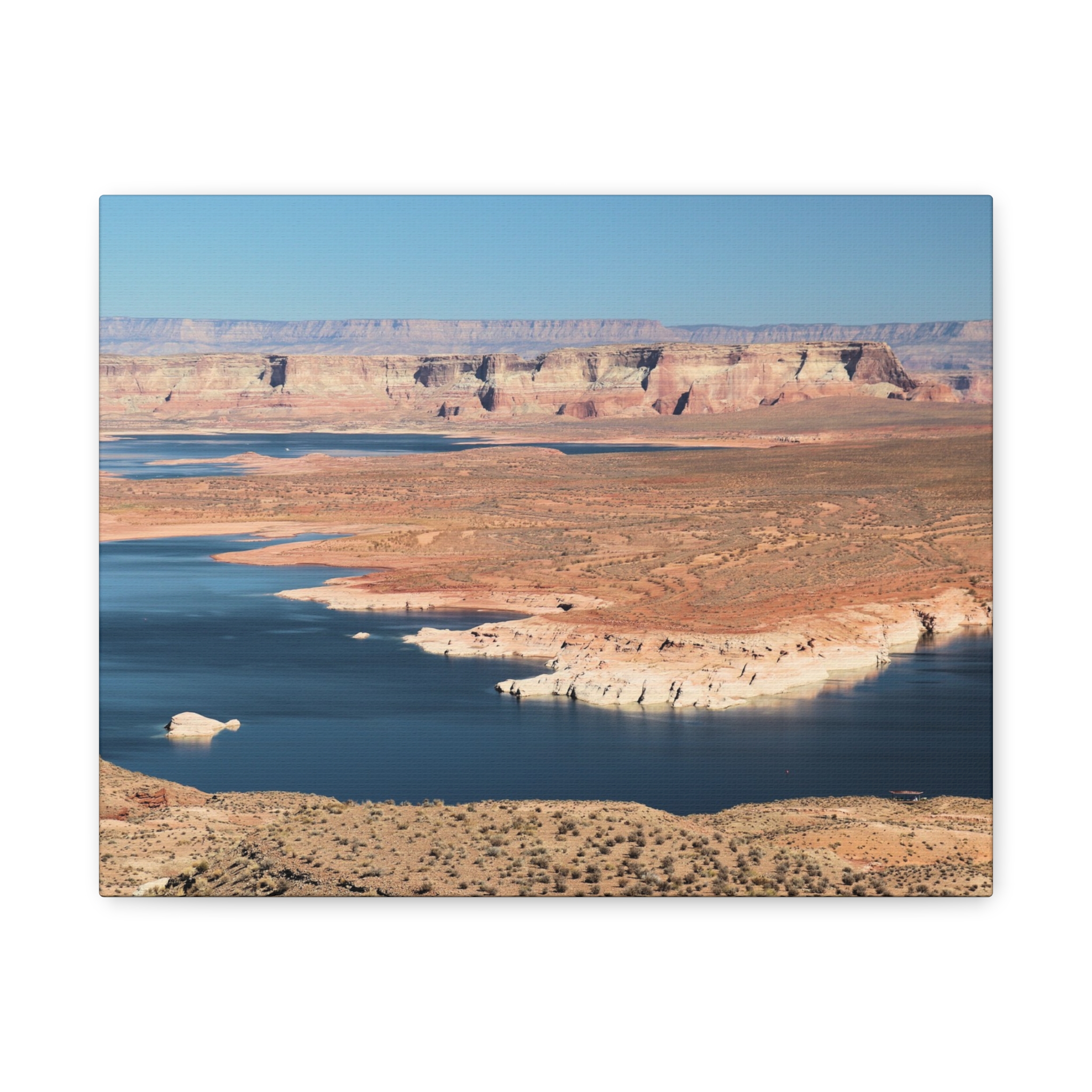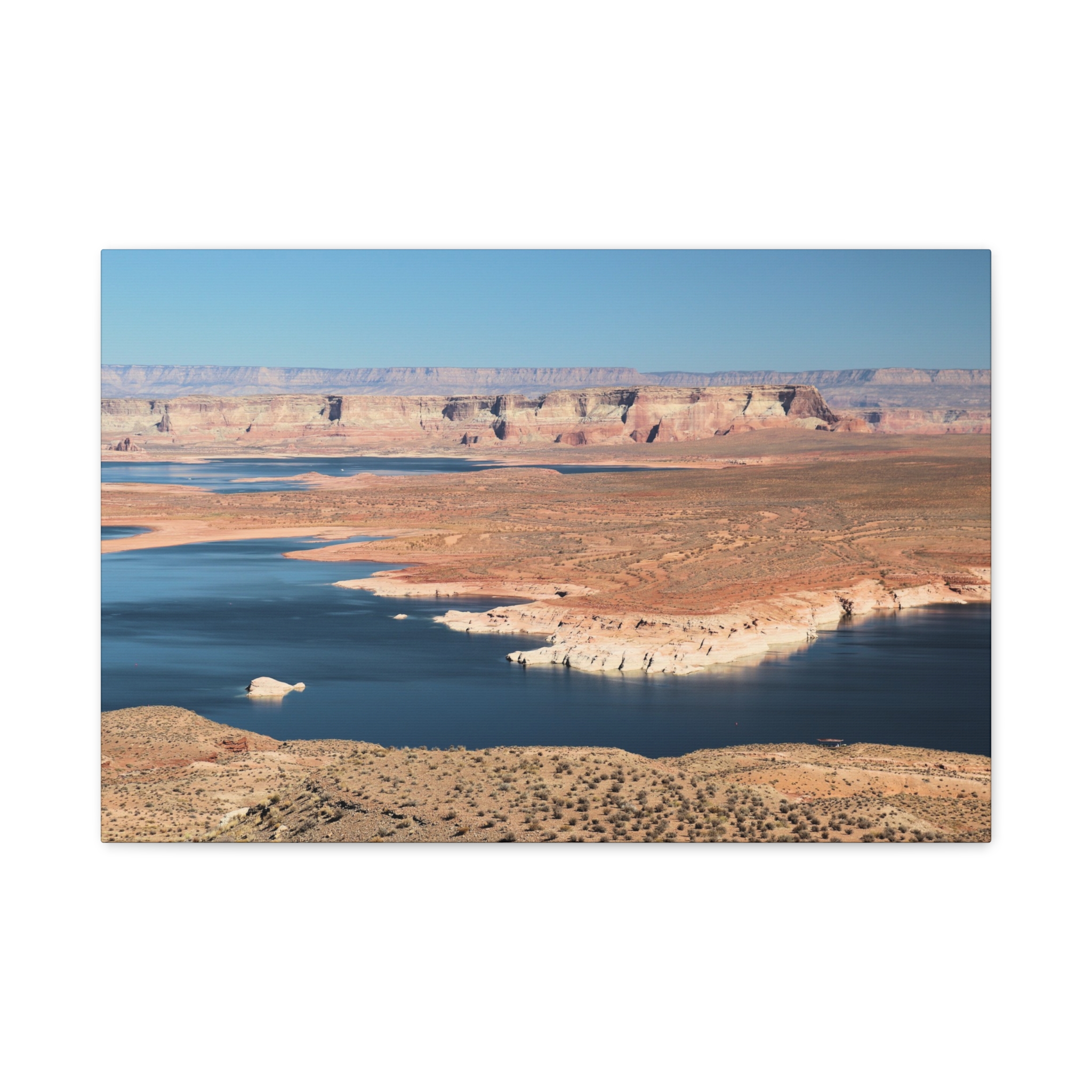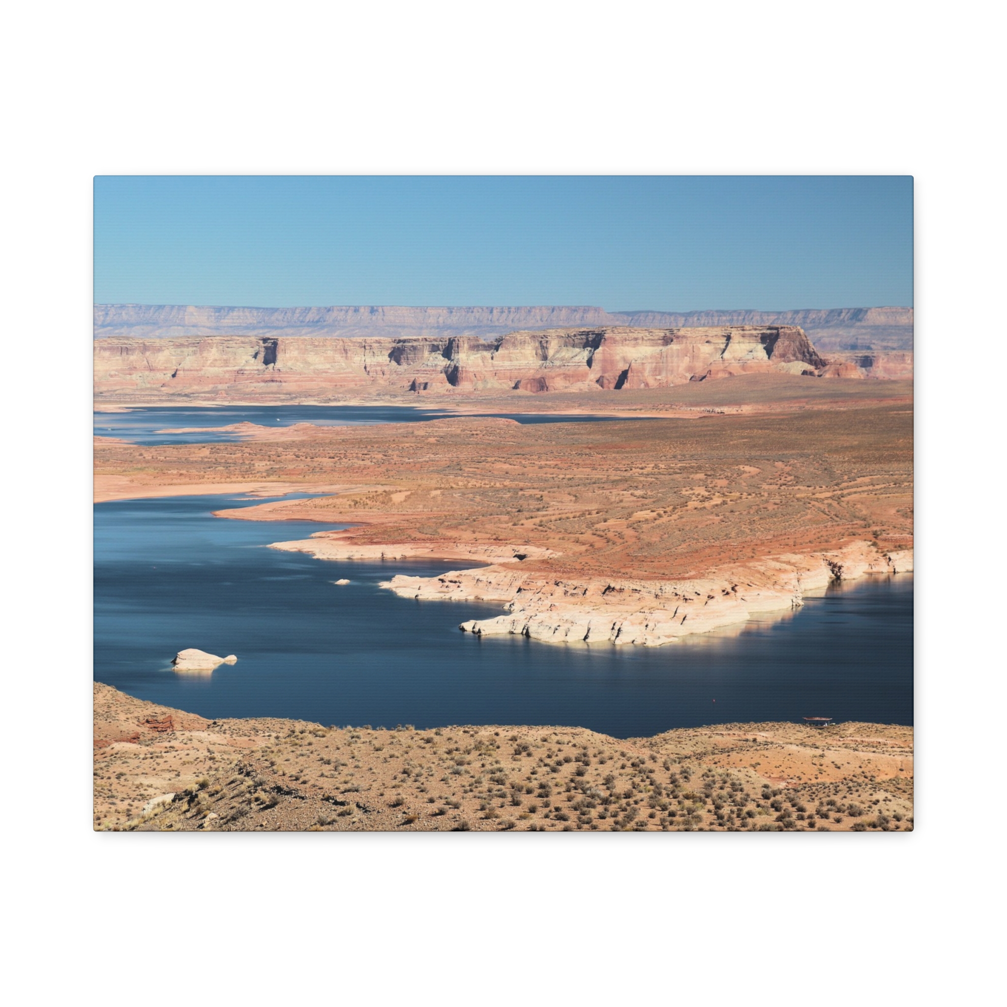 Bring the dramatic beauty of the desert and water together with this wrapped canvas print of Wahweap Bay on Lake Powell, located in Glen Canyon National Recreation Area, Northern Arizona. The deep blue waters wind through warm sandstone cliffs, set beneath a cloudless Southwestern sky — a scene of peaceful contrast and timeless wonder.
