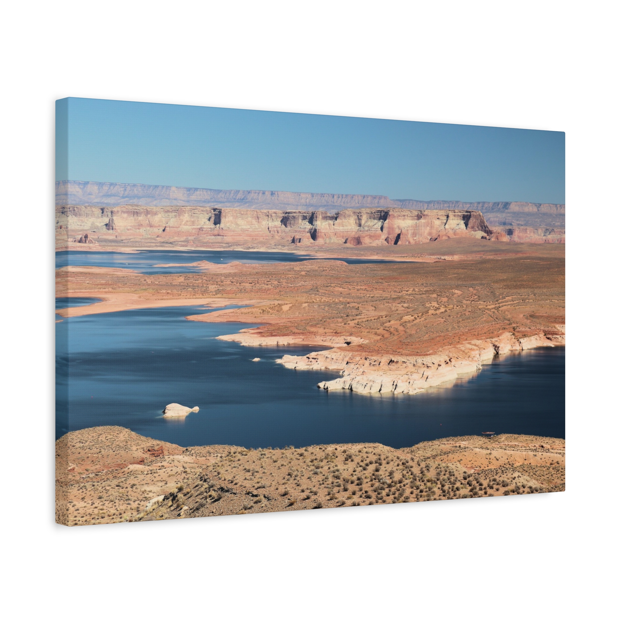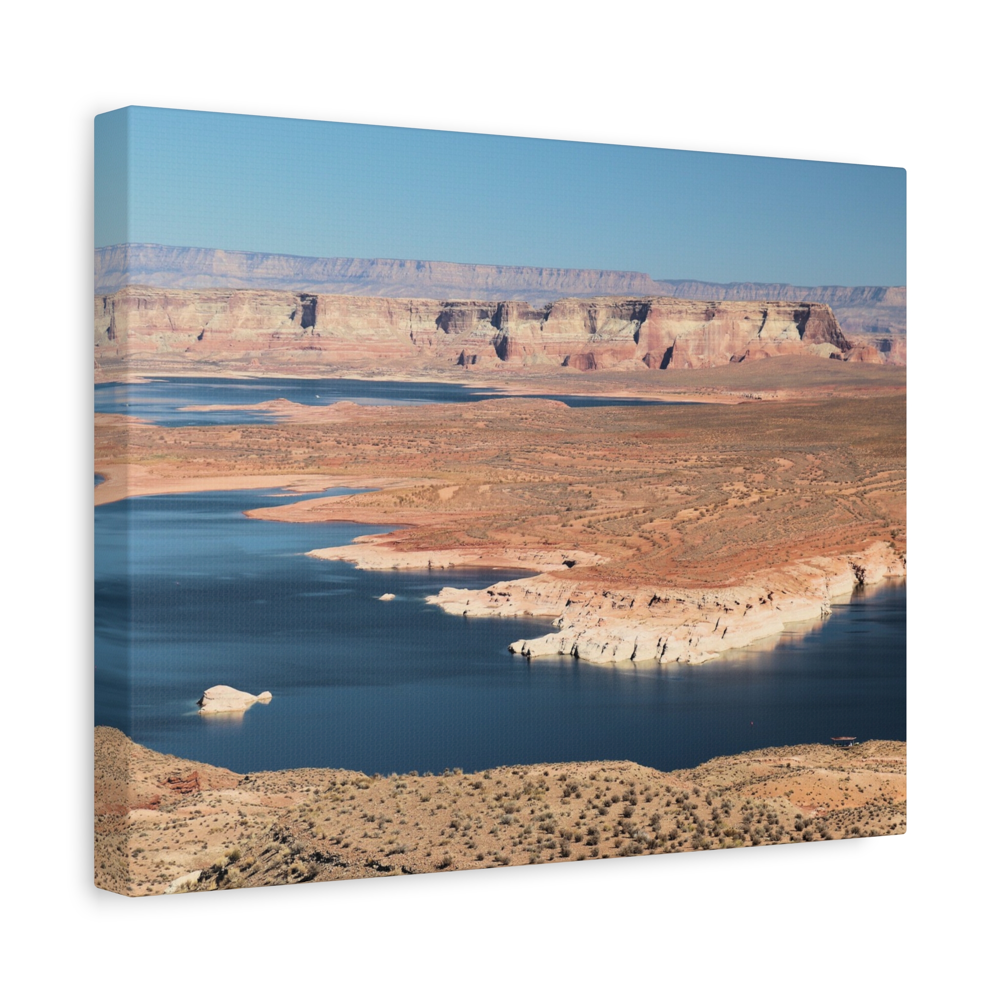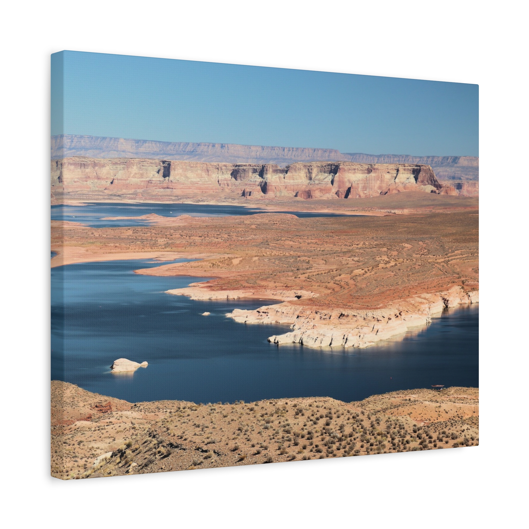 Bring the dramatic beauty of the desert and water together with this wrapped canvas print of Wahweap Bay on Lake Powell, located in Glen Canyon National Recreation Area, Northern Arizona. The deep blue waters wind through warm sandstone cliffs, set beneath a cloudless Southwestern sky — a scene of peaceful contrast and timeless wonder.