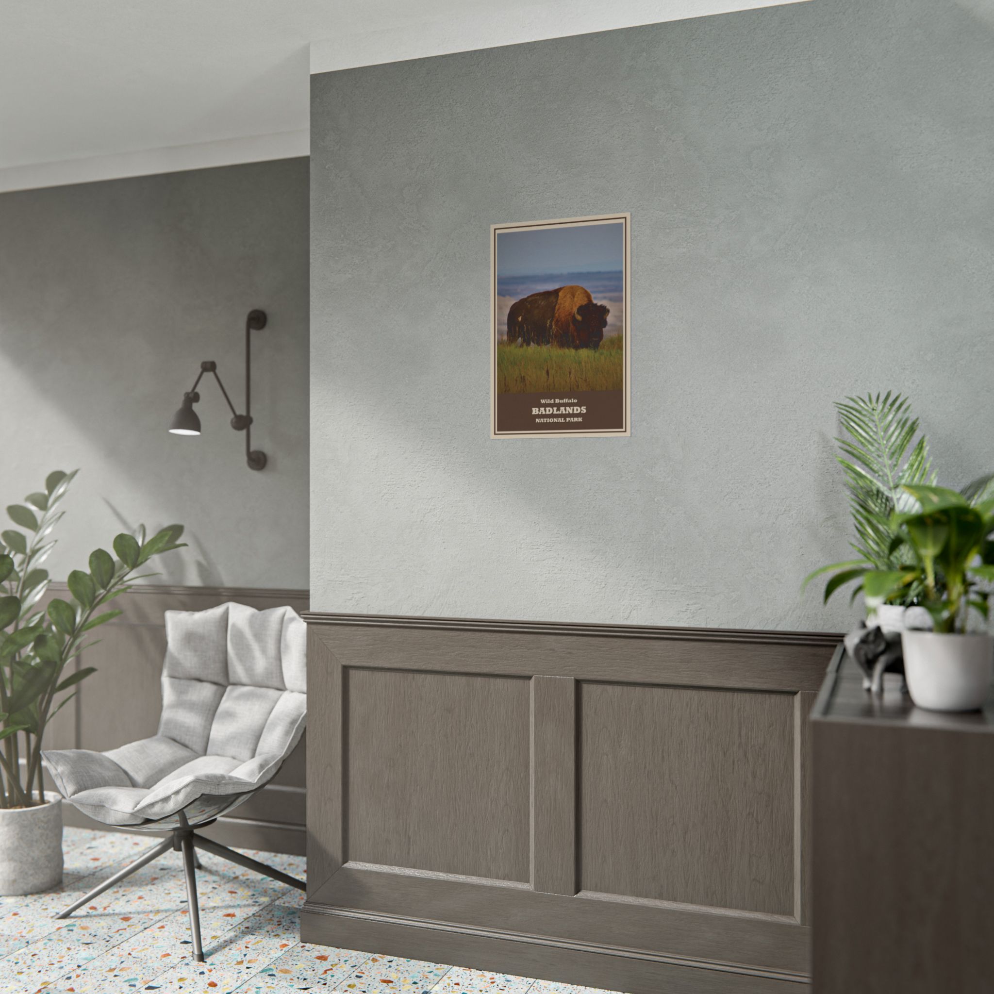 Celebrate the power and majesty of the American bison with this vintage-inspired Wild Buffalo travel poster from Badlands National Park. Featuring a magnificent buffalo grazing on the park’s sweeping prairie with the rugged buttes fading into the distance, this artwork beautifully captures the untamed spirit of the American West.