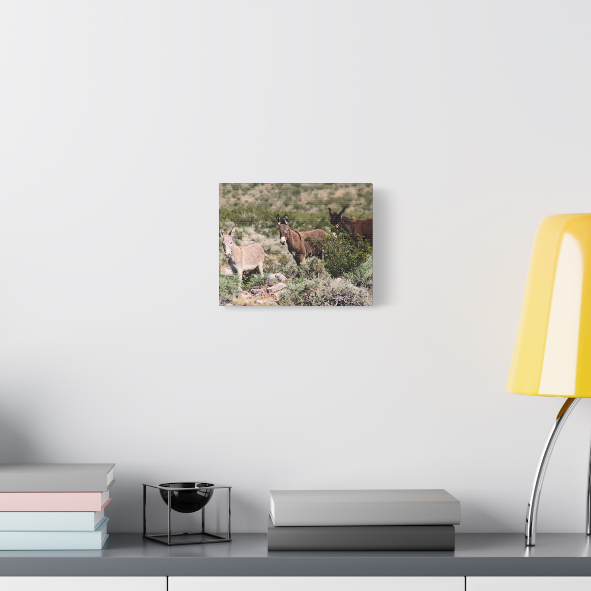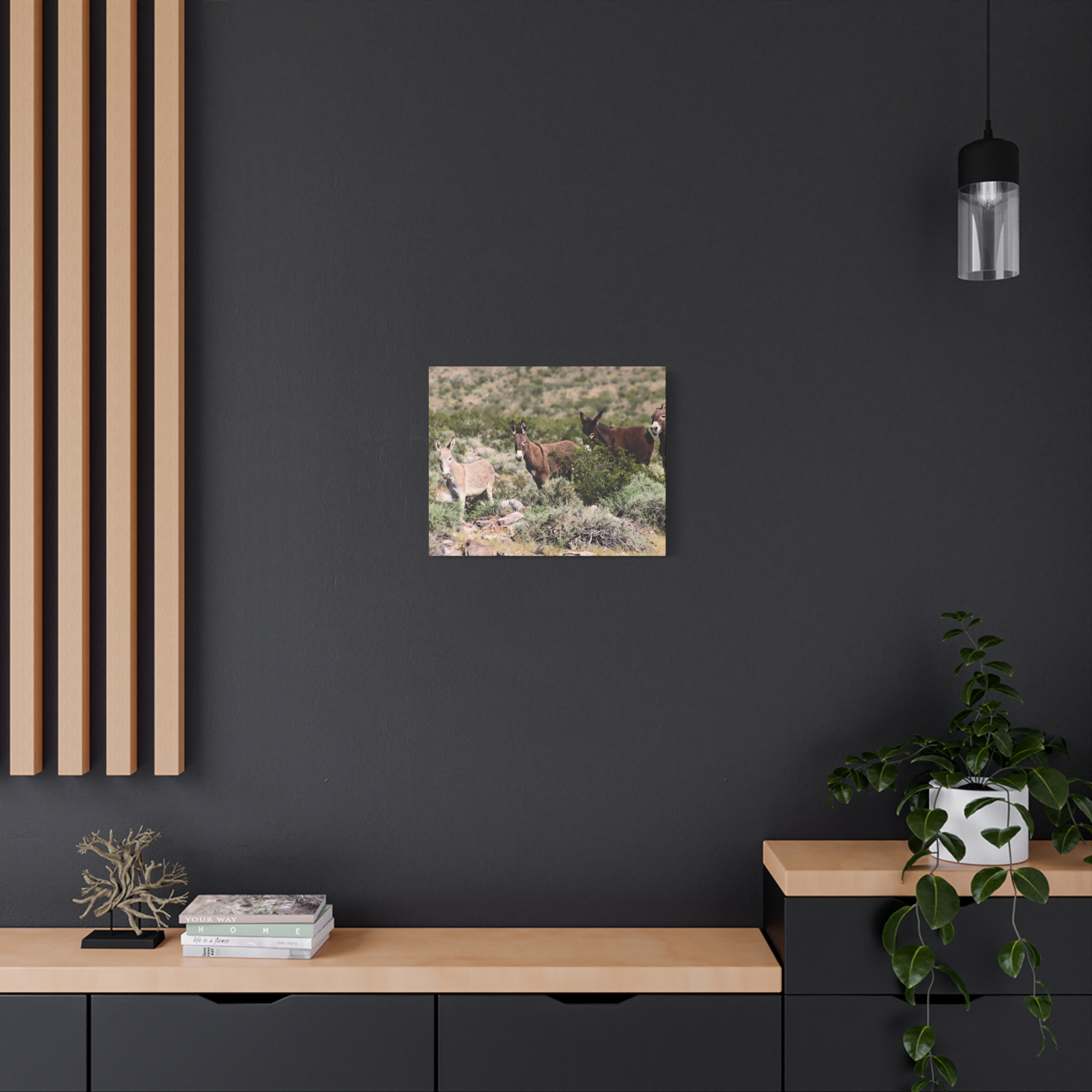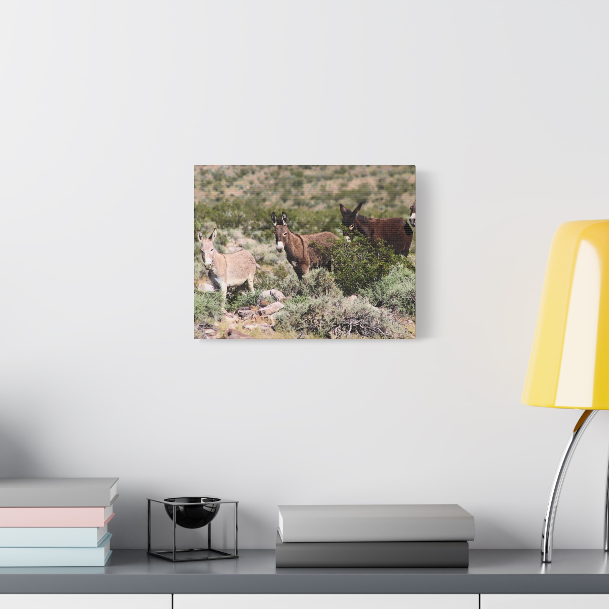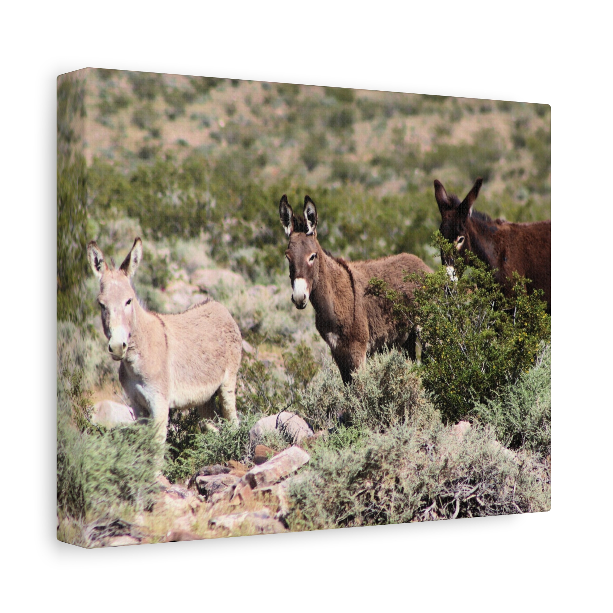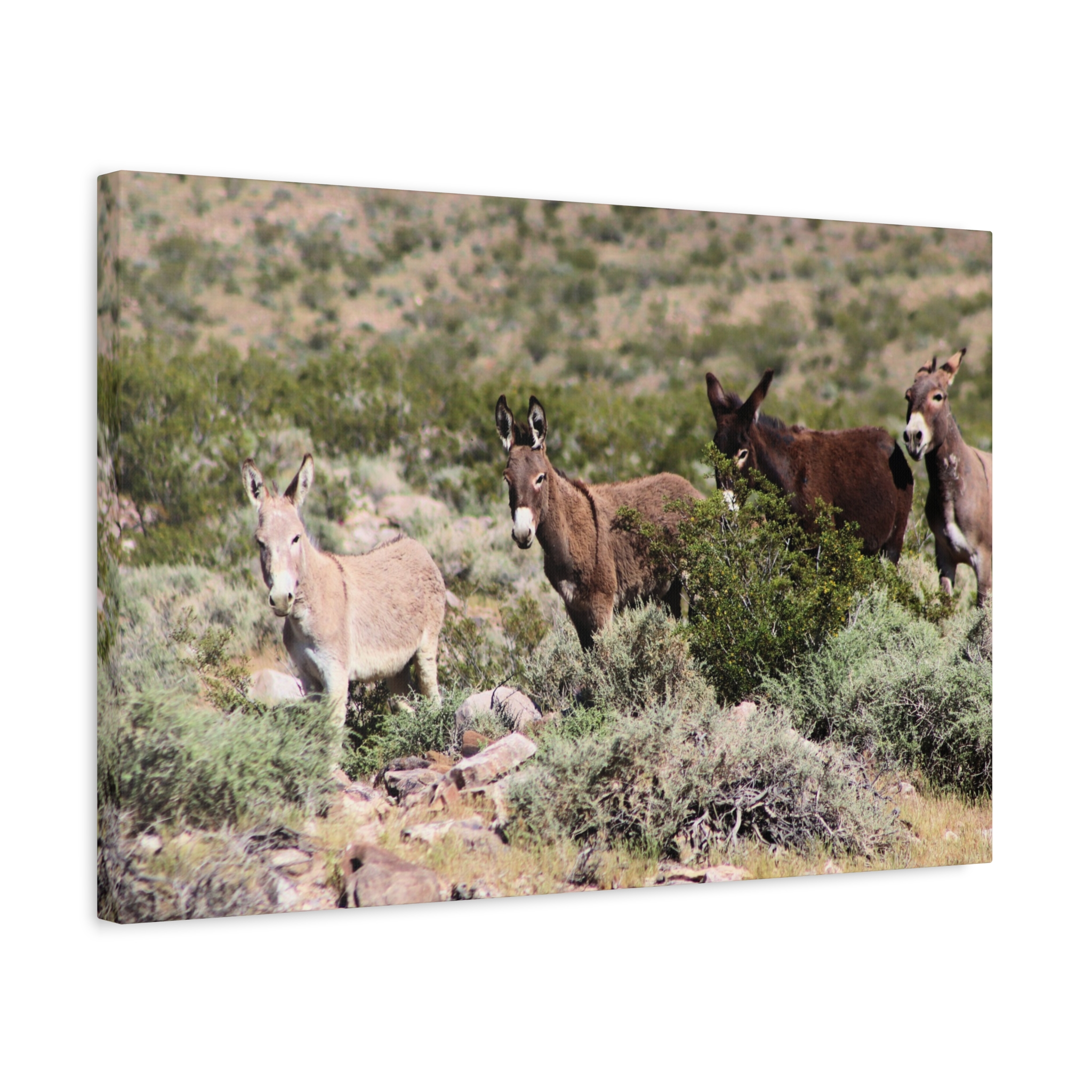Bring the warmth and resilience of the Nevada desert into your home with this wrapped canvas of a wild donkey family. Surrounded by sagebrush and rocky desert terrain, these free-roaming burros represent family bonds, strength, and the enduring spirit of the American West.