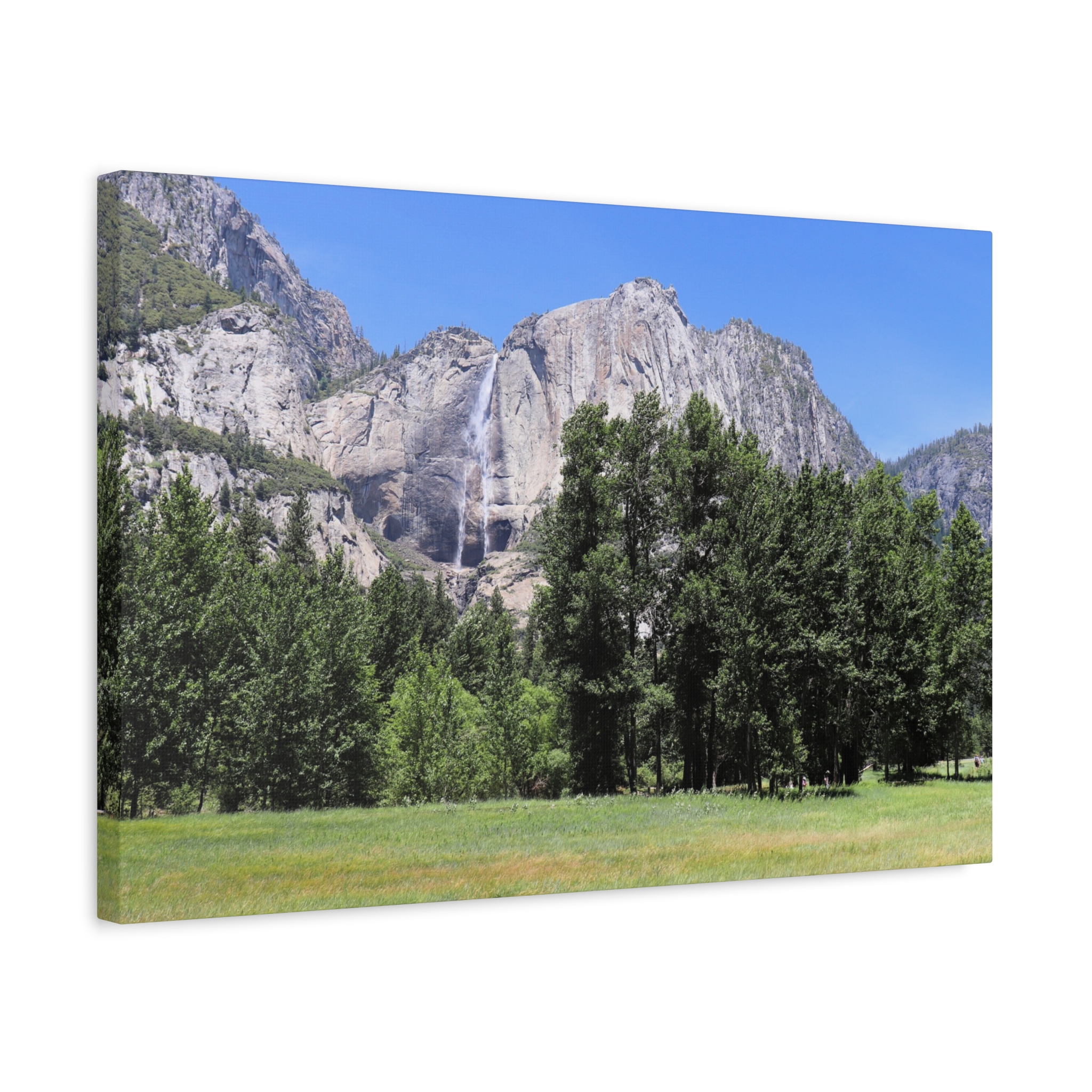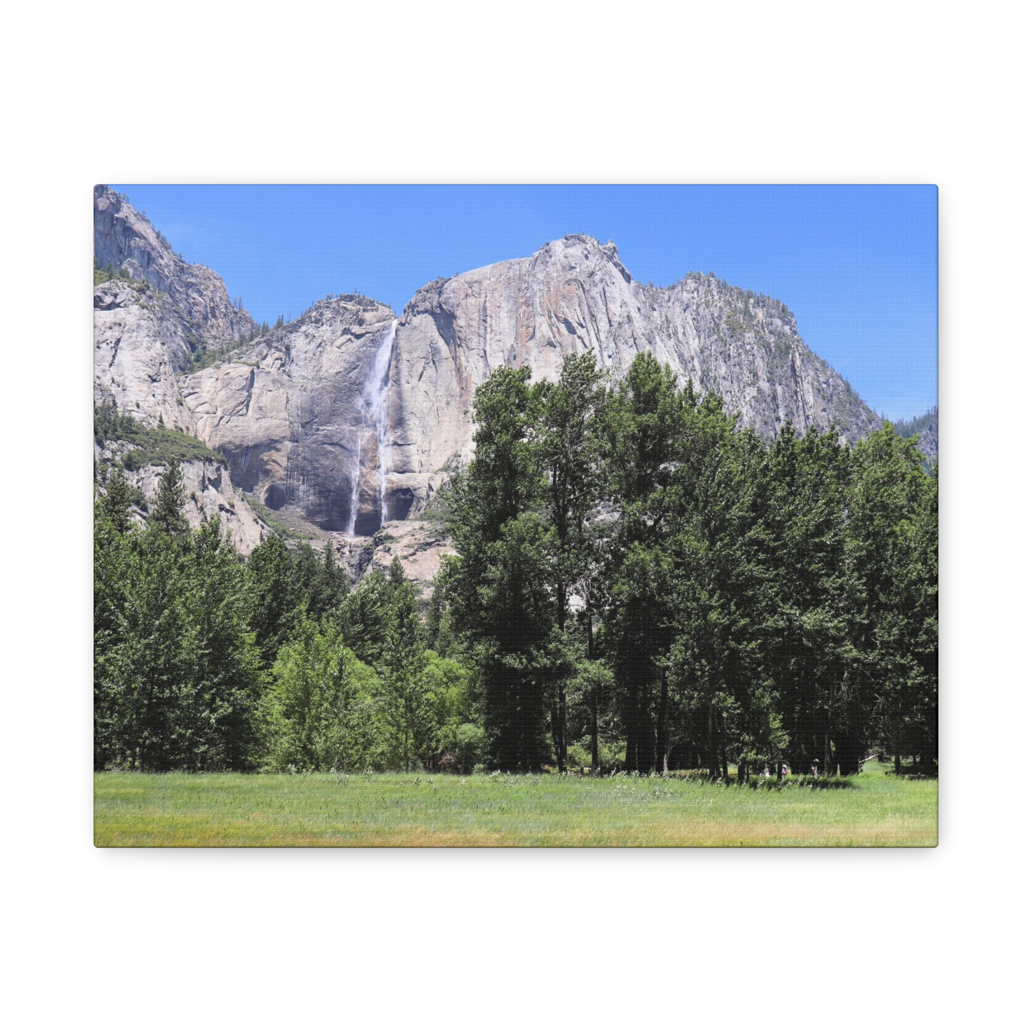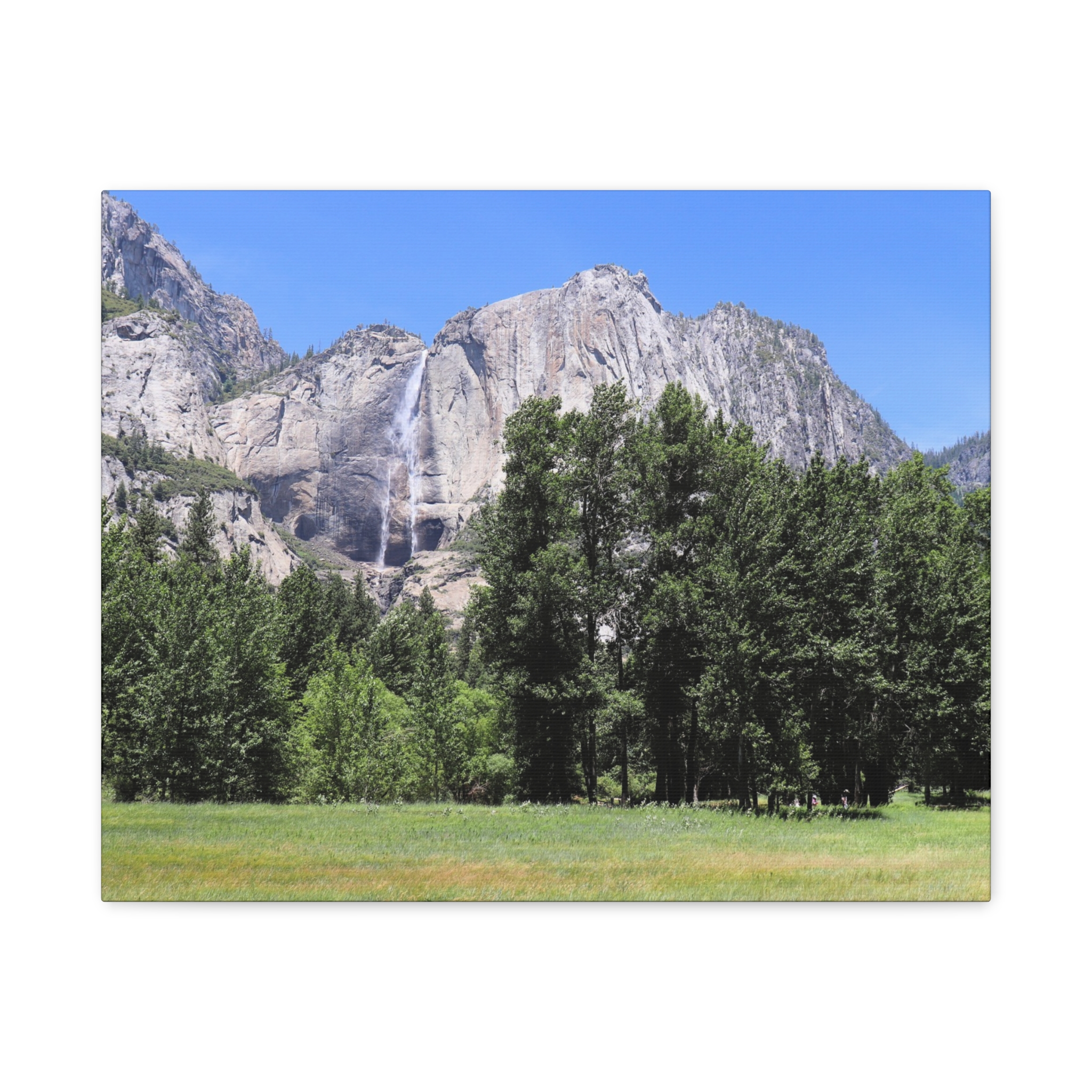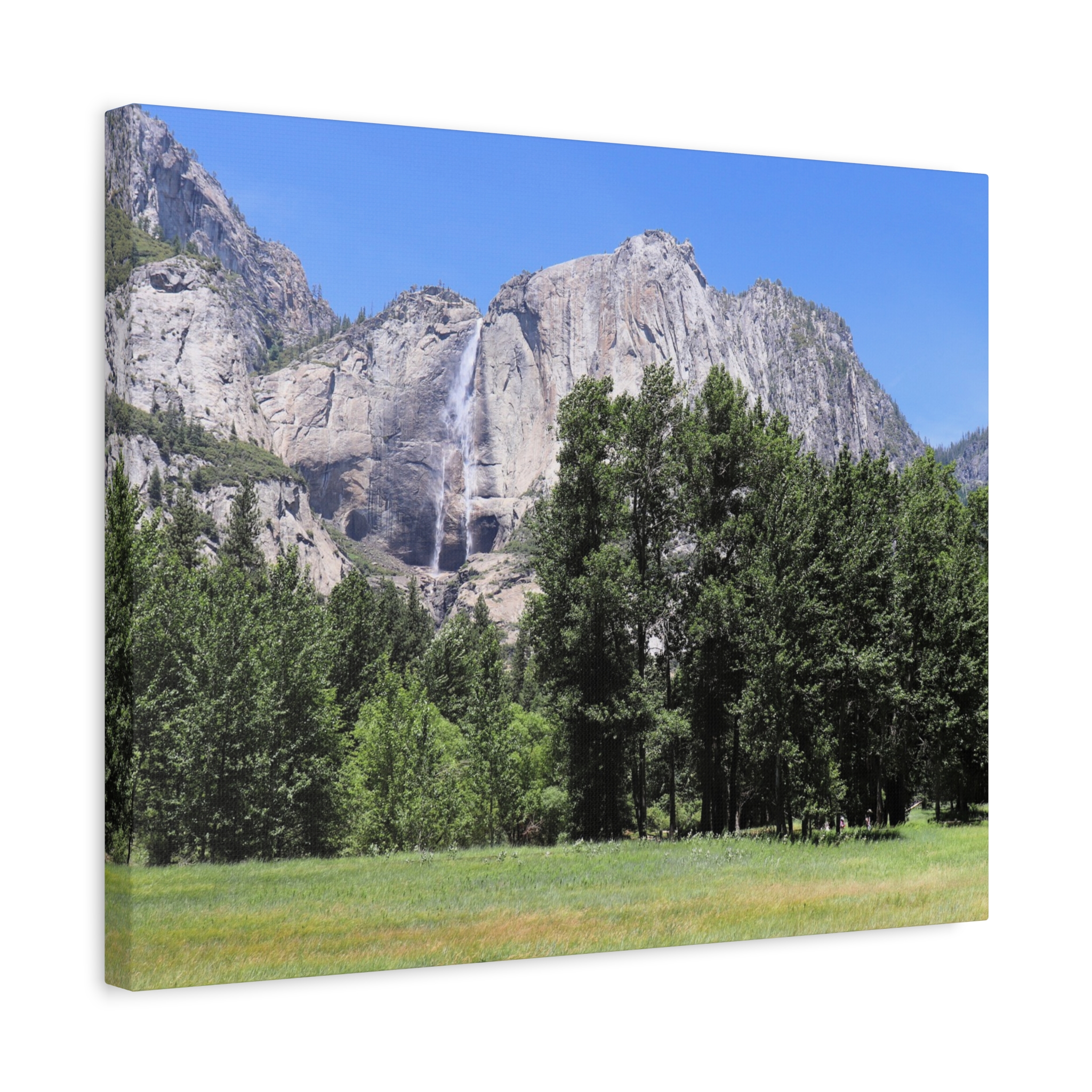 Transform your space with the serene beauty of Yosemite Falls, framed by a lush meadow and majestic pines under a brilliant California sky. This wrapped canvas print captures the waterfall’s powerful descent down rugged granite cliffs, perfectly paired with the peaceful expanse of Yosemite Valley below.