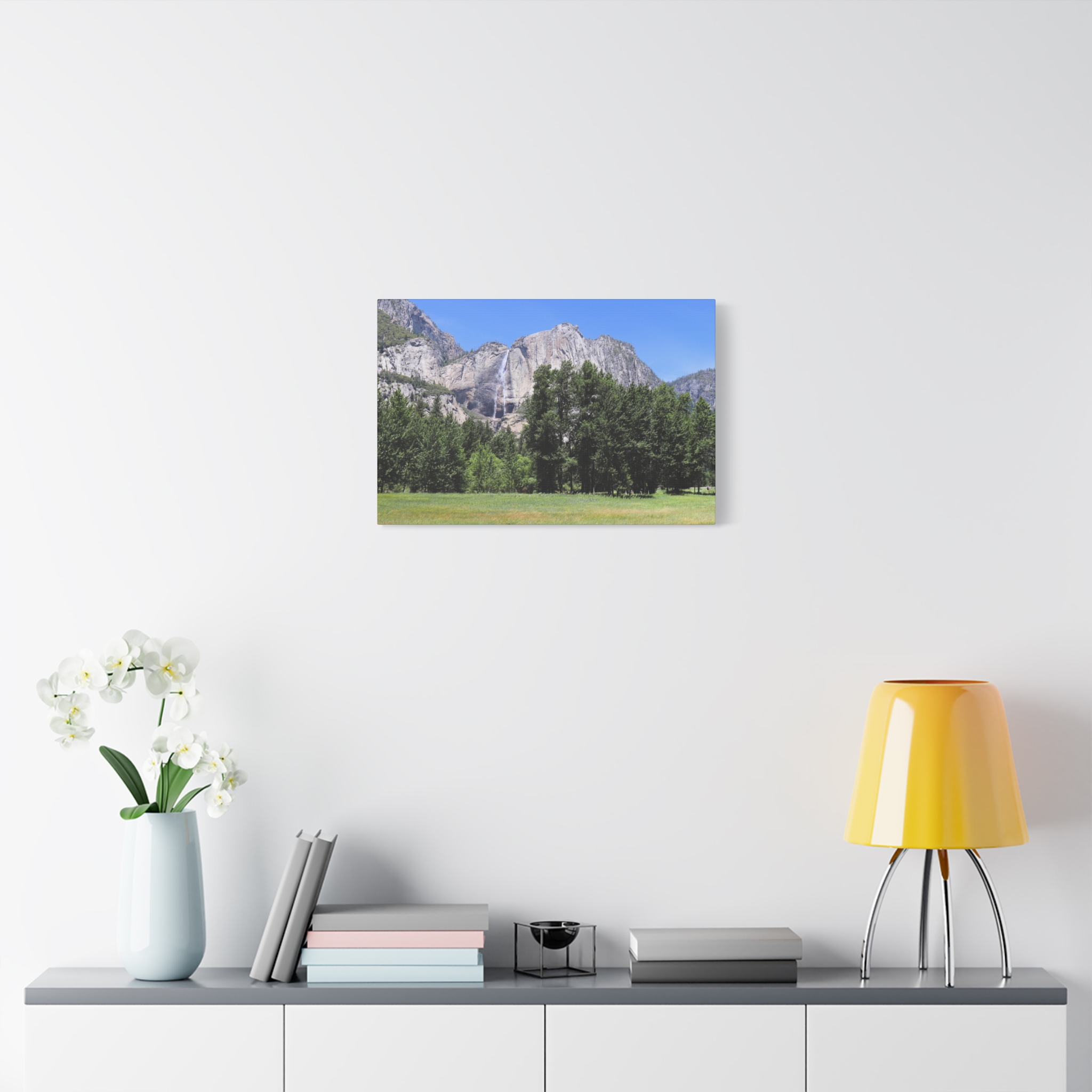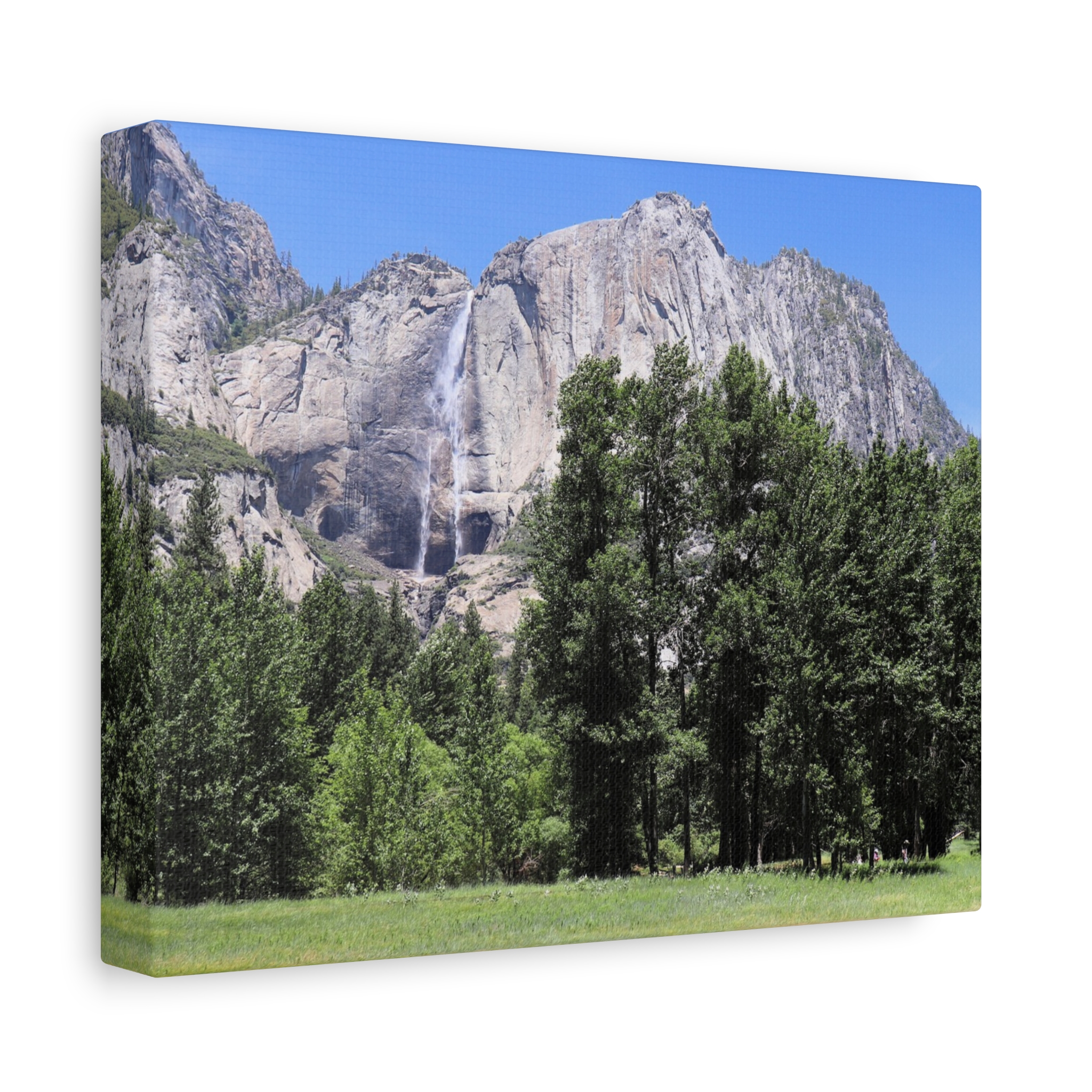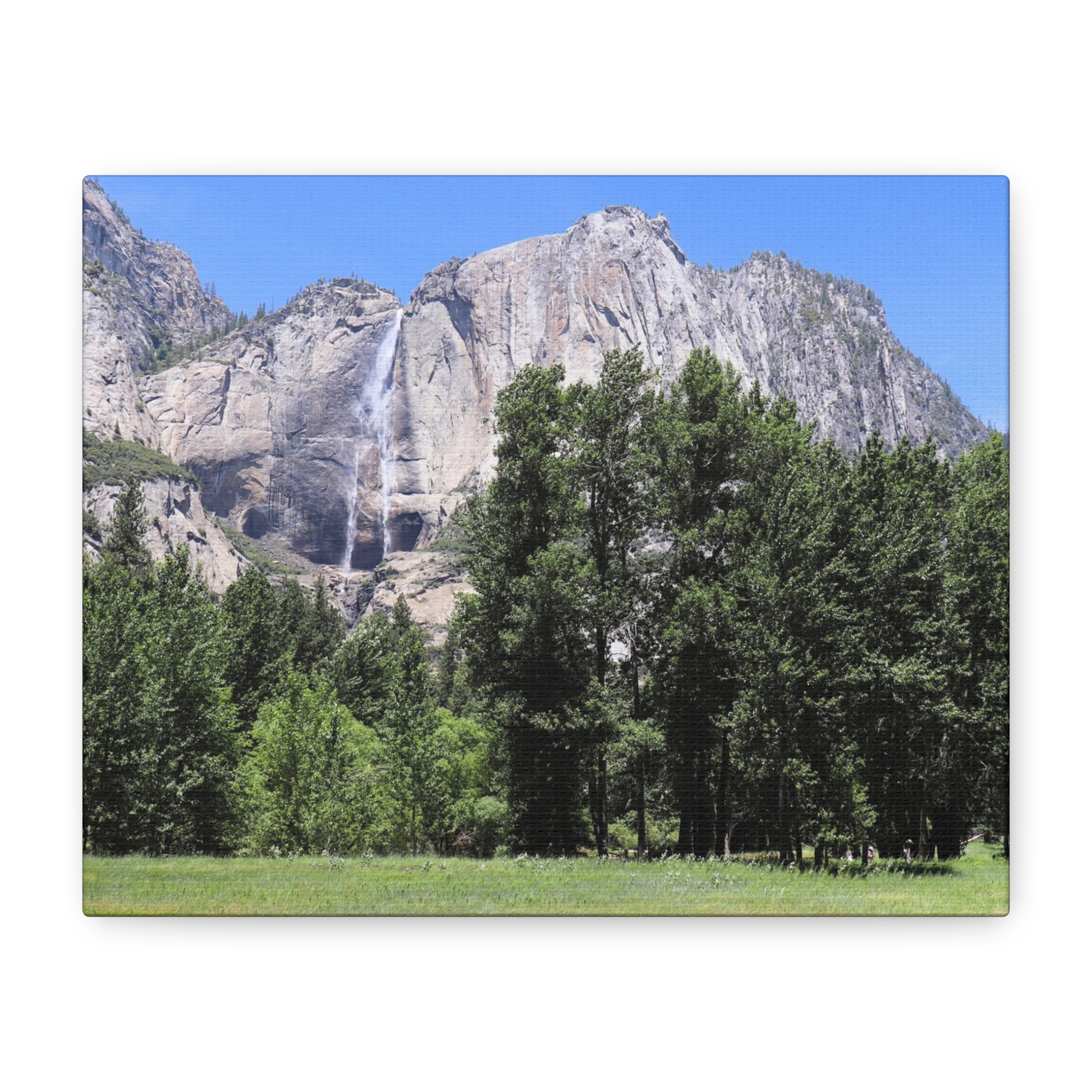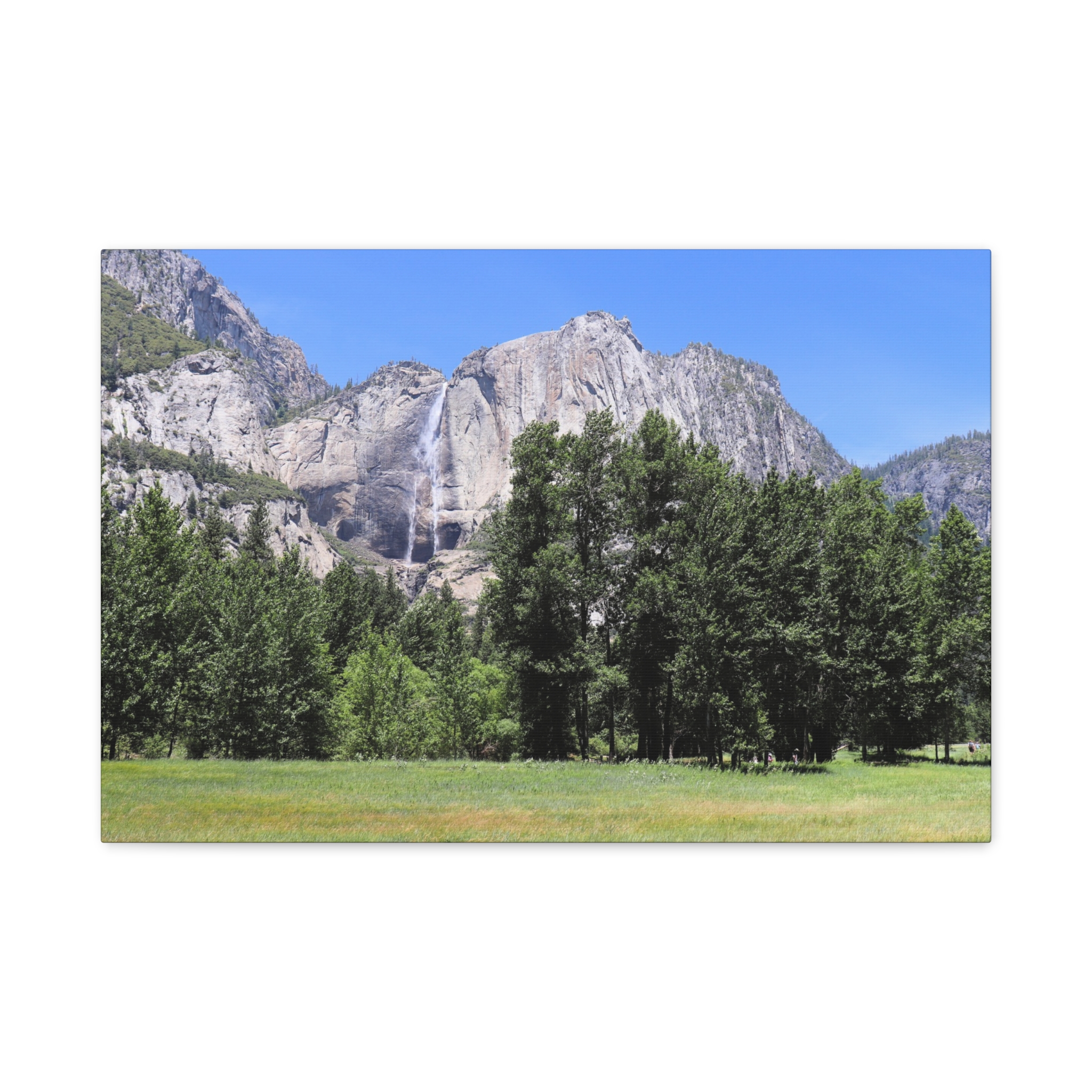 Transform your space with the serene beauty of Yosemite Falls, framed by a lush meadow and majestic pines under a brilliant California sky. This wrapped canvas print captures the waterfall’s powerful descent down rugged granite cliffs, perfectly paired with the peaceful expanse of Yosemite Valley below.